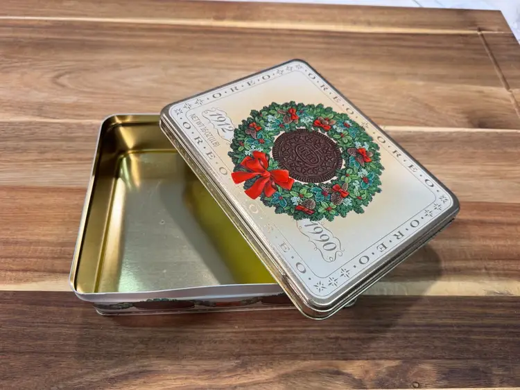 This collectable tin features a festive holiday wreath design centered around an oreo cookie, making it a perfect piece for holiday decor or a vintage snack memorabilia collection. Ideal for storing cookies, trinkets, or as a decorative display item during the Christmas season. A unigue find for oreo enthusiasts and collectors of vintage advertising.