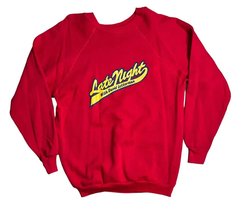 Fantastic Vintage 1990's Late Night with David Letterman Crewneck Sweatshirt - Size XL - Tultex Brand. This is a soft crewneck in excellent condition. Here are the measurements: 21 inches wide at the arm pits, by about 28.5 inches long from shoulder to hem.