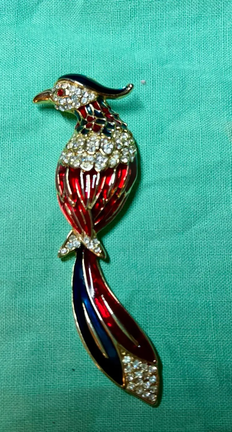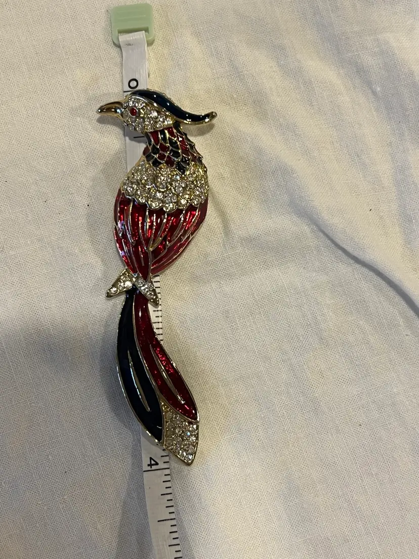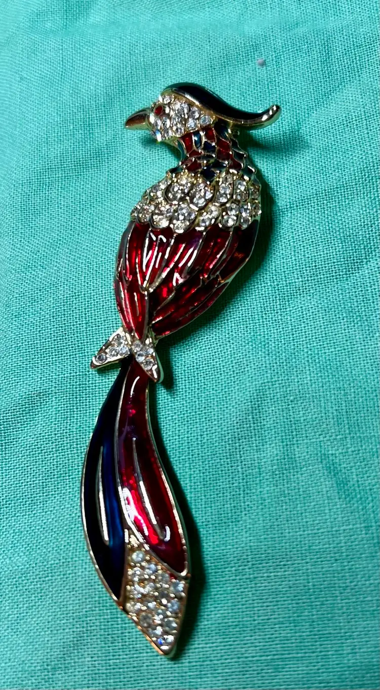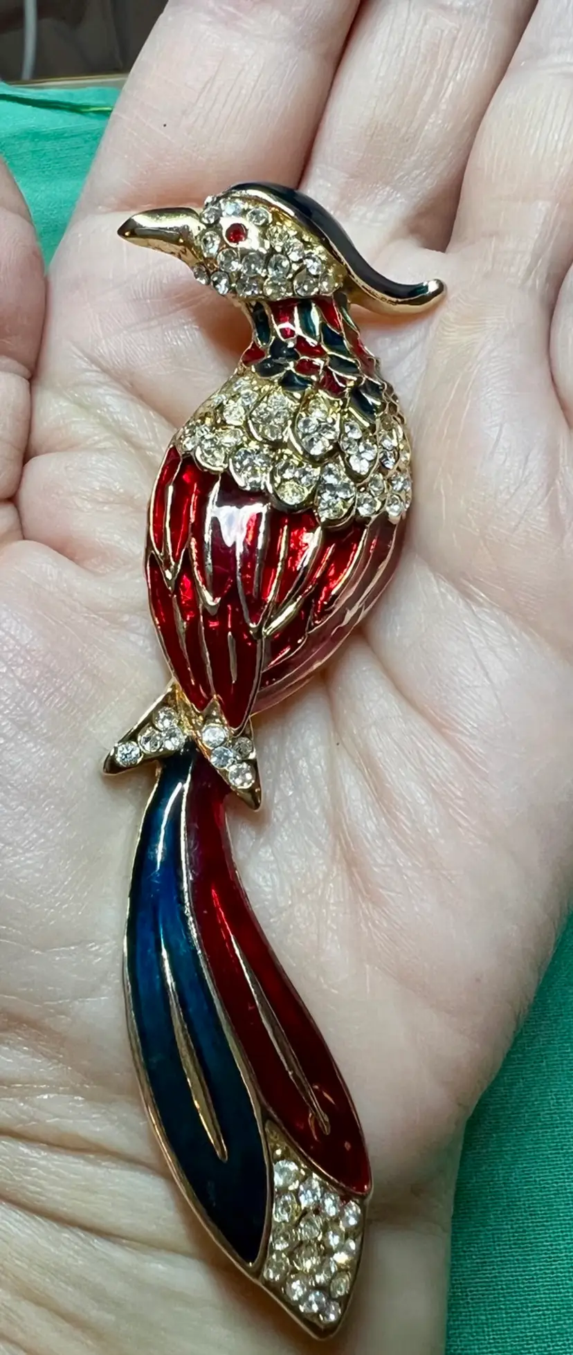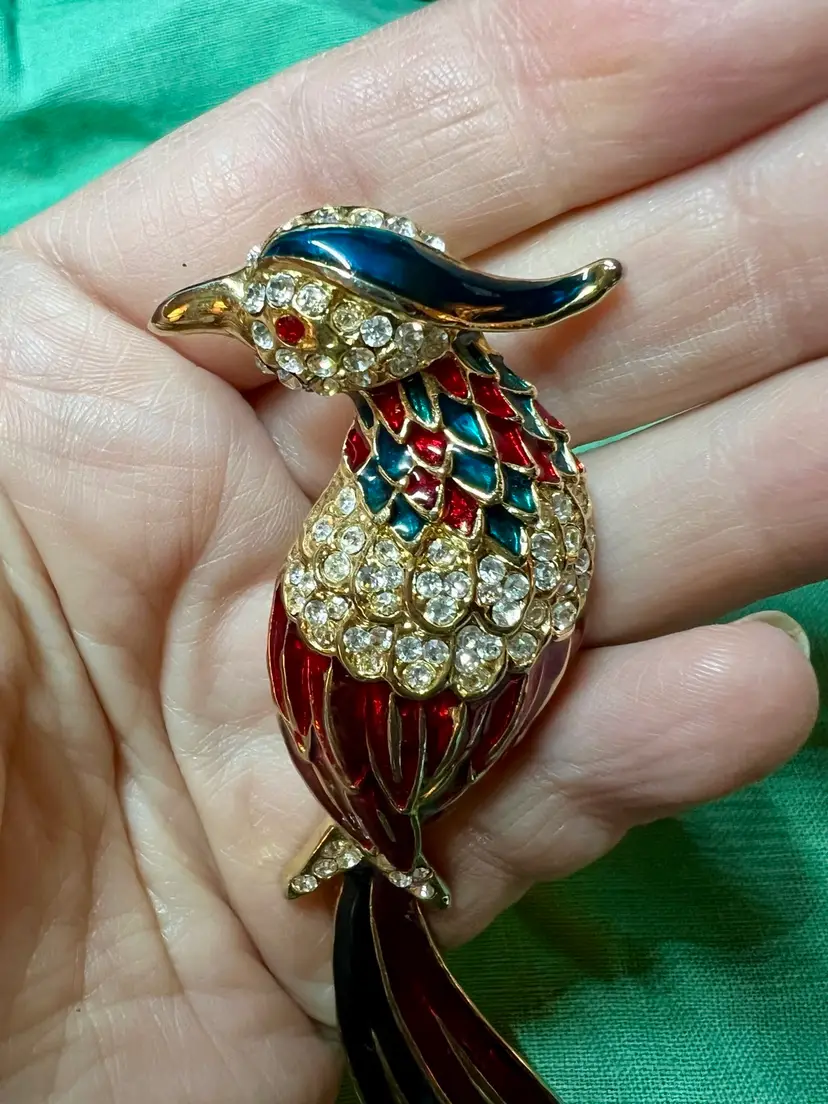 This vintage brooch from the 1990s is a stunning piece of jewelry that features a beautiful bird of paradise design. The intricate details of the brooch are highlighted by the use of red, green, and gold enamel, which complement the clear rhinestone accents perfectly. Measuring 4 inches in length, this large brooch is sure to make a statement and add a touch of glamour to any outfit.