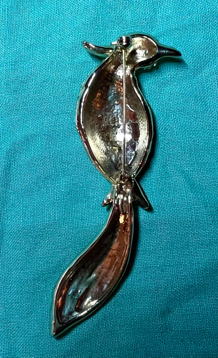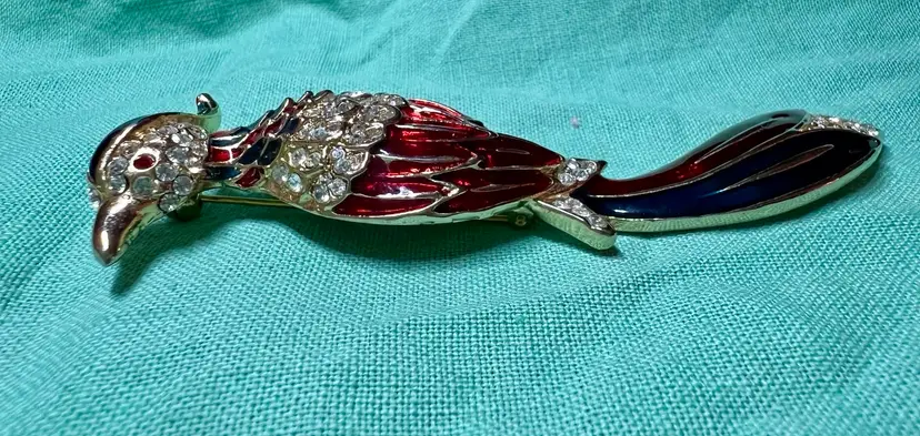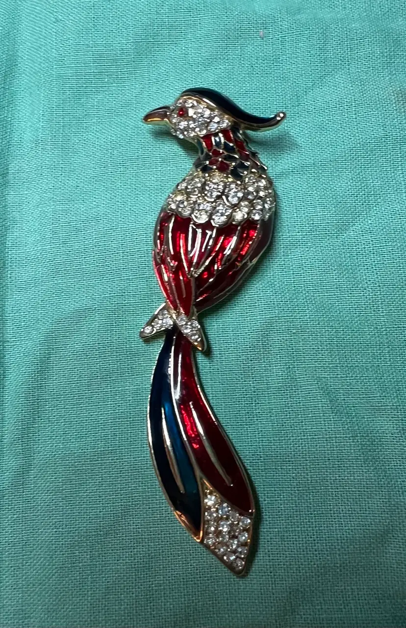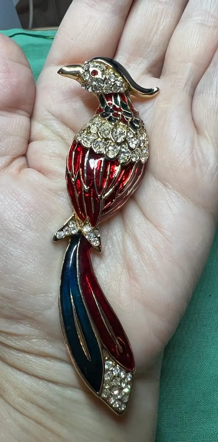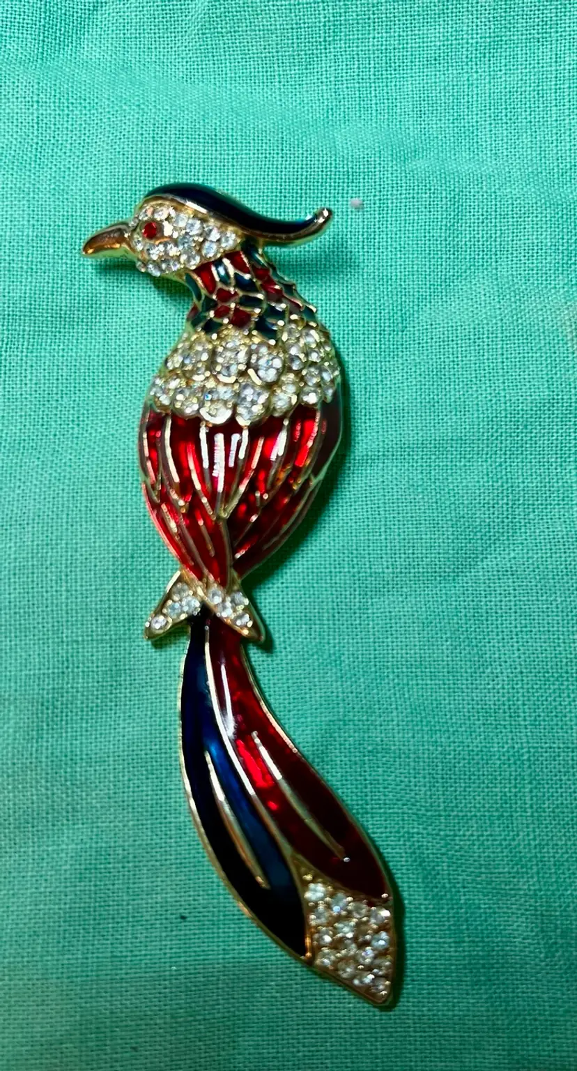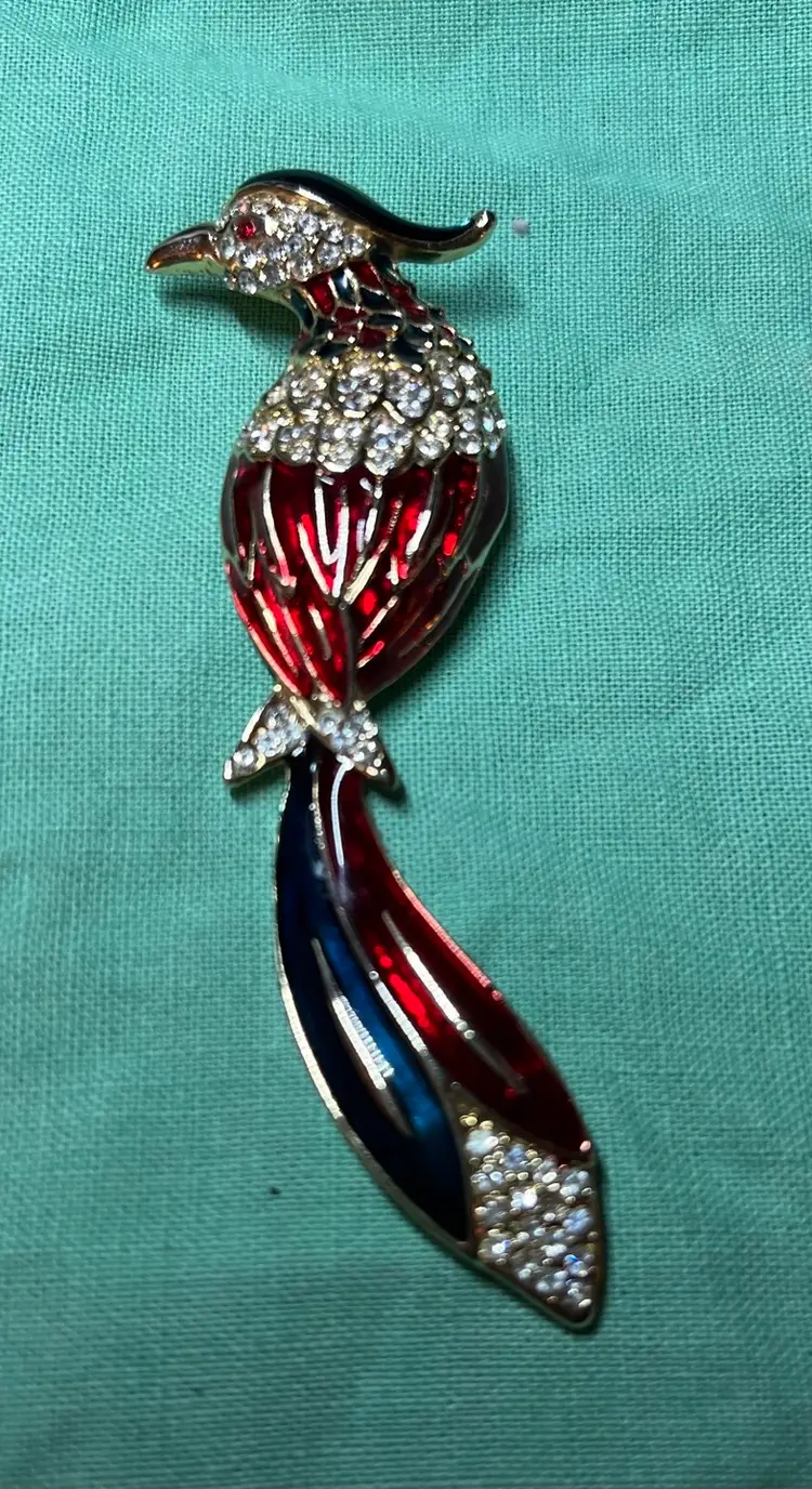 This vintage brooch from the 1990s is a stunning piece of jewelry that features a beautiful bird of paradise design. The intricate details of the brooch are highlighted by the use of red, green, and gold enamel, which complement the clear rhinestone accents perfectly. Measuring 4 inches in length, this large brooch is sure to make a statement and add a touch of glamour to any outfit.