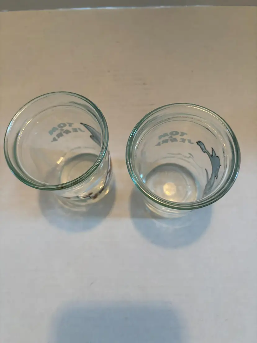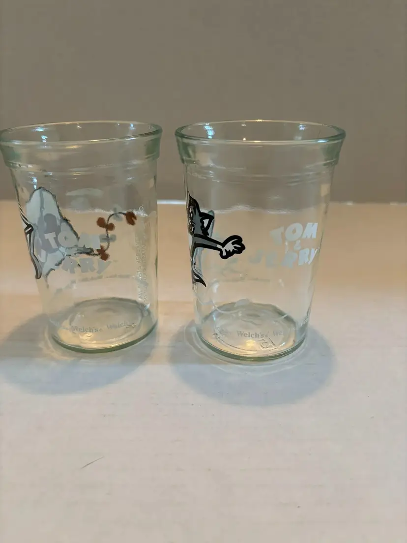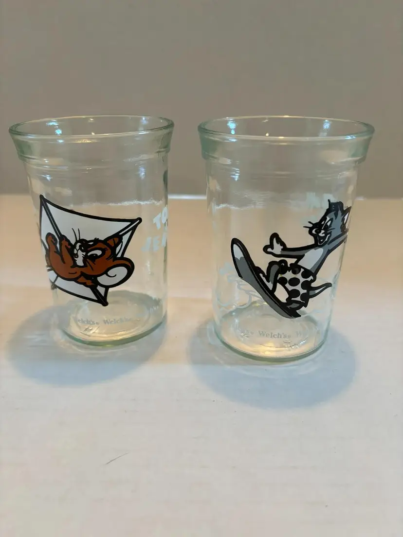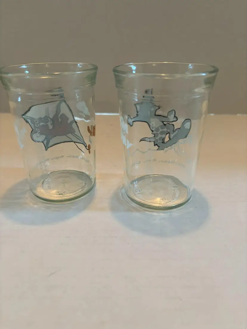This pair of jelly jars features Tom and Jerry. These will take you back to the summer of peanut butter and jelly sandwiches made and grandma's house. Each glass is 4in tall X 2 3/4in wide.