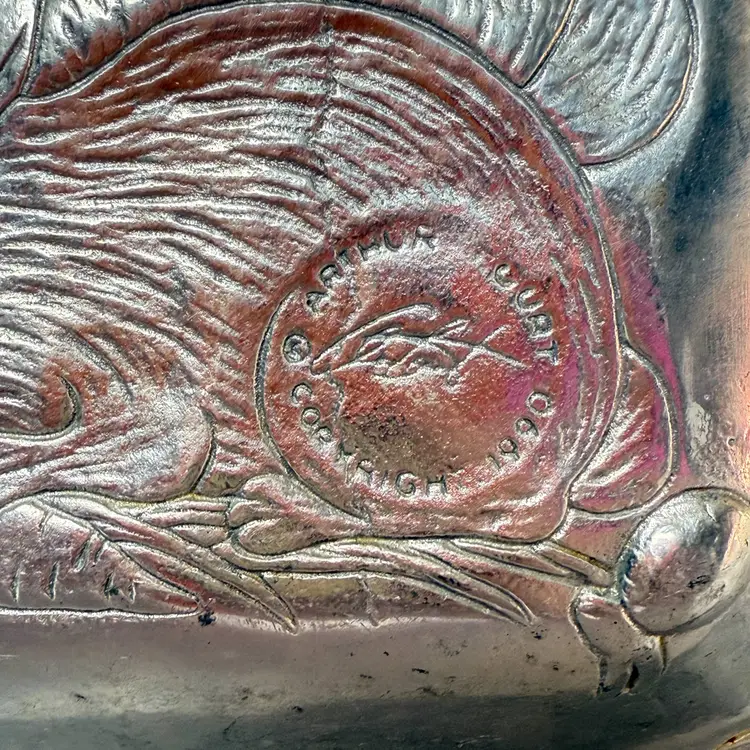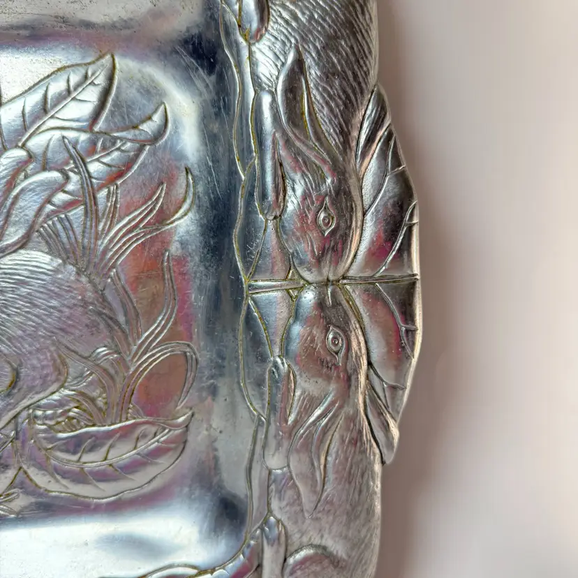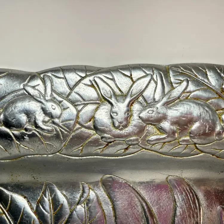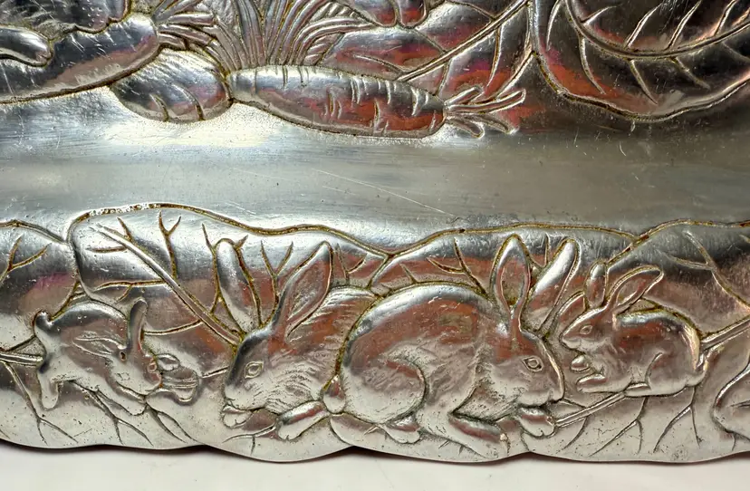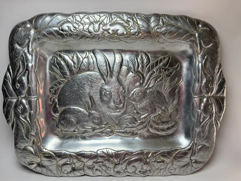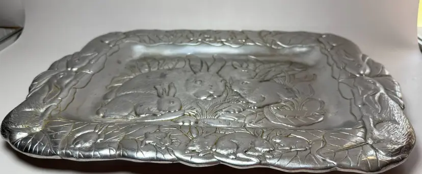 Vintage 1990 XL Arthur Court Bunny Rabbit Garden Friends Aluminum Serving Tray. Beautiful! Rabbits in the garden with leaves and carrots. 18" long x 13" wide. Heavy. Good condition. Light surface wear.