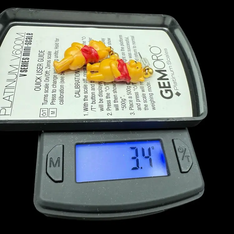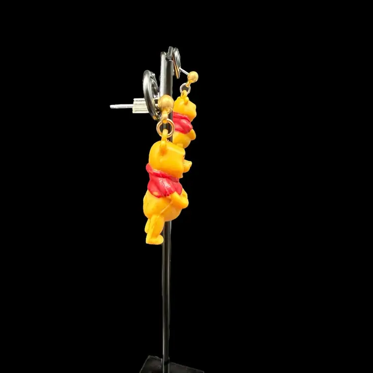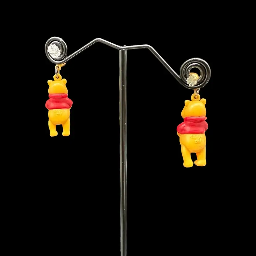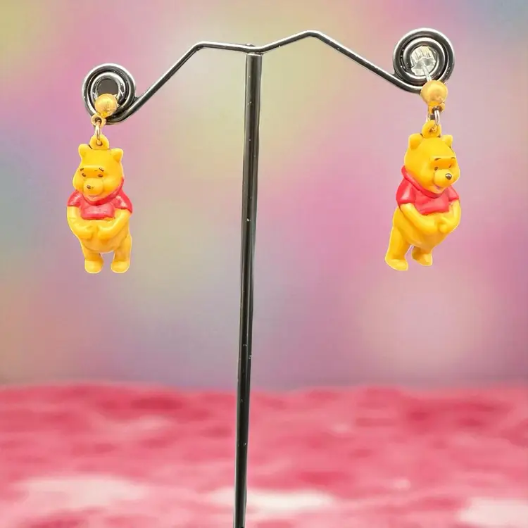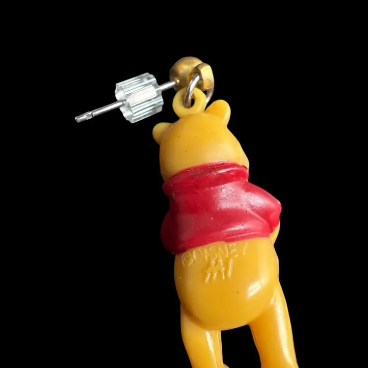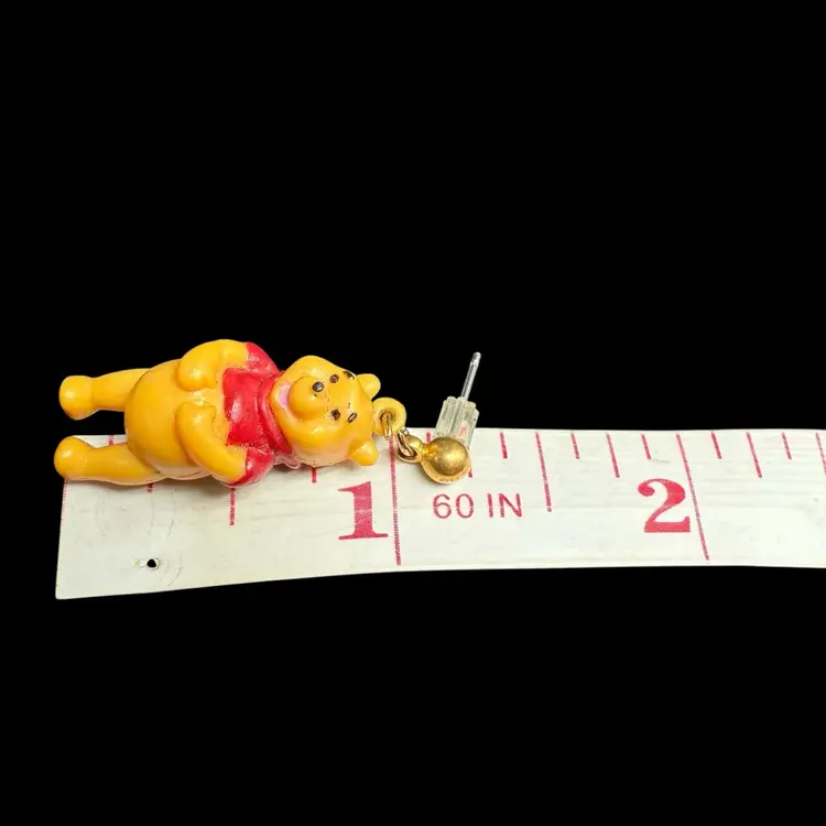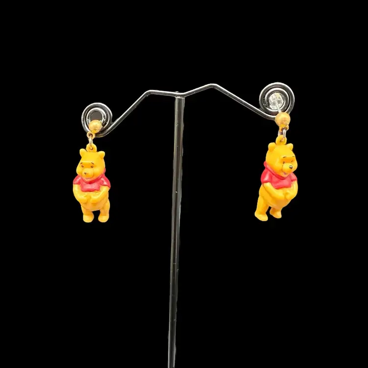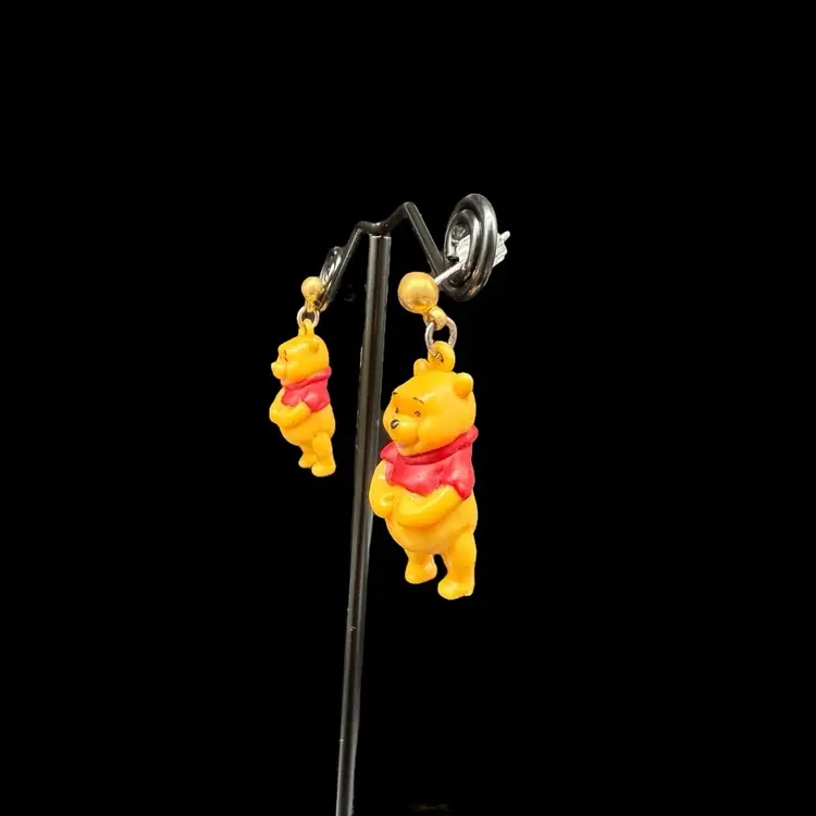 These vintage 1990s Disney Winnie The Pooh Bear dangle drop post earrings feature the beloved character from the Winnie the Pooh franchise by Disney. Made of plastic, these earrings are a charming collectible piece for fans of Disneyana. The design captures the nostalgia and whimsy associated with the classic Disney cartoon series from the 1990s, making them a delightful addition to any jewelry collection.