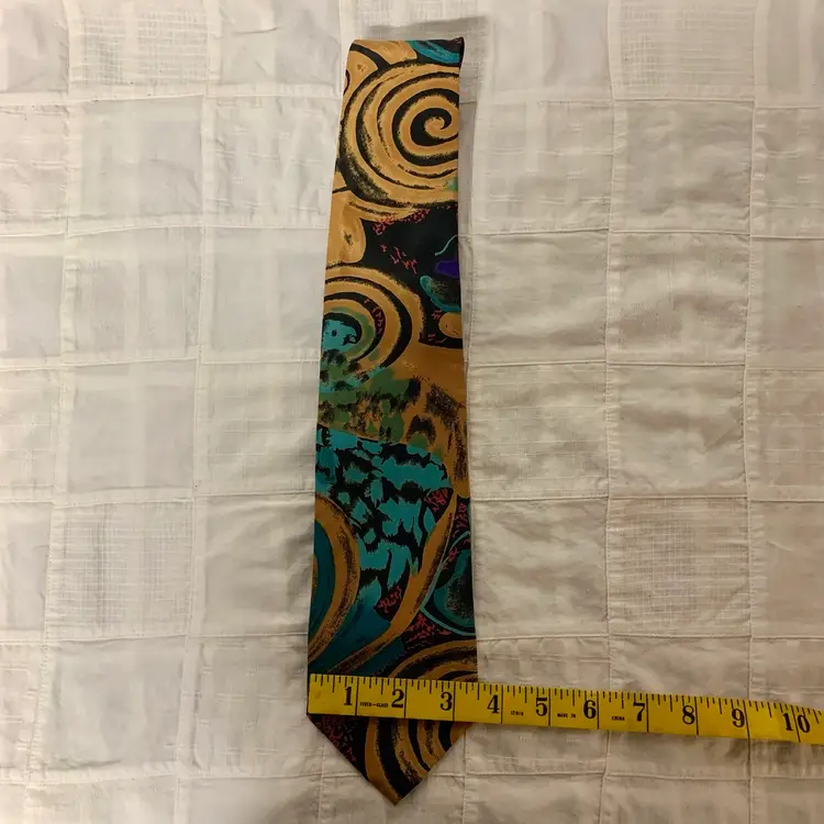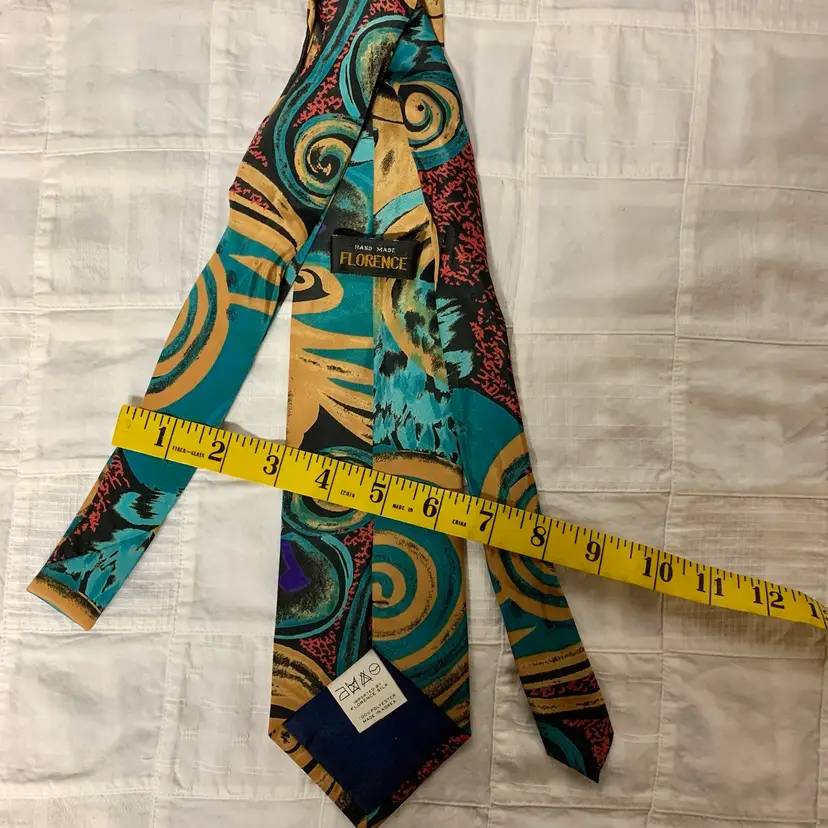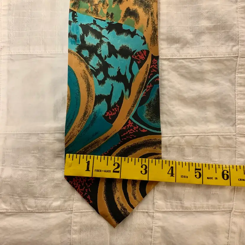 I have tried to photograph all sides of this tie, including with a tape measure to indicate width. It is 57” from tie end to tie end.