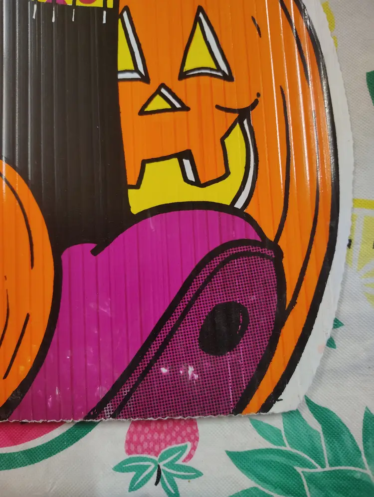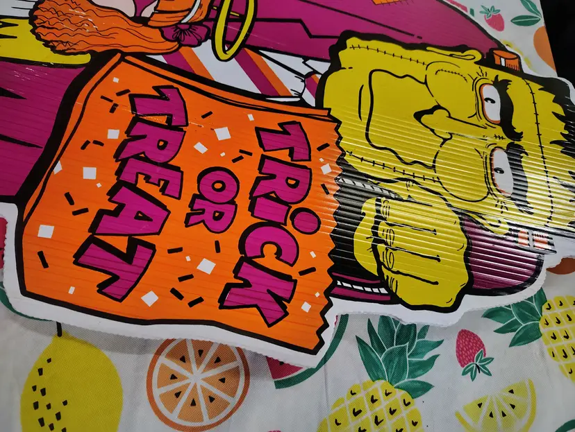Vintage 1990s Frankenstein Trick Treat Girl Pumpkin Halloween Yard Sign Decor. In good condition with some marks and a slight curve at the top as shown in photos. Metal stake included. This could be used indoors or outdoors. Measures 27” H x 14” W. Shipping is based on its large dimensions and custom packaging.