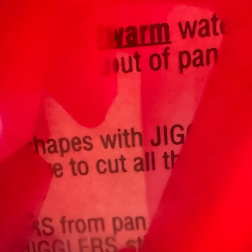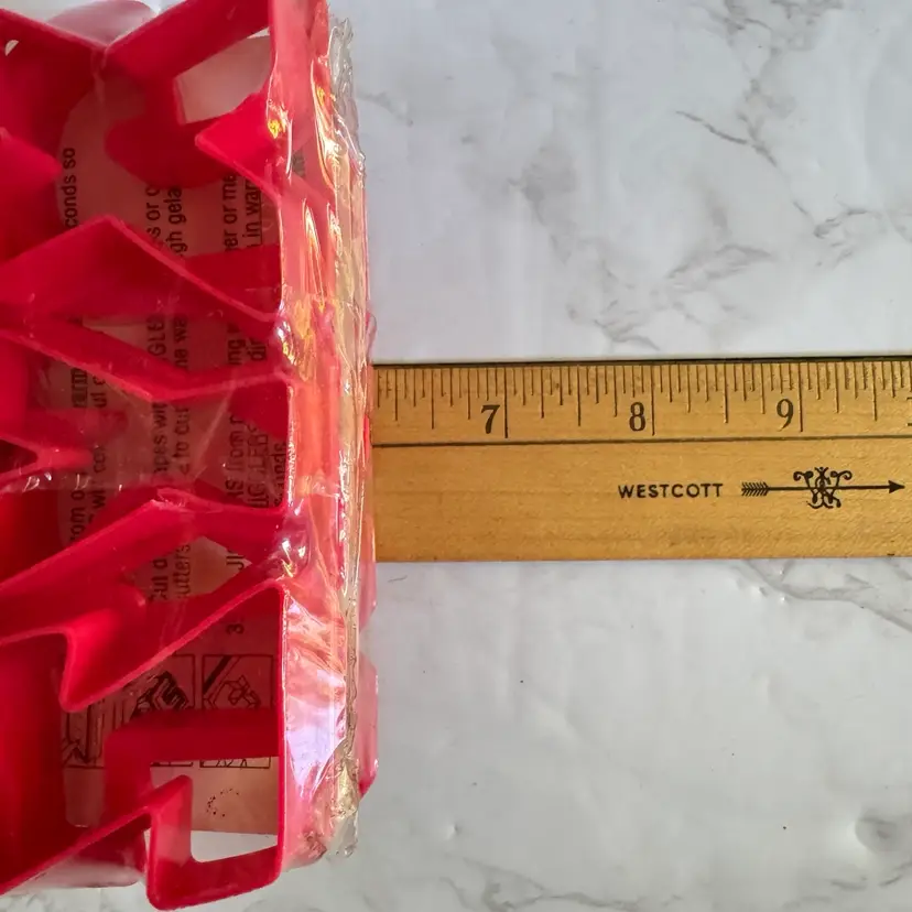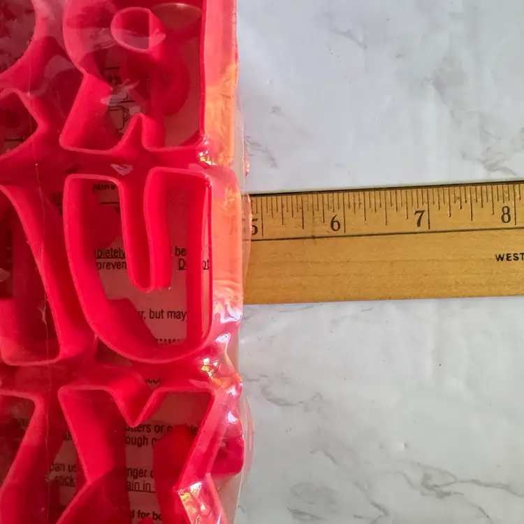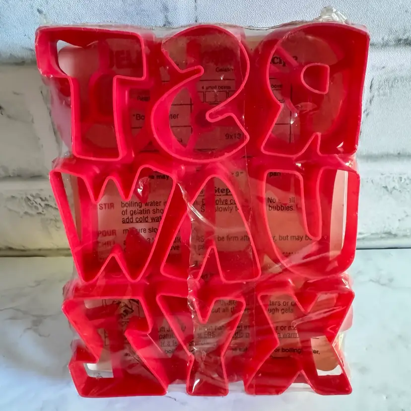 This is a set of Vintage 1990s Jell-O Jigglers Alphabet ABC Shape Cutters, featuring a classic alphabet pattern and small size for cutting Jell-O, cookies, or fondant. Made of durable plastic material with a red color, these cookie cutters are perfect for all occasions and can add a fun and nostalgic touch to your baking projects. With a theme centered around numbers and letters, these Jigglers cutters are a unique and playful addition to any kitchen or baking supplies collection. New old stock in original package. Letters are roughly 2”h.