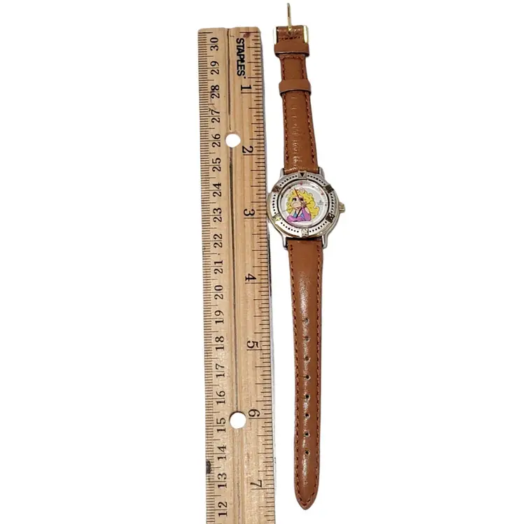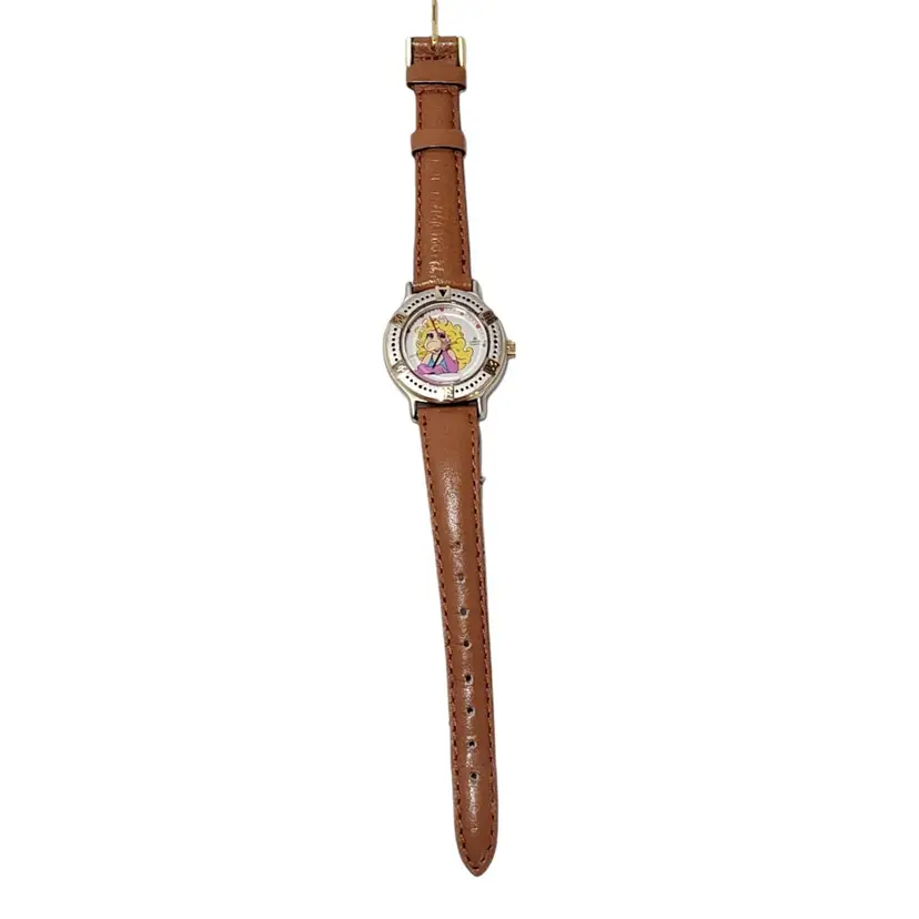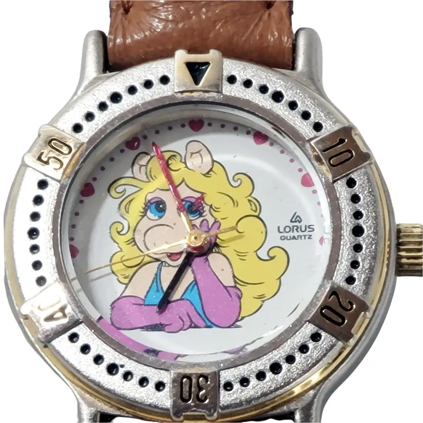 – Year Manufactured: 1990-1999 – Vintage: Yes – Brand: Lorus – Case Color: Gold, Silver – Type: Wristwatch – Department: Women – Band Color: Brown – Band Material: Leather – Dial Color: White – Model: Lorus Miss Piggy – Watch Shape: Round – Style: Casual, Dress/Formal – Features: 12-Hour Dial, Water-Resistant – Display: Analog