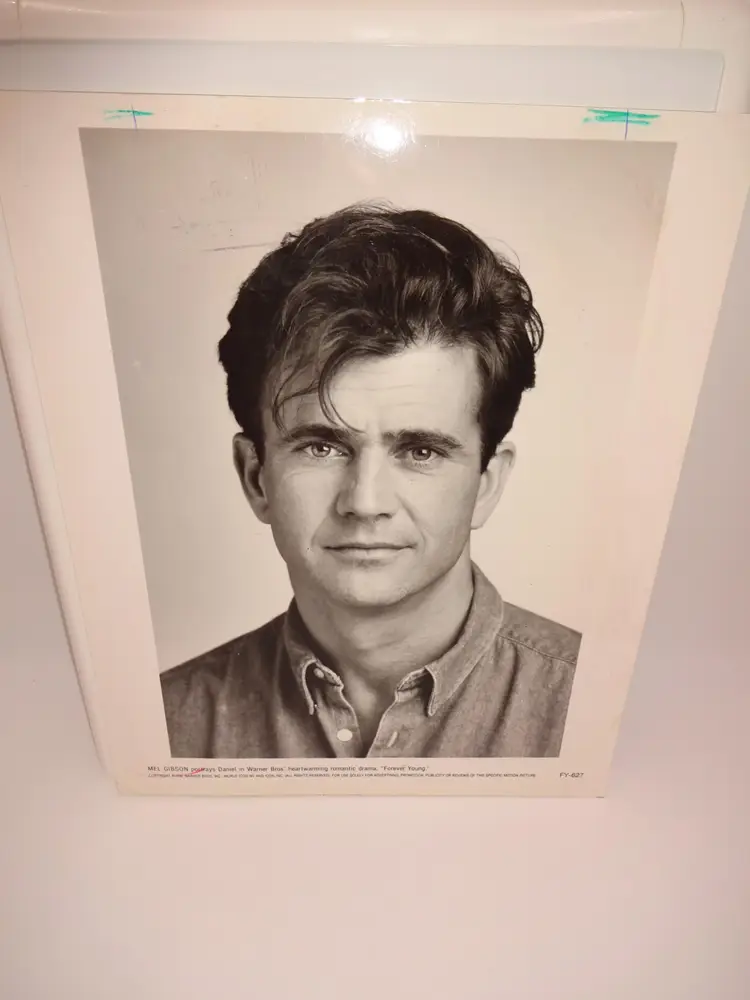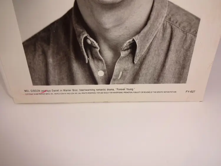Good pre-owned condition. 8" x 10" photo of Mel Gibson as Daniel from the movie "Forever Young". Marks, corner creases and light stains.