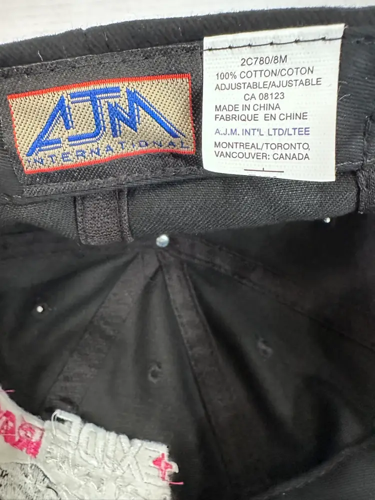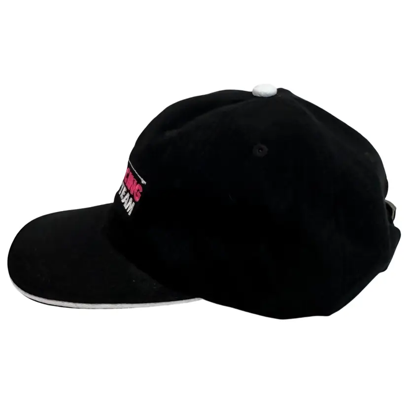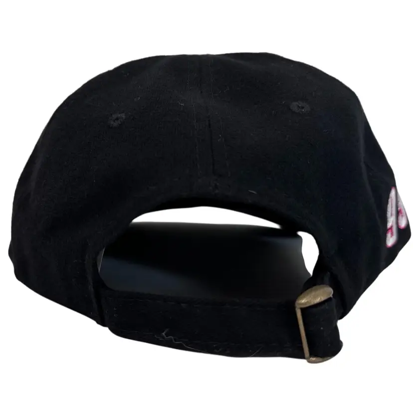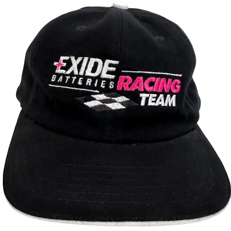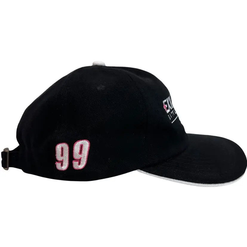 NWOT This Vintage 1990's NASCAR #99 Jeff Burton Exide Batteries Racing Team Adjustable Hat is a collectible item perfect for fans of NASCAR and Jeff Burton. The hat features a unique black and pink color scheme with the AJM International brand logo. It is designed for unisex adults and is one size fits all, making it a versatile accessory for any NASCAR enthusiast looking to show their support for Jeff Burton and Roush Fenway Racing.