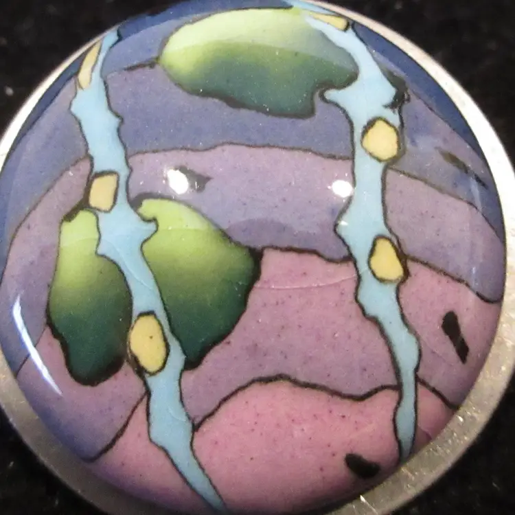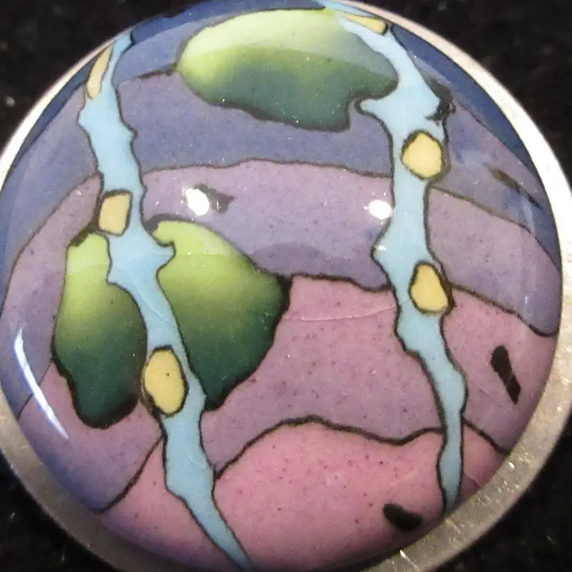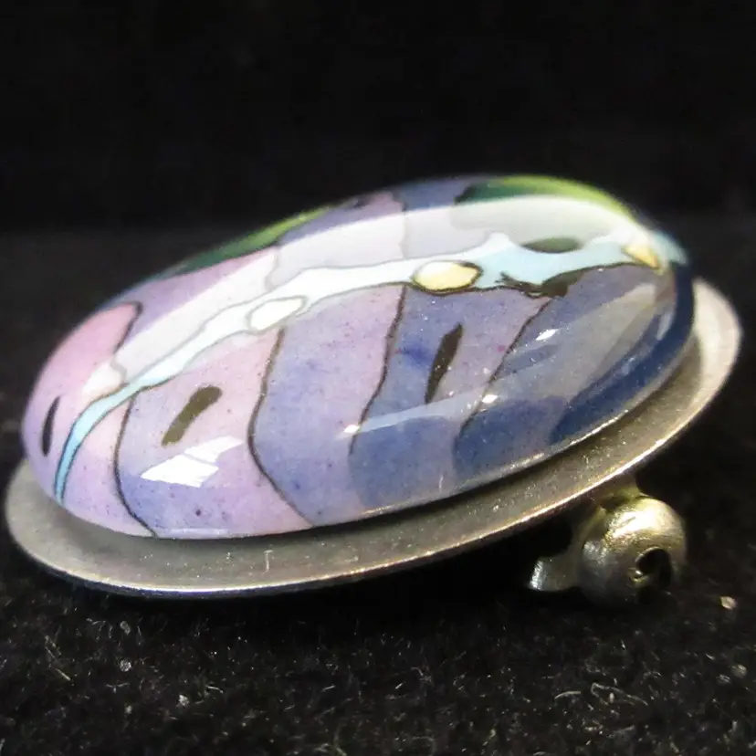 This is an ELEGANT round silver tone metal and colored enamel domed brooch. The enamel has an ombre purple background with blue, green and yellow abstract designs. The pin is domed on a flat silver tone back. It is about 1 inch in diameter. It has a pin back with a sliding C closure.