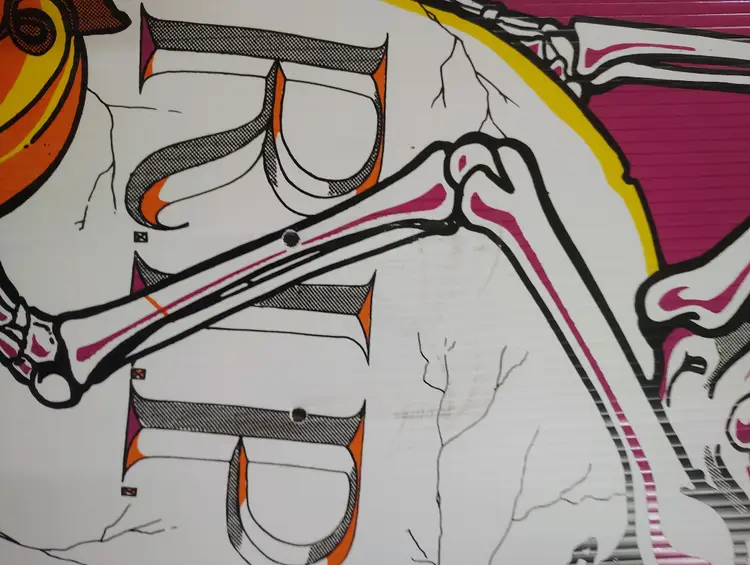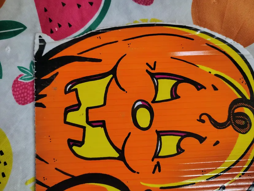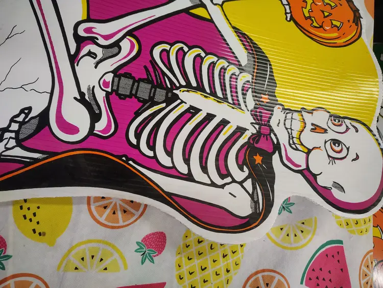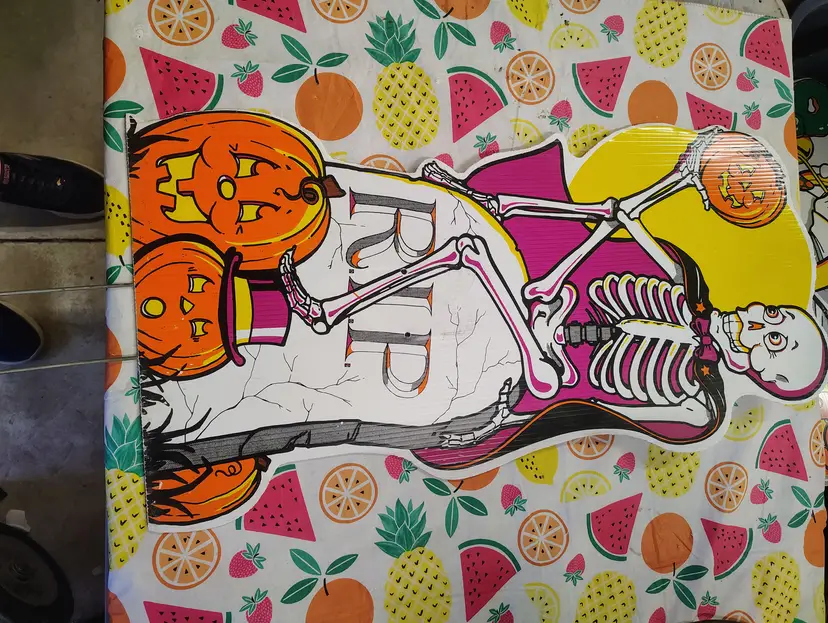 Vintage 1990s Skeleton Tombstone Pumpkins Halloween Yard Sign Art Party Decor. In good condition with some marks and a slight curve at the top as shown in photos. Metal stake included. This could be used indoors or outdoors. Measures 27” H x 14” W. Shipping is based on its large dimensions and custom packaging.