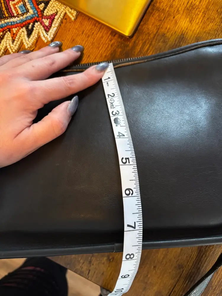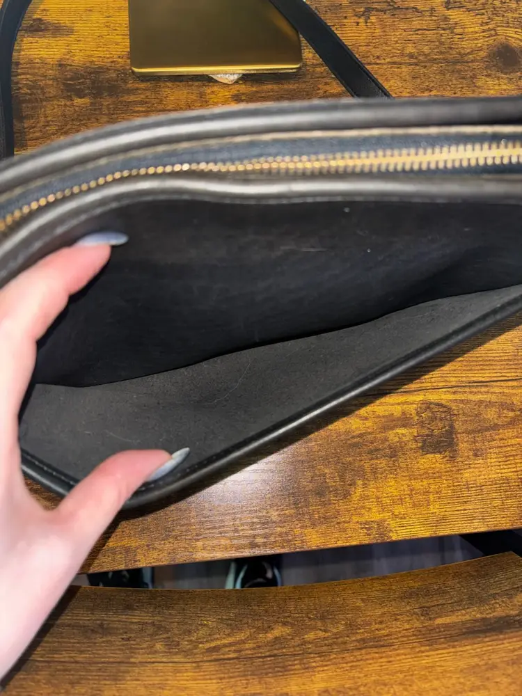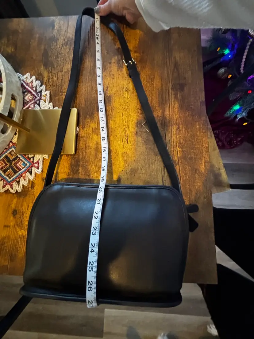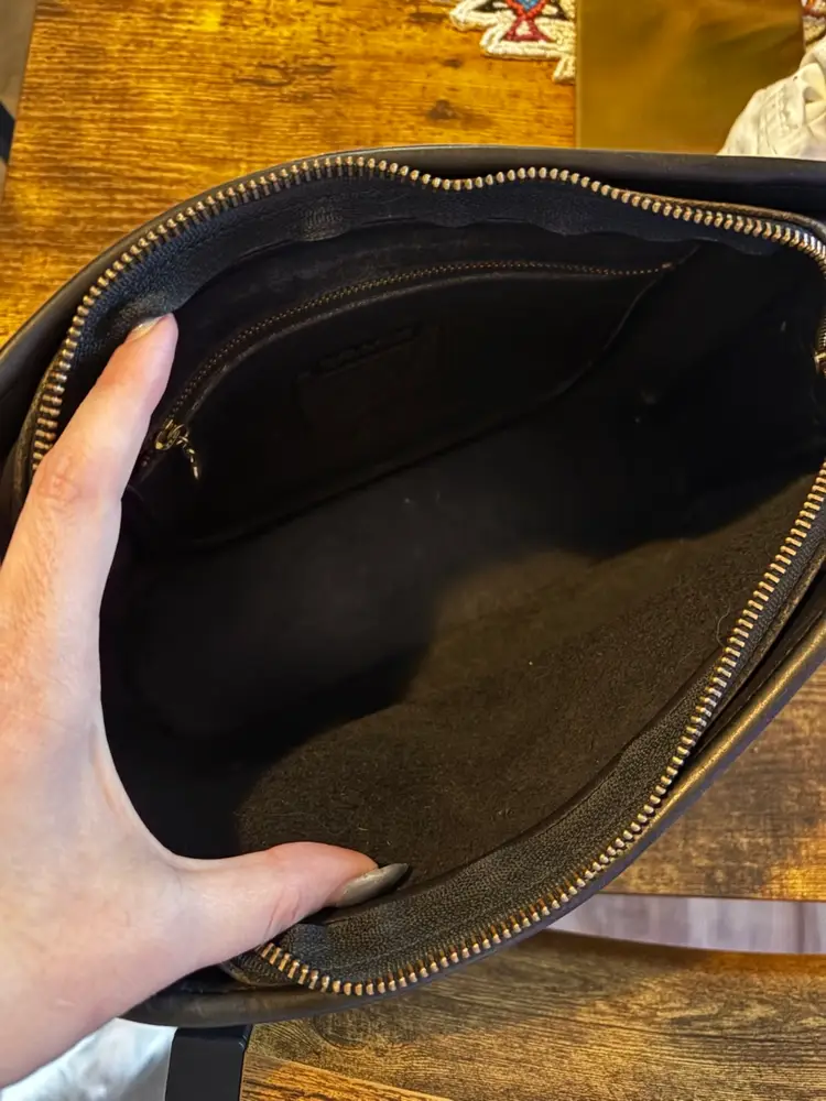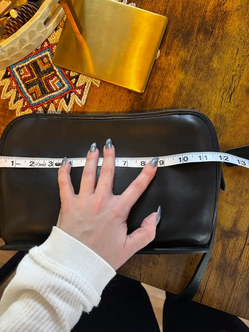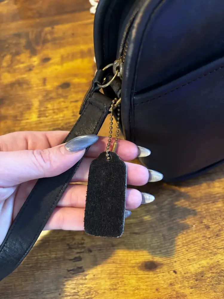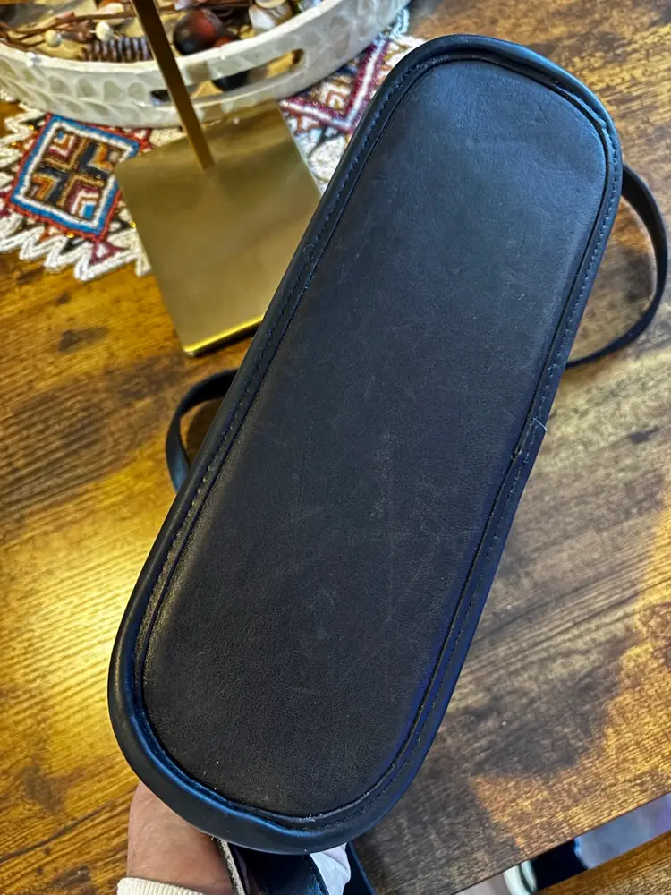 The structured black leather has aged beautifully with light surface wear and natural markings consistent with vintage Coach leather. Interior is clean, zipper runs smoothly, and the adjustable strap allows for comfortable crossbody wear.