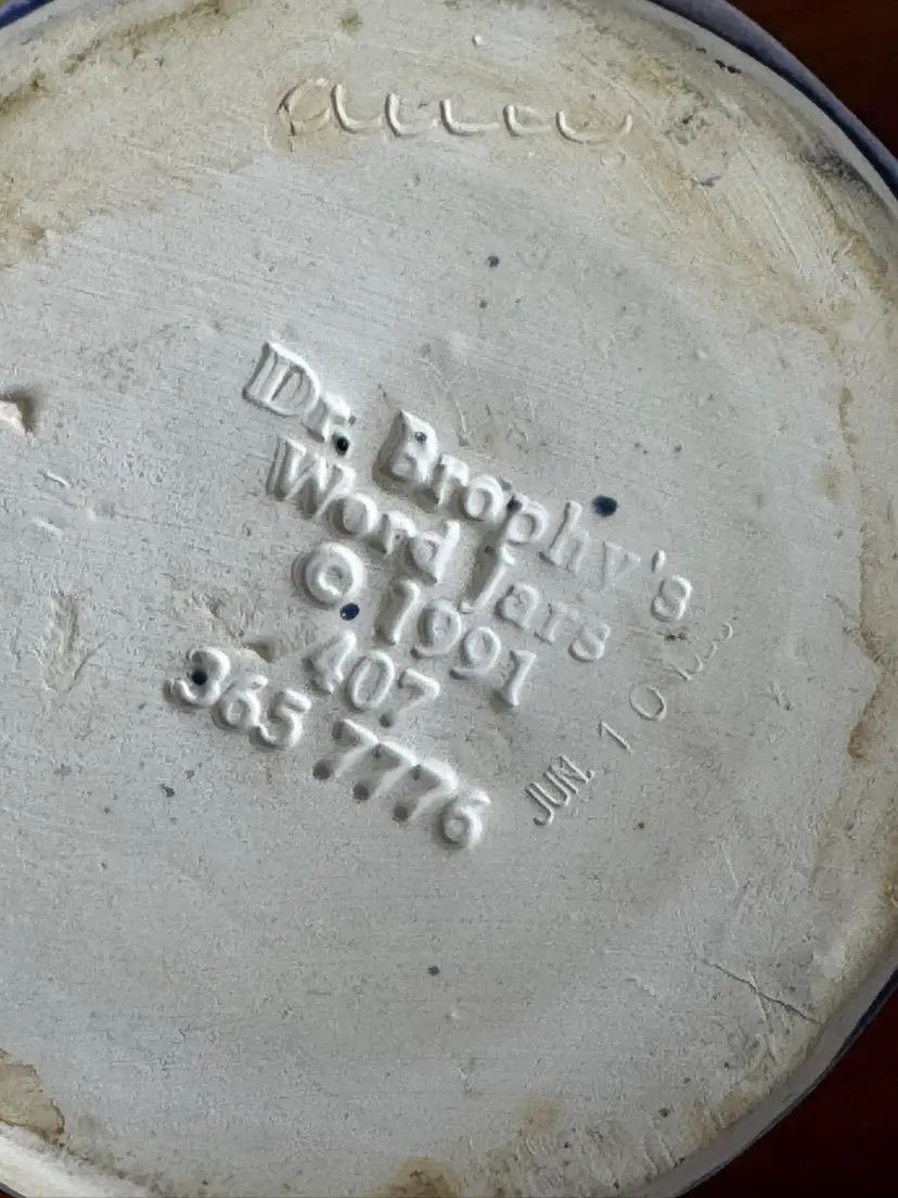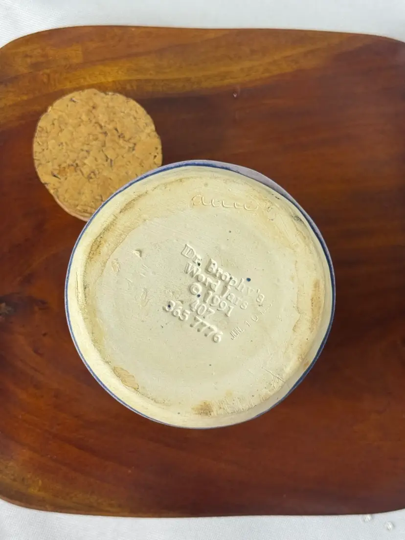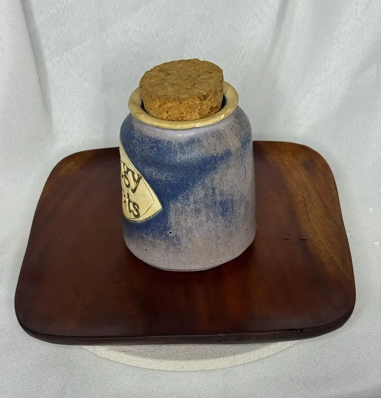 Add a touch of vintage charm to your home decor with this 1991 Dr. Brophy’s Word Jar- Doggy Treats. This stoneware jar comes with its cork lid and is melted in the bottom. It is 5.5” tall with a 4” diameter at the base. Perfect for any dog lover!