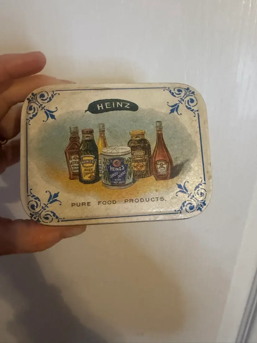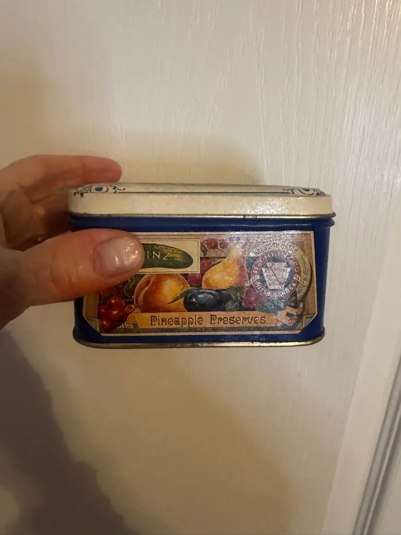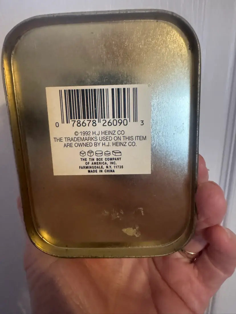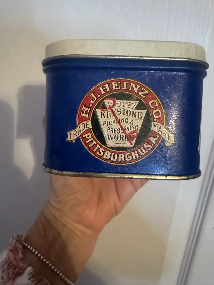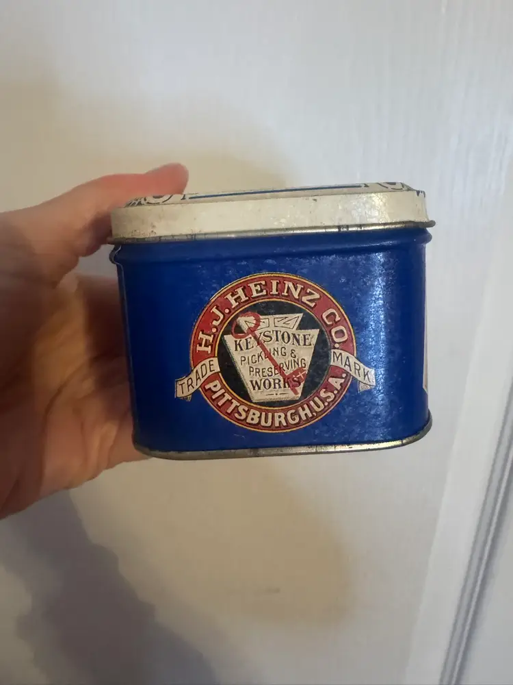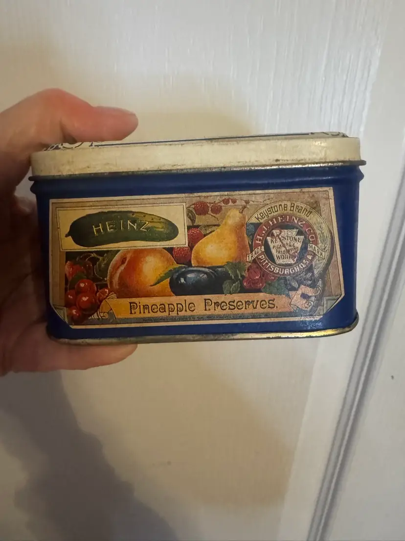 The Keystone trademark noted on the side of the tin is a reference to Pennsylvania's nickname, "The Keystone State". This tin was used for Heinz pineapple preserves.