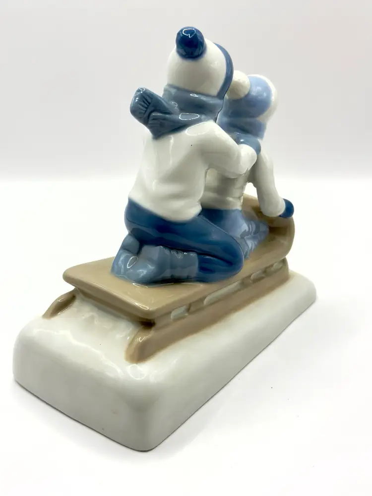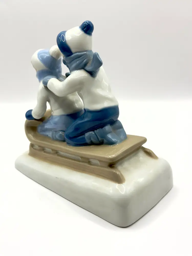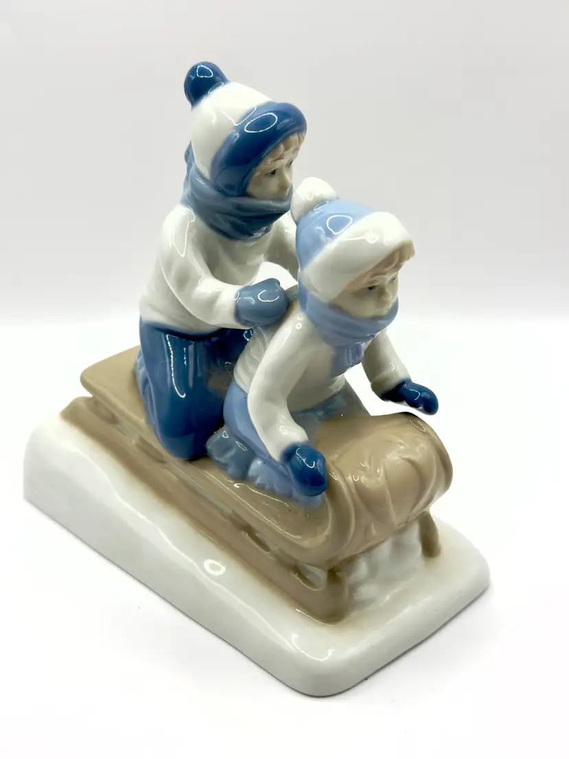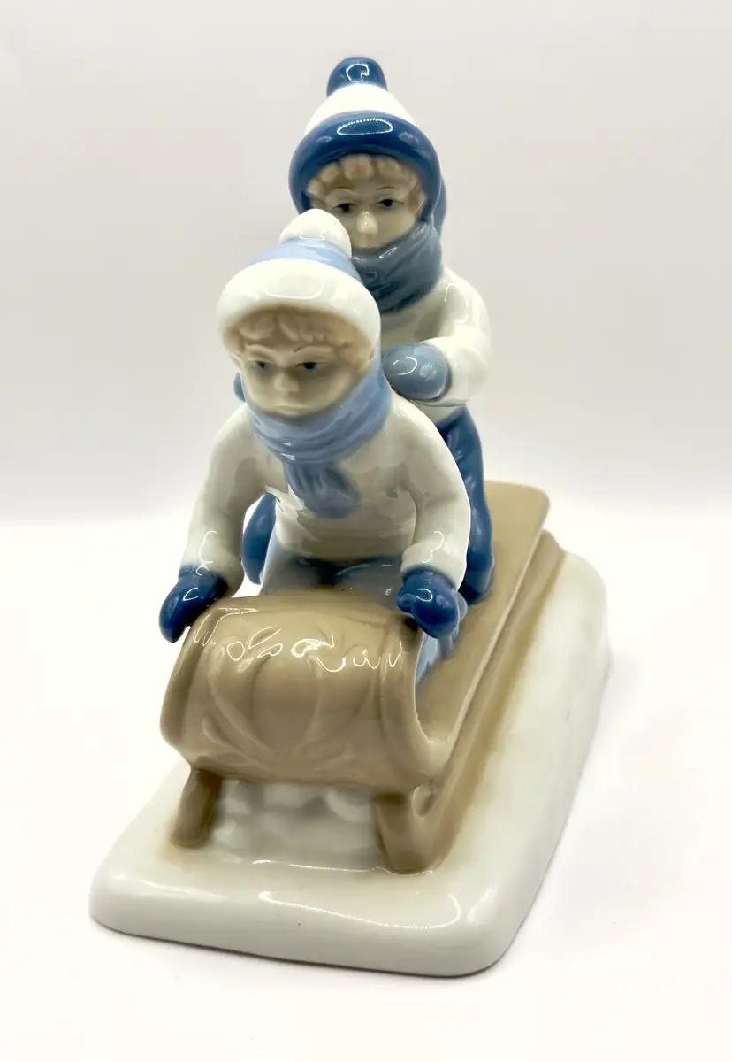 Capture the joy of winter with this charming vintage porcelain figurine featuring two children sledding. Made in Mexico, this piece is perfect for adding a touch of nostalgic winter charm to your home decor. The detailed craftsmanship and soft colors make it a delightful addition to any collection. Excellent condition with no chips or cracks. Measures 6x6.5x3.25 inches. Weighs 2lbs.