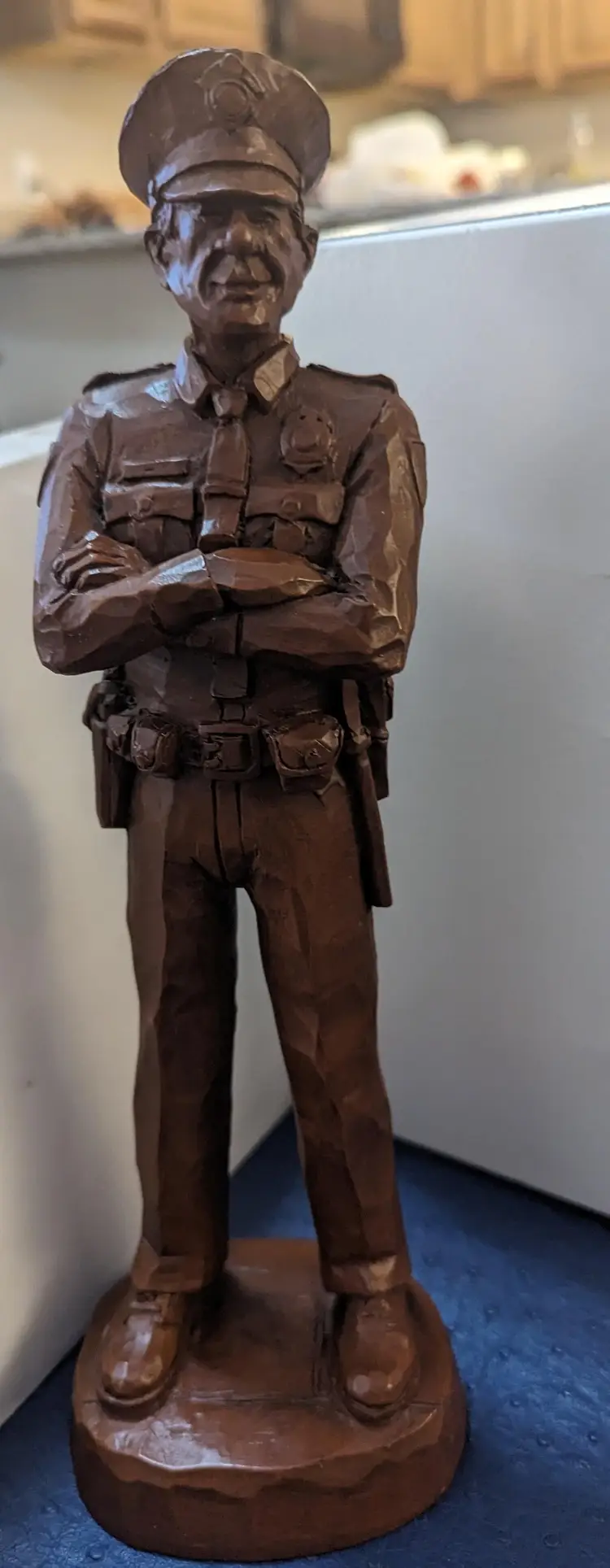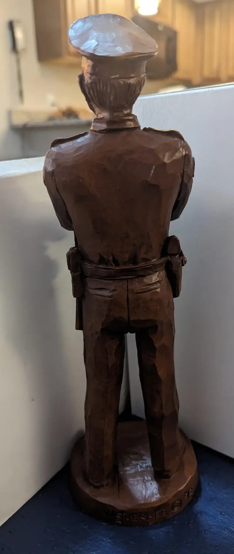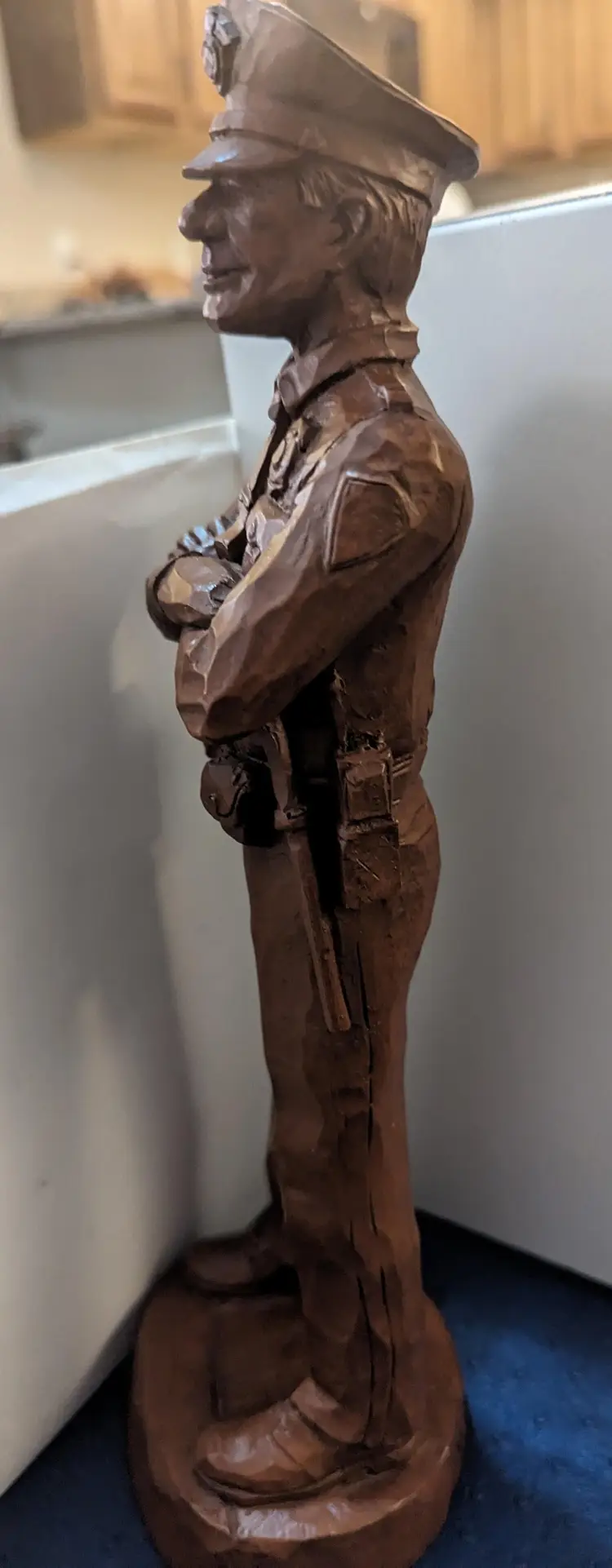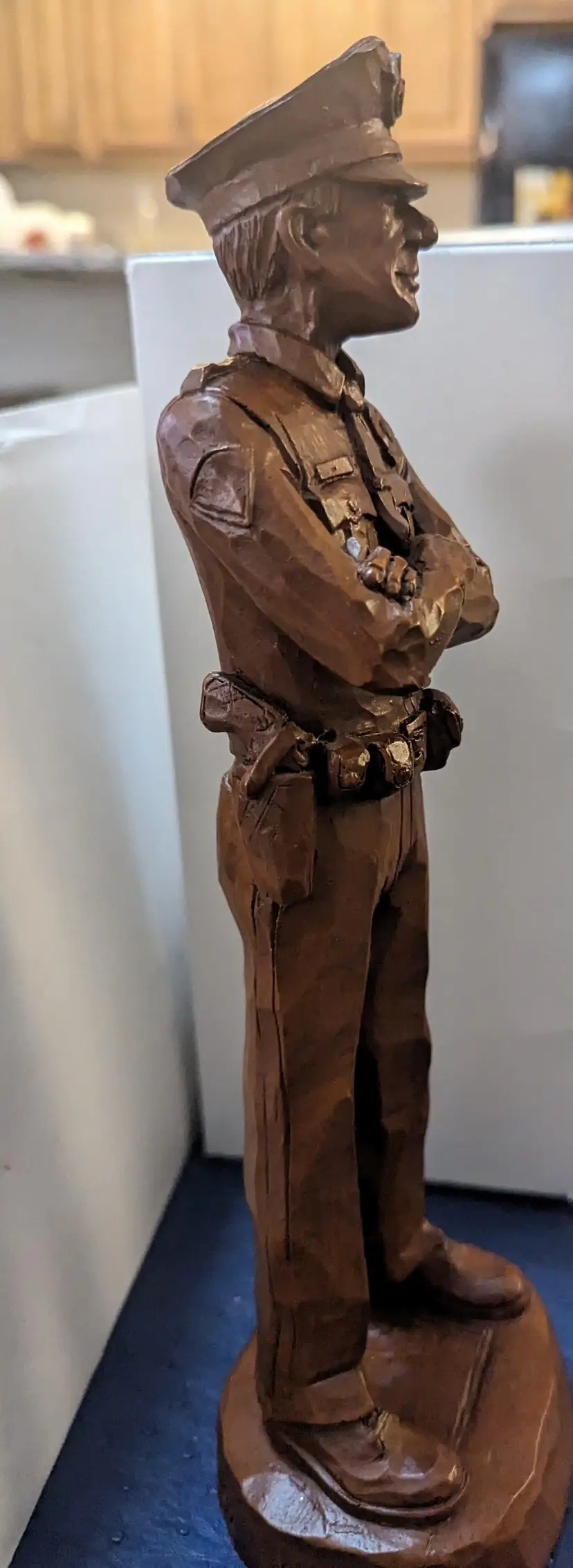 Add a touch of nostalgia to your collection with this vintage wooden police officer figurine. Perfect for display on a shelf or desk, this piece captures the classic look of a uniformed officer. Please see all pictures for condition and measurements.