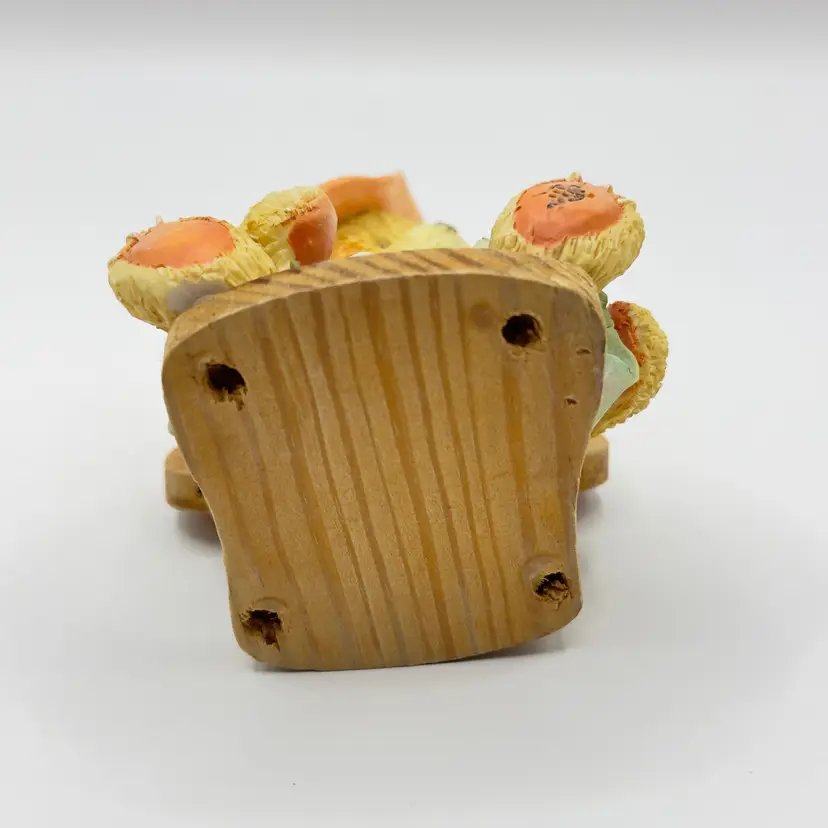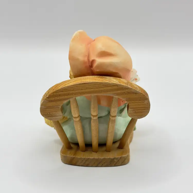This charming vintage teddy bear figurine is dressed in a delightful pastel outfit, complete with a matching hat. Perfect for collectors or as a sweet decorative piece for any room. In good condition with intricate detailing, missing chair legs. Measures 2x3x2 inches. Weighs 6oz.