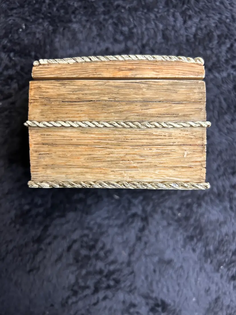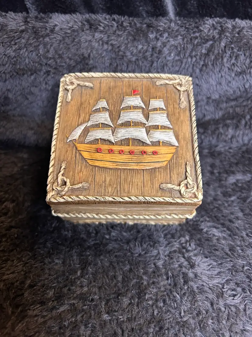 The Vintage 1993 Dezine Resin Hand Painted Trinket Box with a Sailing Ship design is a unique and collectible decorative item inspired by nautical themes. Hand-painted in brown resin, this box features intricate detailing and a charming sailing ship motif, making it a charming addition to any collection or home decor. Manufactured in 1993, this piece captures a timeless and classic aesthetic that is sure to be a treasured item for any collector or enthusiast of vintage trinket boxes.