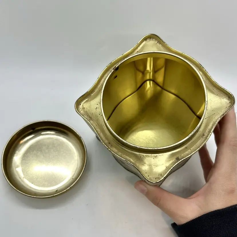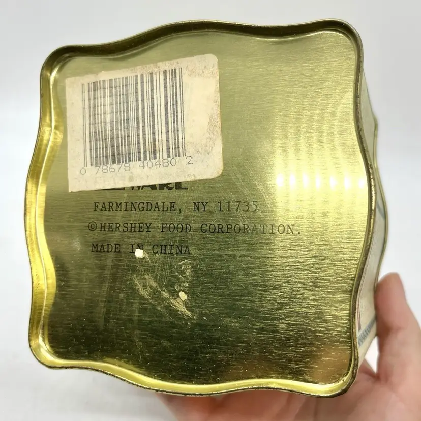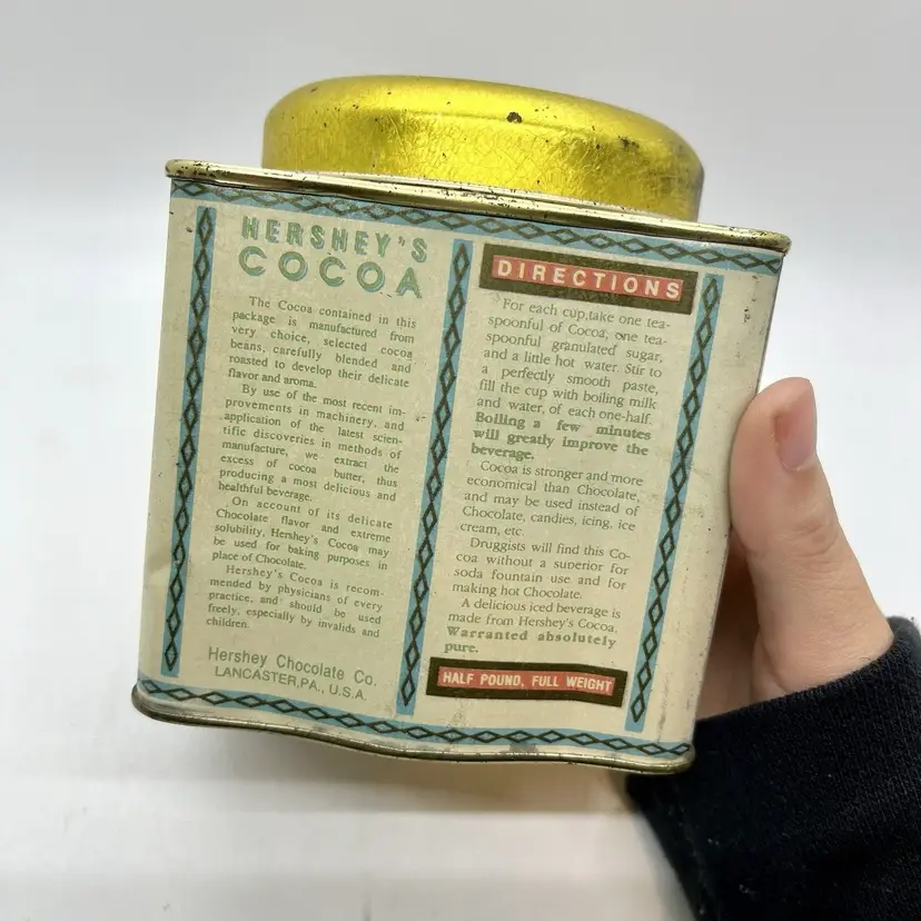 This listing is for a vintage Hershey's cocoa tin. Features a cherub baby inside a cocoa bean on a white and gold tin. There is patina on the tin as pictured, but no substantial damages. Measures about 4.5" tall and 4" across.