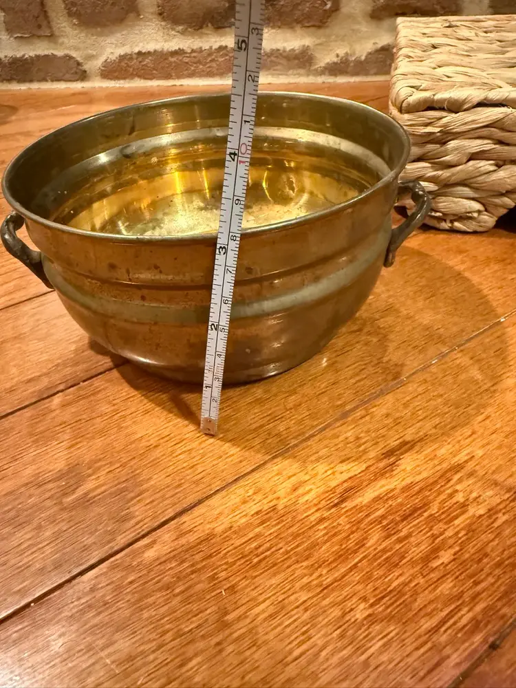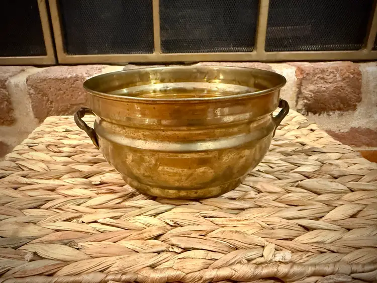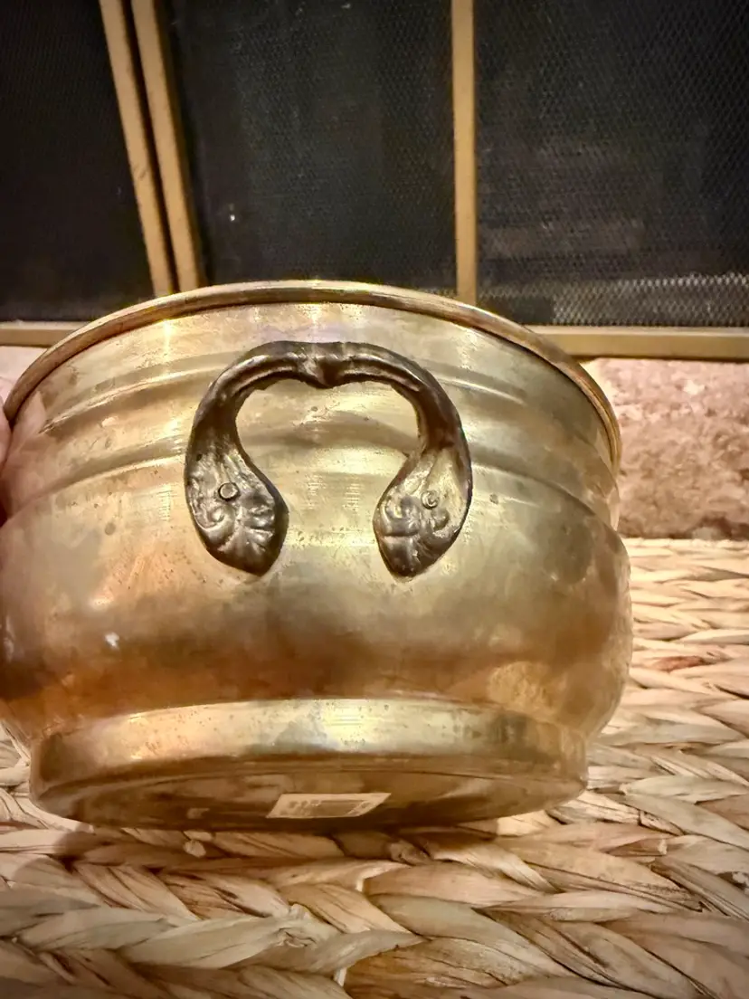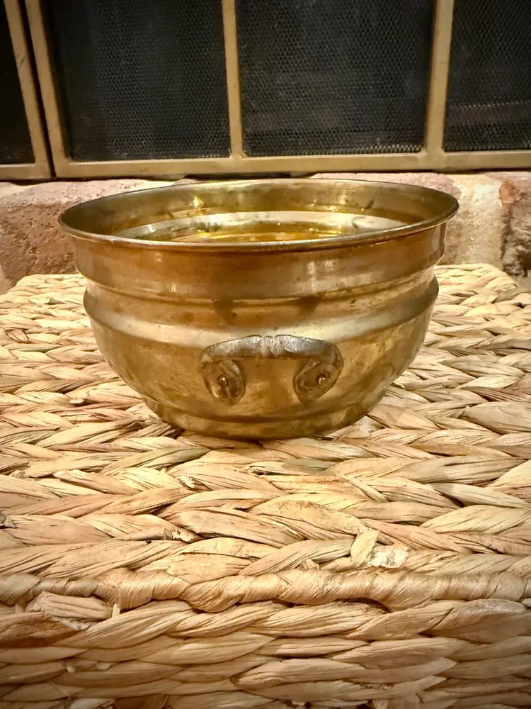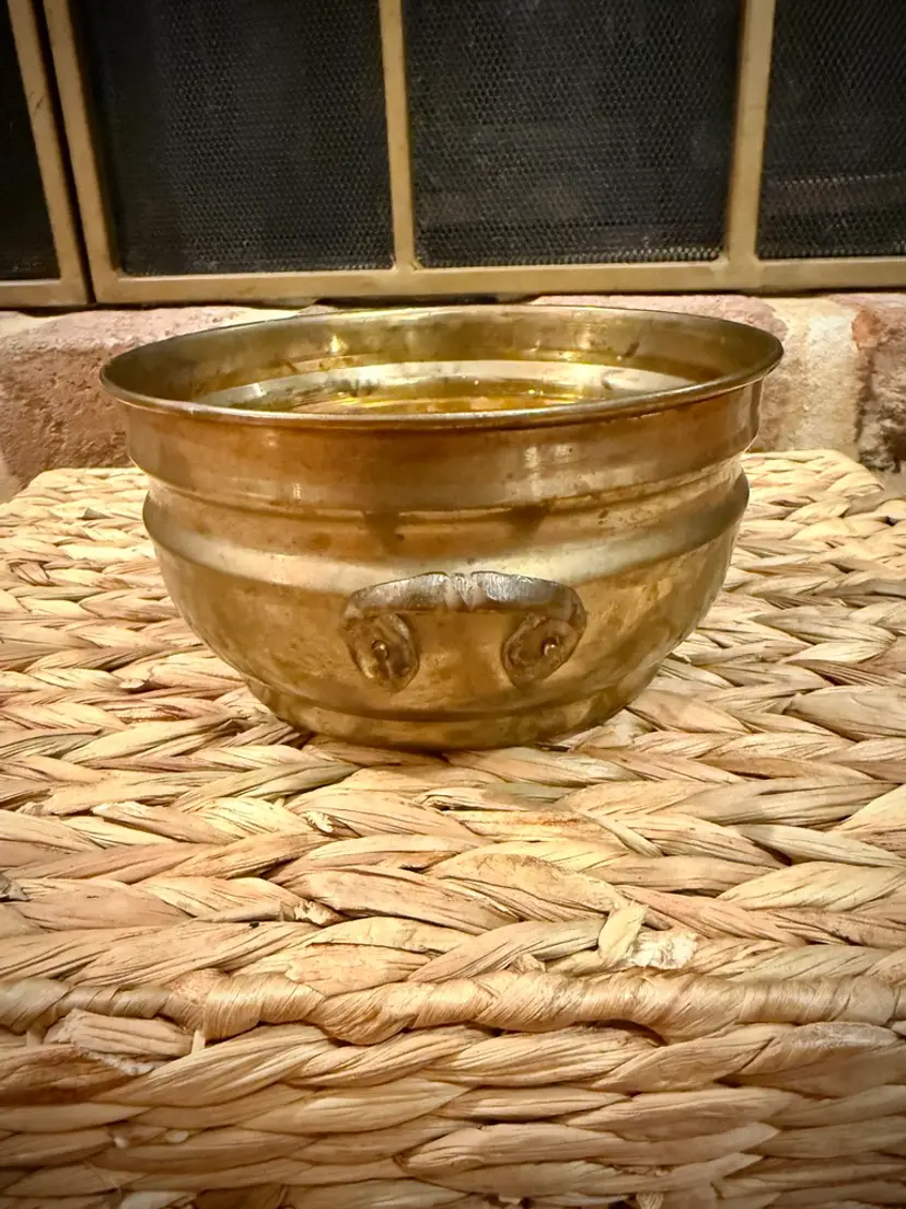 Add a touch of timeless warmth to your space with this vintage Hosley solid brass bowl, complete with elegant handles and a gently hammered finish. Its versatile design makes it ideal as a planter for succulents, a catch-all bowl for keys or jewelry, or a decorative centerpiece on a coffee table or shelf. The brass surface has developed a soft, authentic patina that enhances its vintage charm. Whether styled with greenery or left empty as a sculptural accent, this bowl brings effortless boho-meets-mid-century character to any room. Details: Maker: Hosley Material: Solid brass Finish: Warm, polished brass with natural patina Dimensions: Approximate size: 6” diameter × 3” tall Condition: Very good vintage condition; light wear consistent with age and use