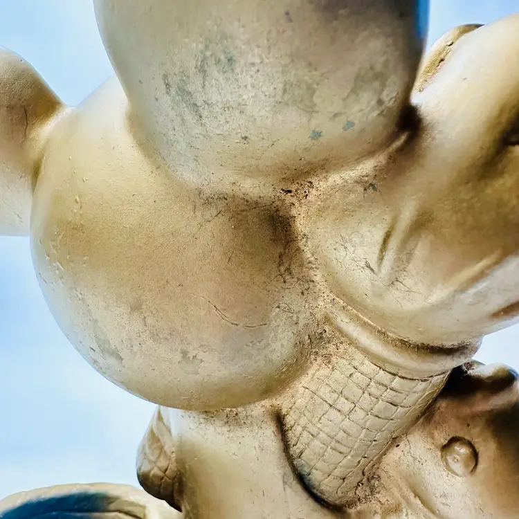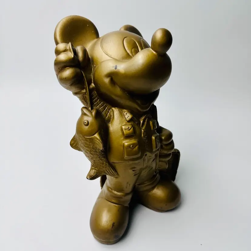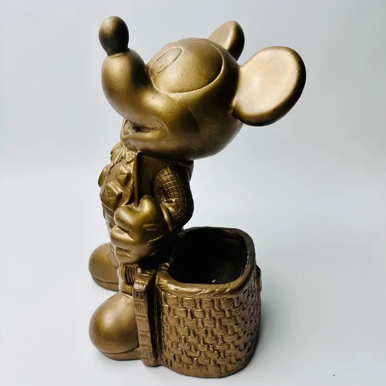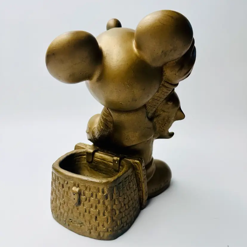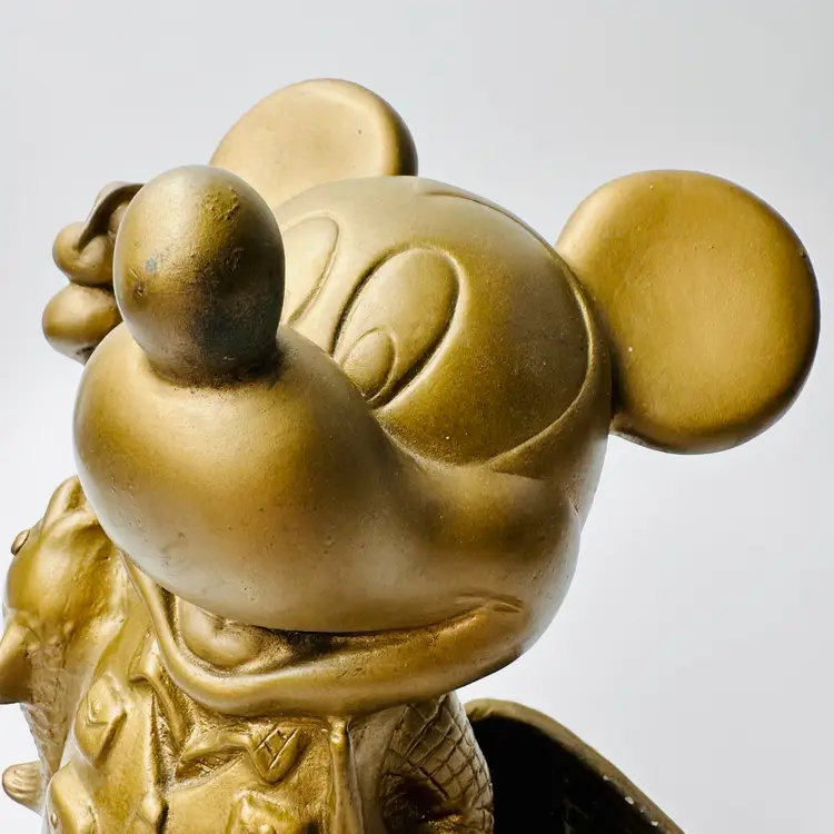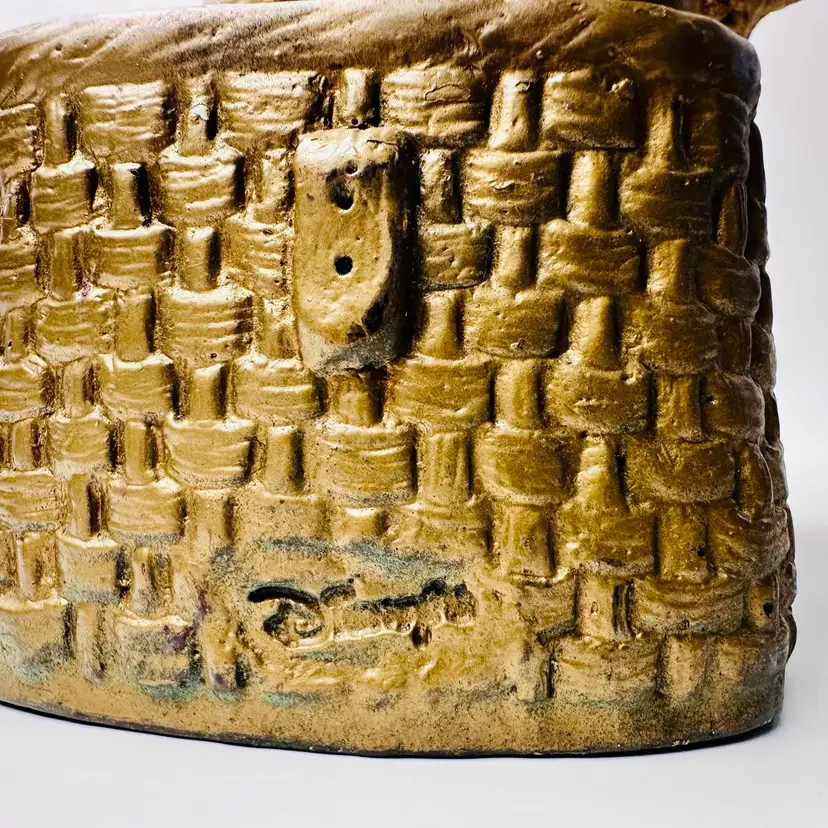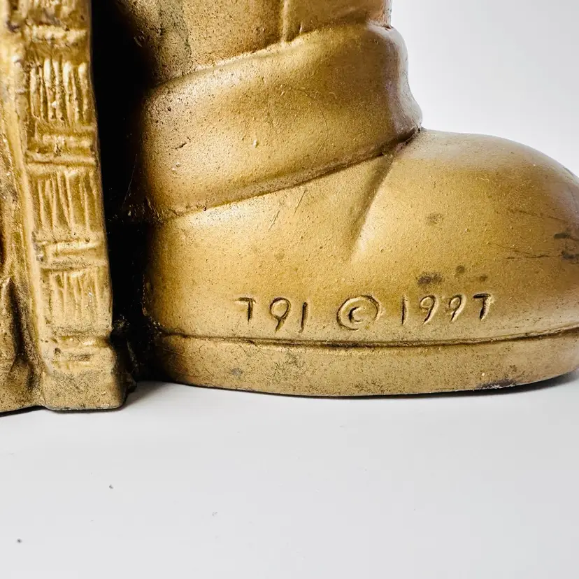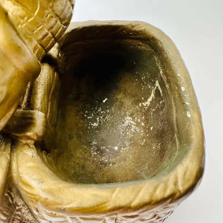 This item is in good vintage condition. The previous owner added rocks to the interior for increased stability. Made of resin and painted a bronze/gold color. Some black markings/wear throughout a piece. One noticeable area of missing paint on the nose. See images for details Measure 10 1/4 inches tall by 5“ x 7 1/2“ wide. Weighs 2 lbs. 12 oz.