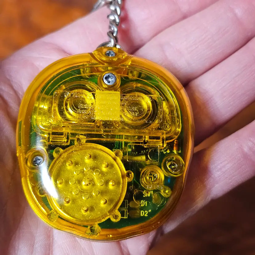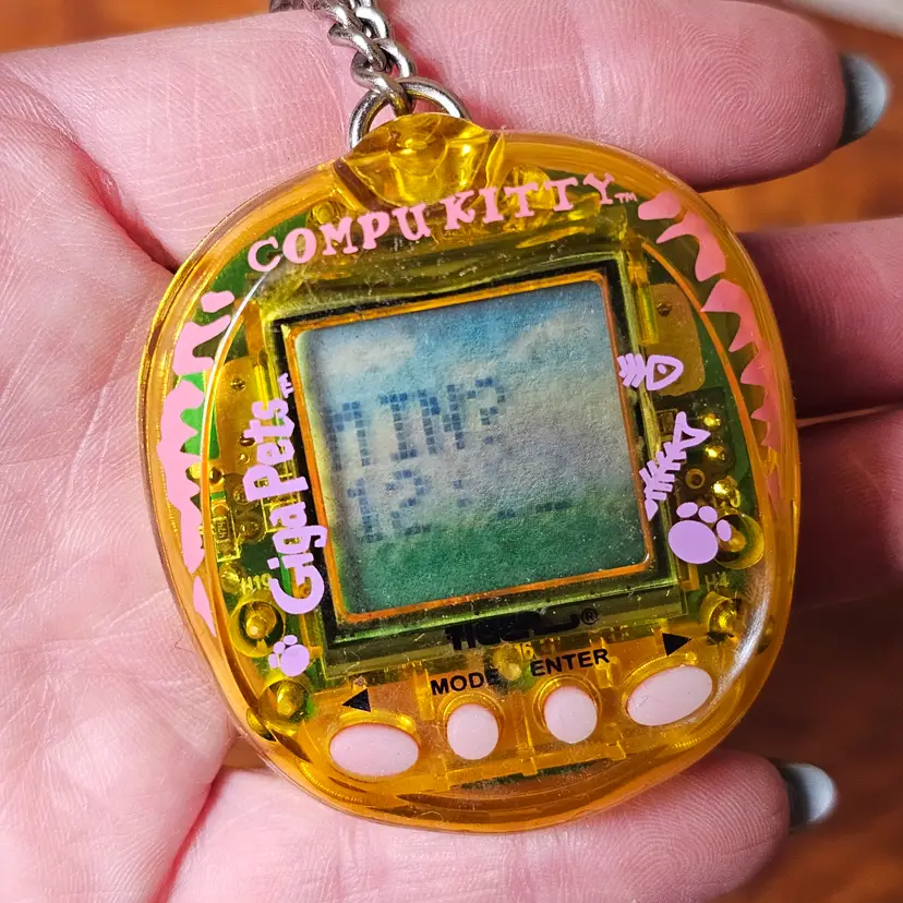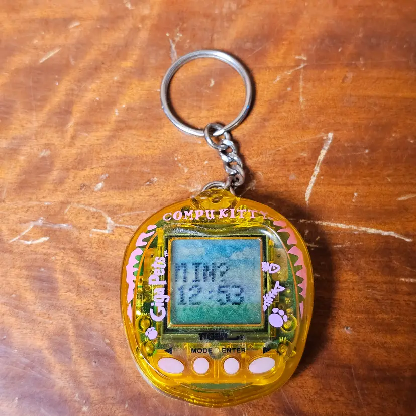 Details: This is a great nostalgic find for any collector of 90s toys or virtual pets. This is the Compu Kitty version of the popular Giga Pets virtual pet line, released by Tiger Electronics in the late 1990s. The toy features a classic handheld design with a small LCD screen, three control buttons, and a key ring. The unit is a translucent yellow with pink and purple decals and buttons, featuring cat-themed graphics like paw prints and fish bones. You raise the digital "Compu Kitty" by feeding it, playing with it, and keeping it happy.
