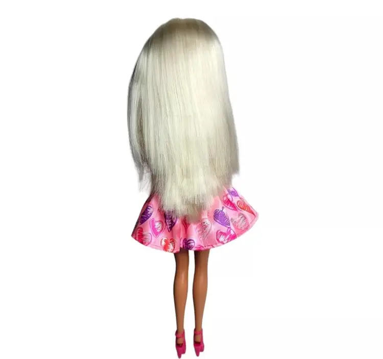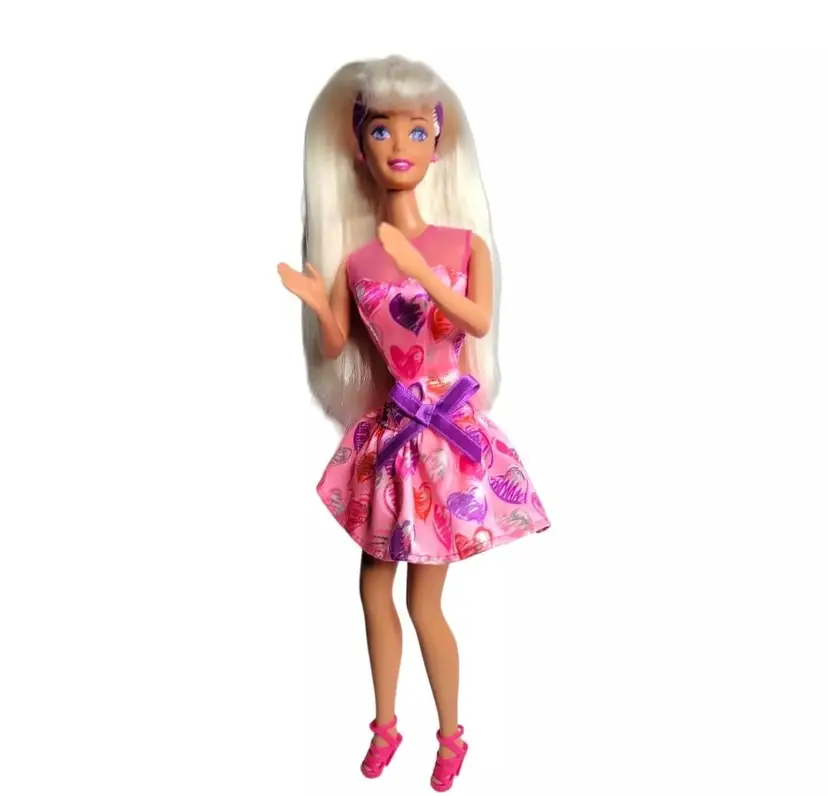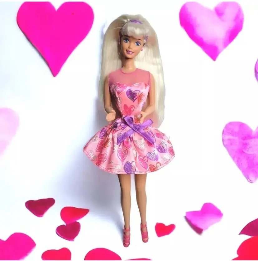 Charming vintage 1990's Barbie doll featuring long blonde hair and a vibrant heart-patterned dress. Perfect for collectors or as a nostalgic gift. A delightful addition to any vintage doll collection. E2