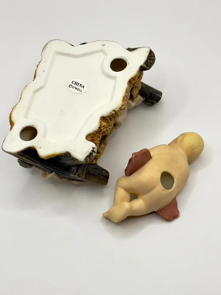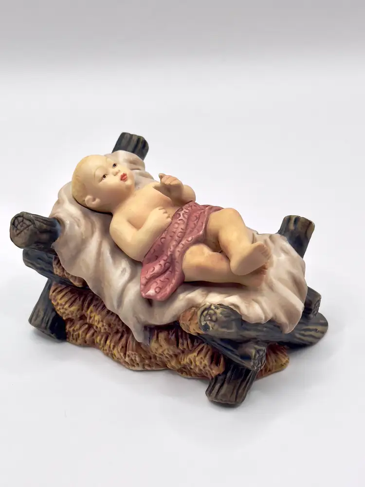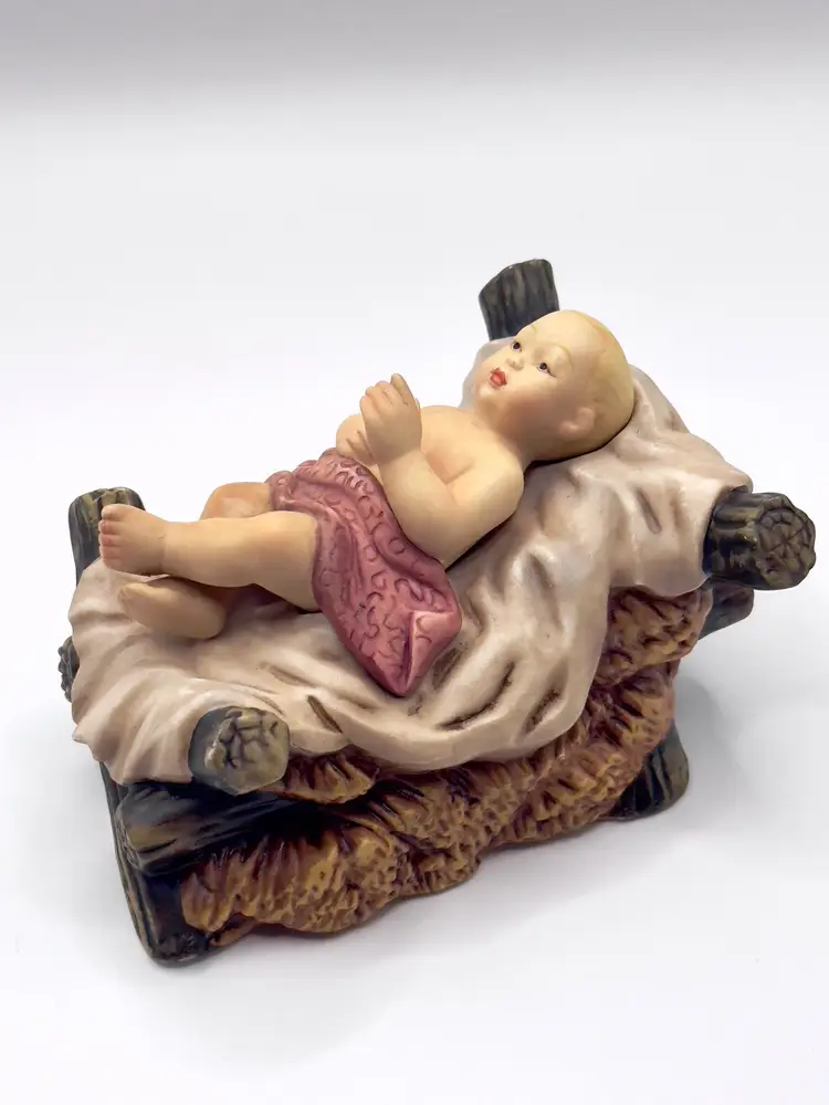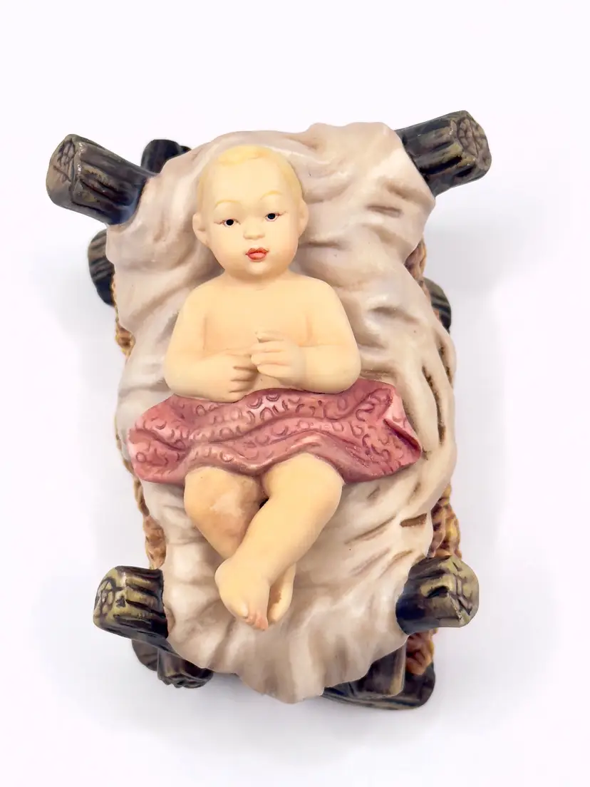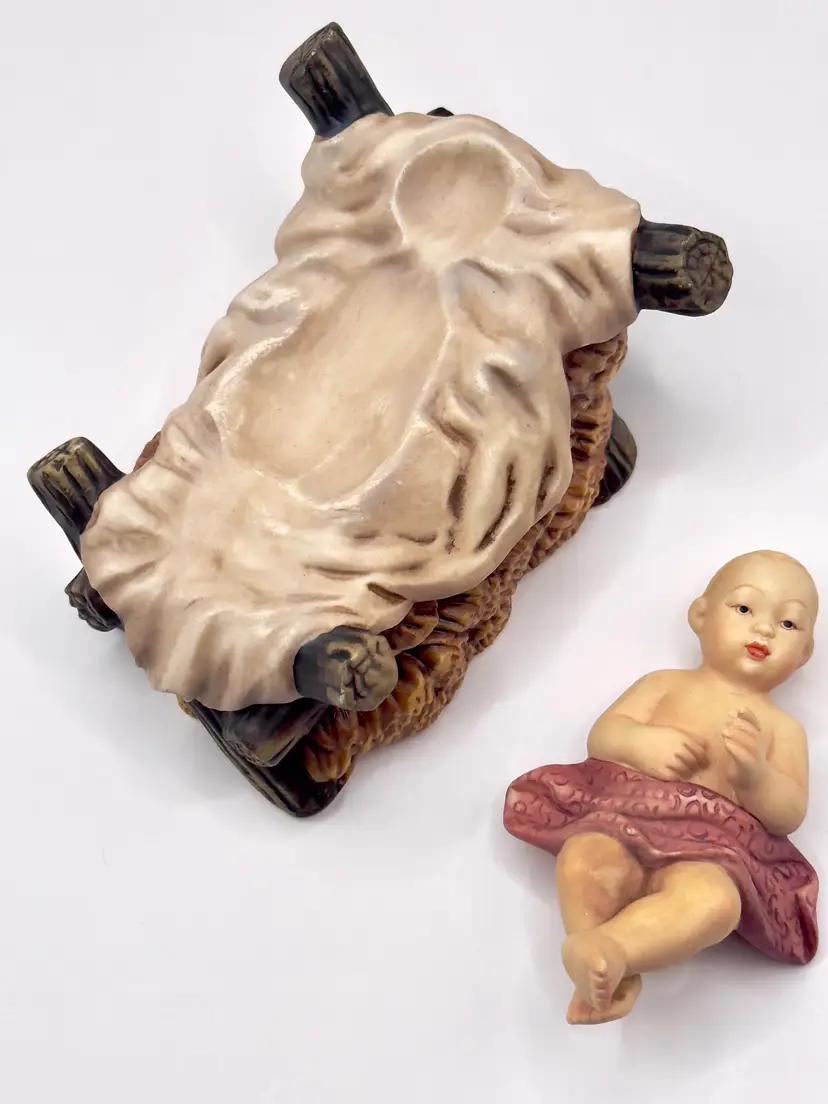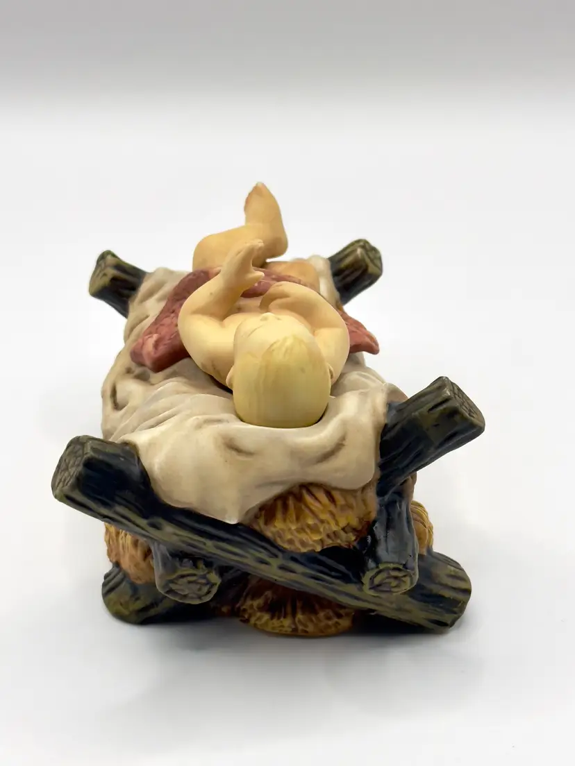 This charming vintage Baby Jesus laying in a manger nativity replacement figurine is a perfect addition to your Christmas decor. Hand-painted with delicate details, it captures the innocence and serenity of the nativity scene. Ideal for collectors or as a unique holiday gift. Good condition with no chips or cracks. Measures 4.25x3x3 inches. Weighs 8oz.