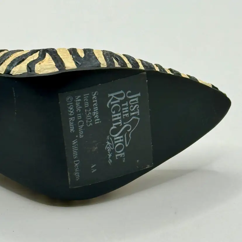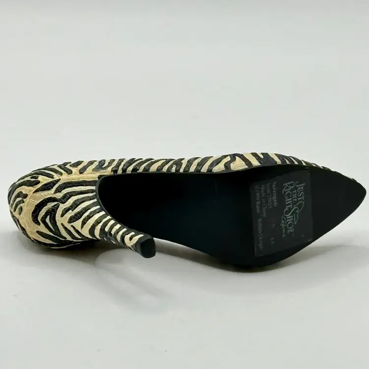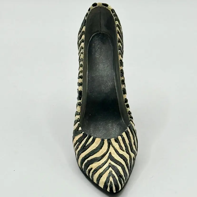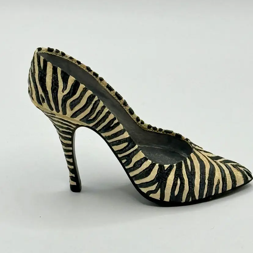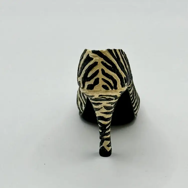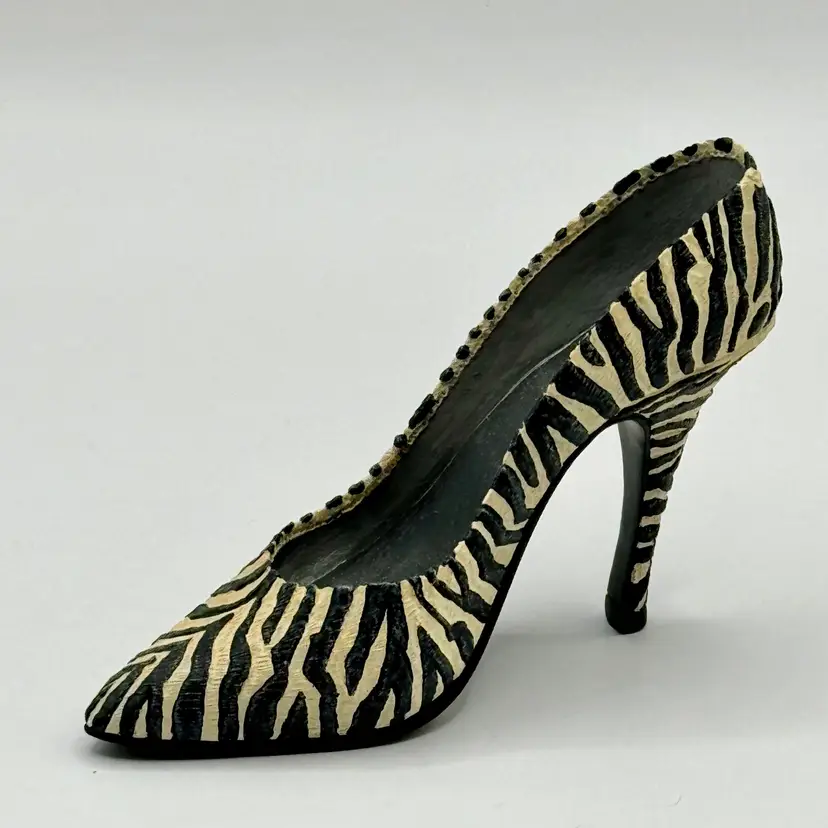 Step up your decor with this vintage ceramic high heel shoe figurine, featuring a charming black and cream zebra print. A perfect touch of elegance for your vanity or as a unique shelf display. In great condition, ready to add a dash of vintage flair to your space. Measures 4x2.5x1.25. Weighs 4oz.