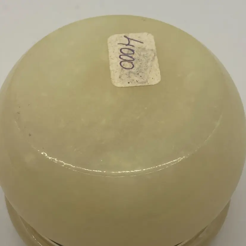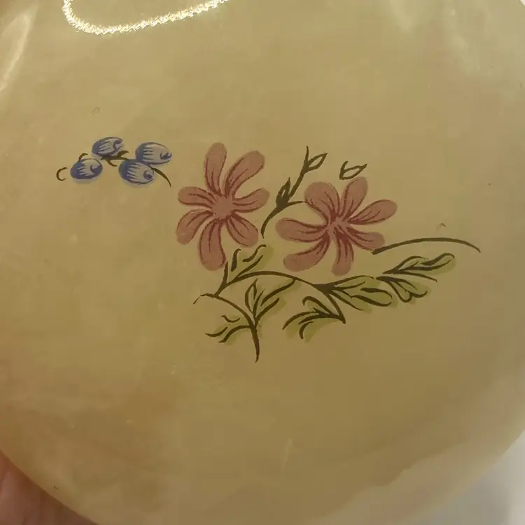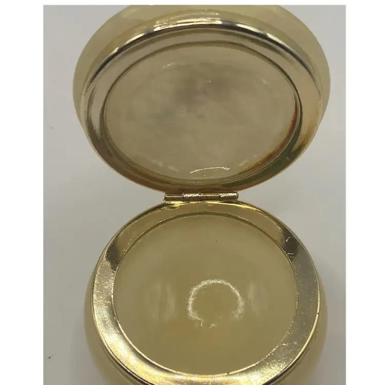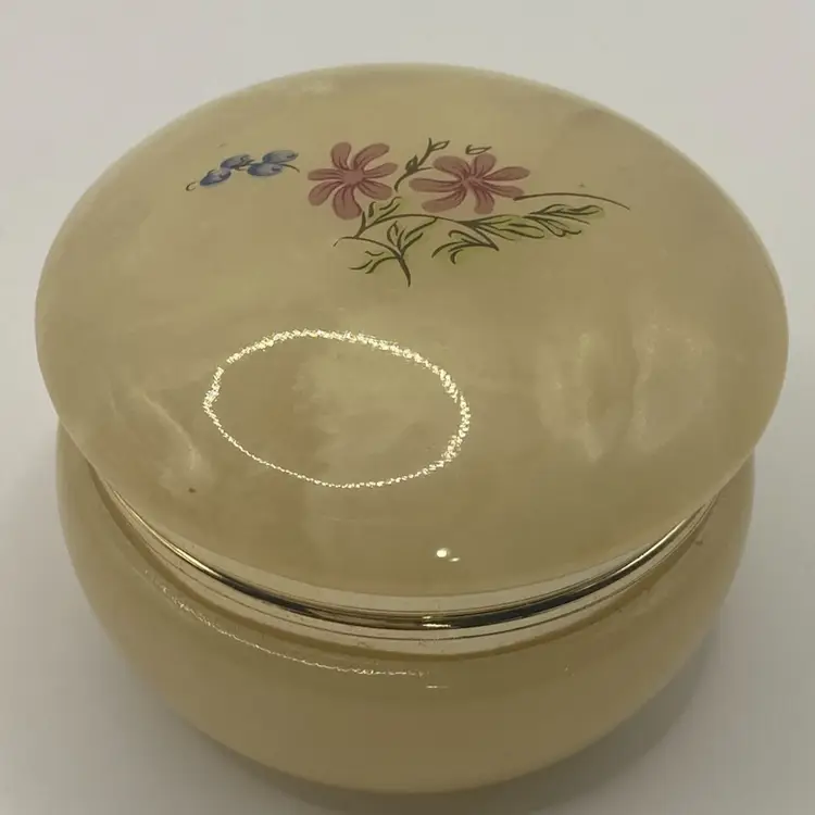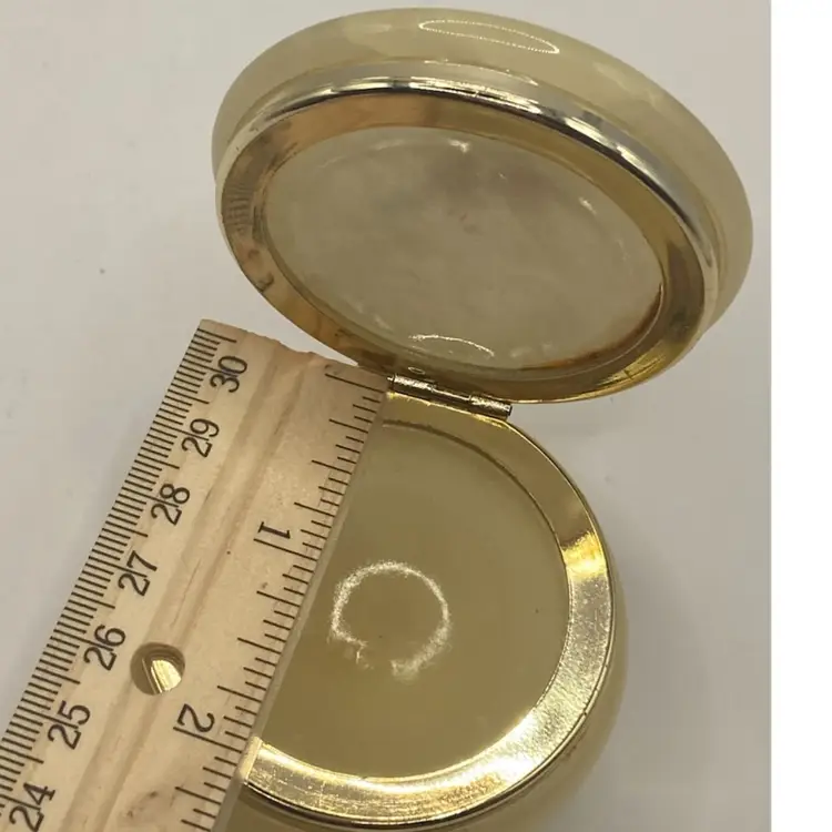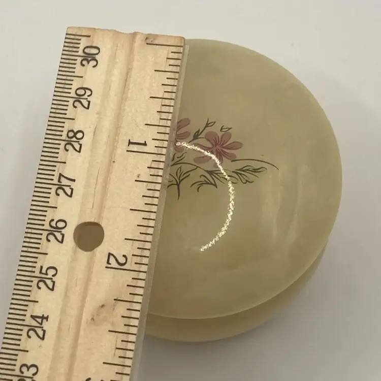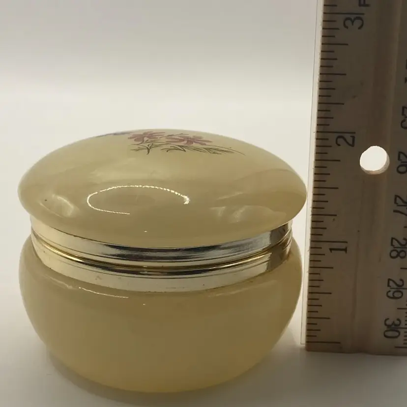 The measurements are ~ 2 1/2” round, 1 3/4” tall. It has a gold toned hinged lid. In great condition with no chips or breaks.