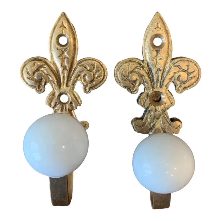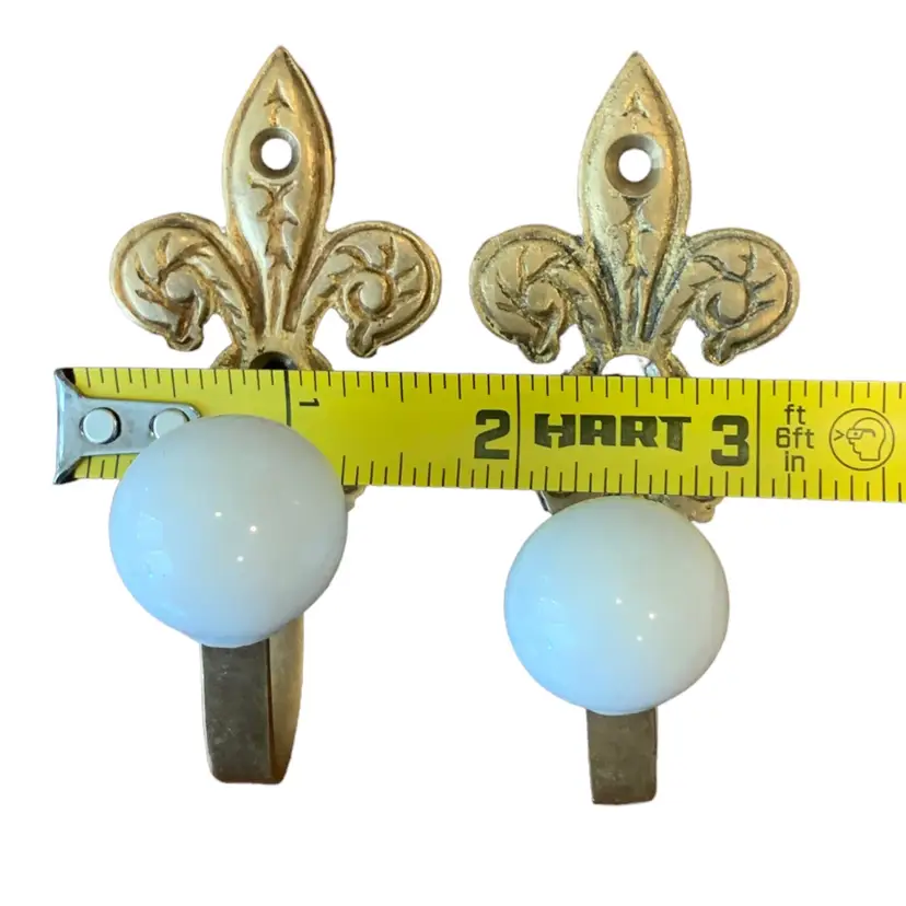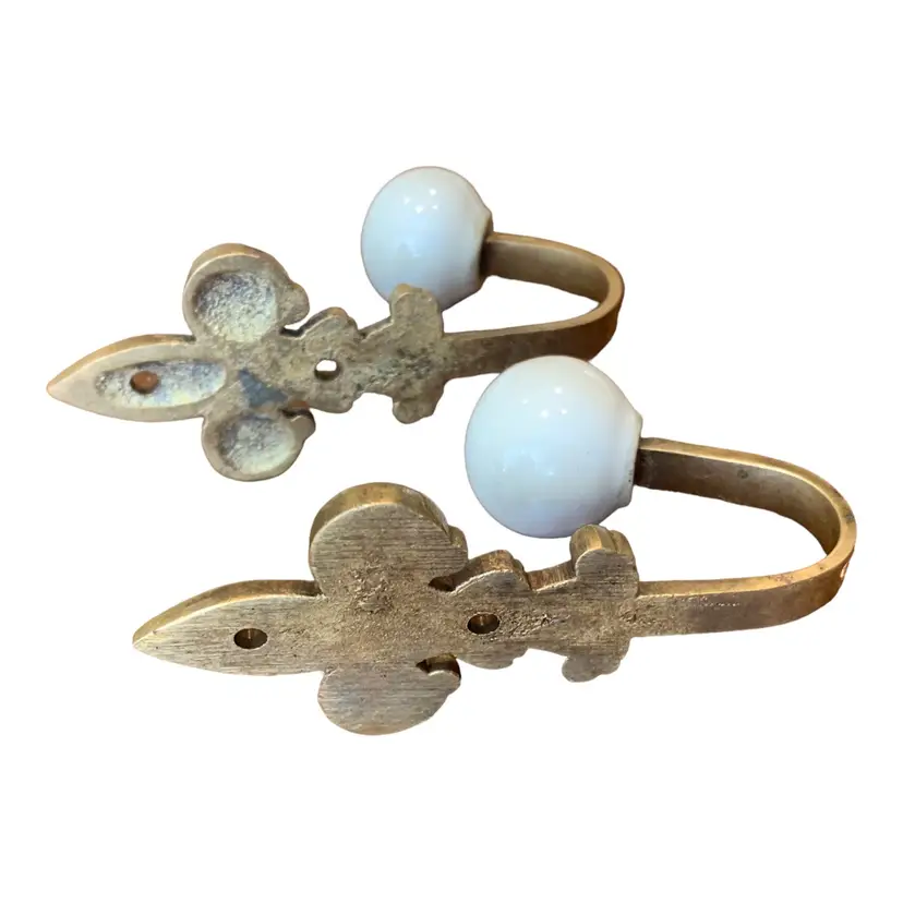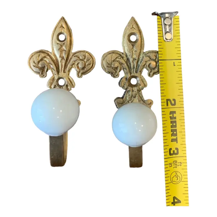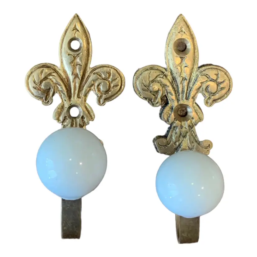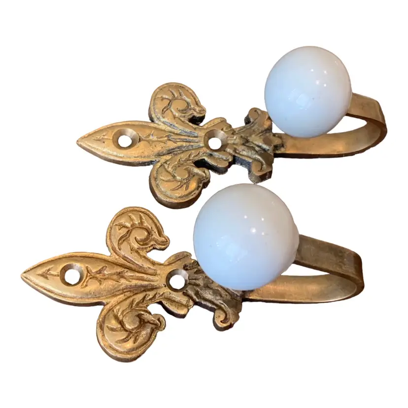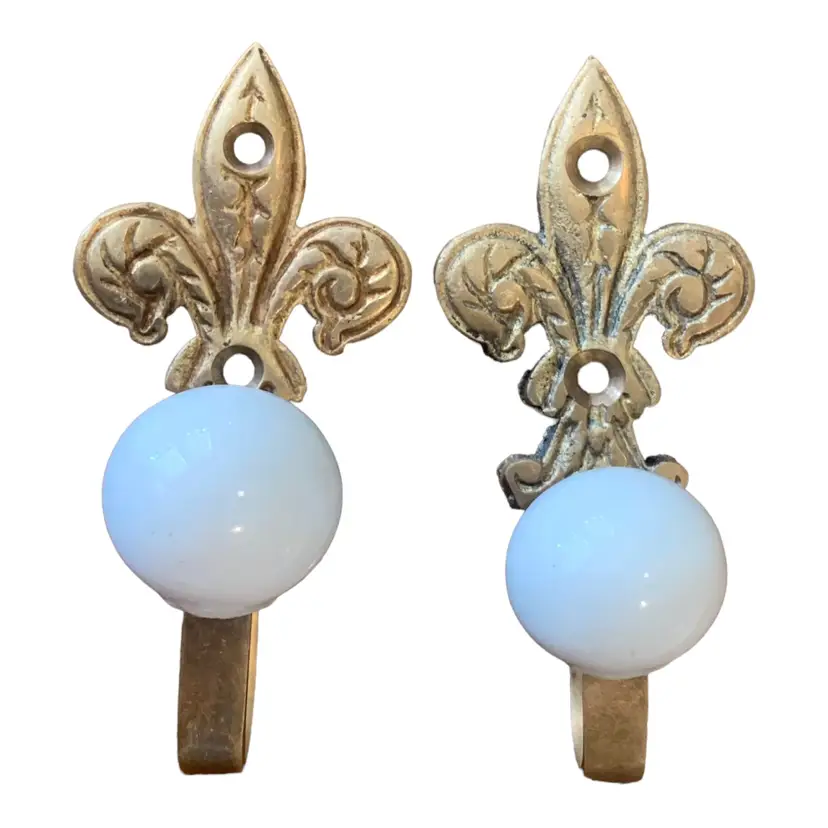 Add a touch of vintage to your home with this set of two brass hooks featuring a Fleur De Lis design and a ceramic knob. Perfect for hanging towels or other items, these hooks are made of high-quality brass and have been reclaimed for a unique and authentic look. The hooks are ideal for those who love vintage items and want to add a touch of character to their home decor.