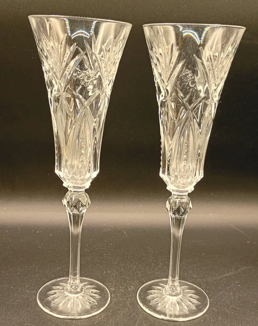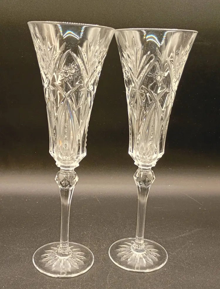 These Champagne Flutes would be a great addition for your Holidays and Speical Occasions. This product is a set of two vintage Cristal D'Arques-Durand Vincennes crystal champagne flutes, manufactured in France in 1998. These elegant champagne glasses are hand-blown and feature a glossy finish. With a round shape and clear color, these champagne flutes are perfect for all occasions. Each flute stands at 10 inches tall with a rim-to-rim diameter of 3 1/8 inches. Preowned: No chips or cracks to either Flute