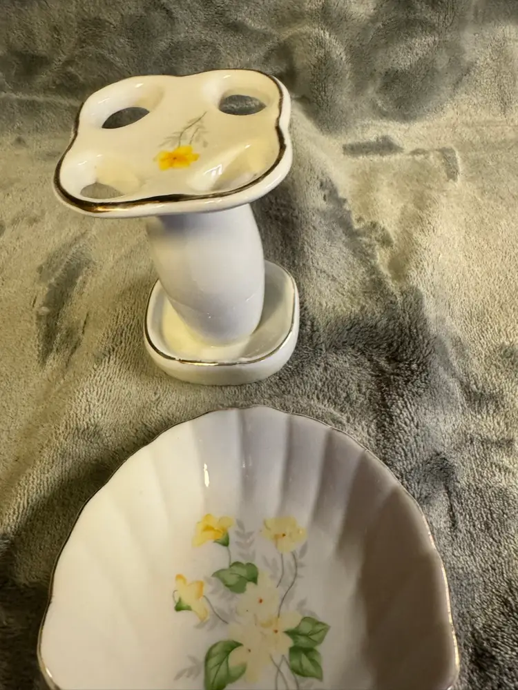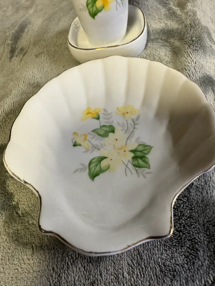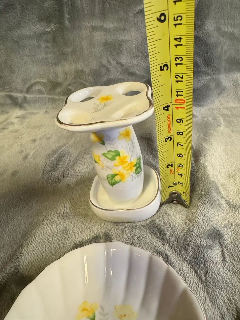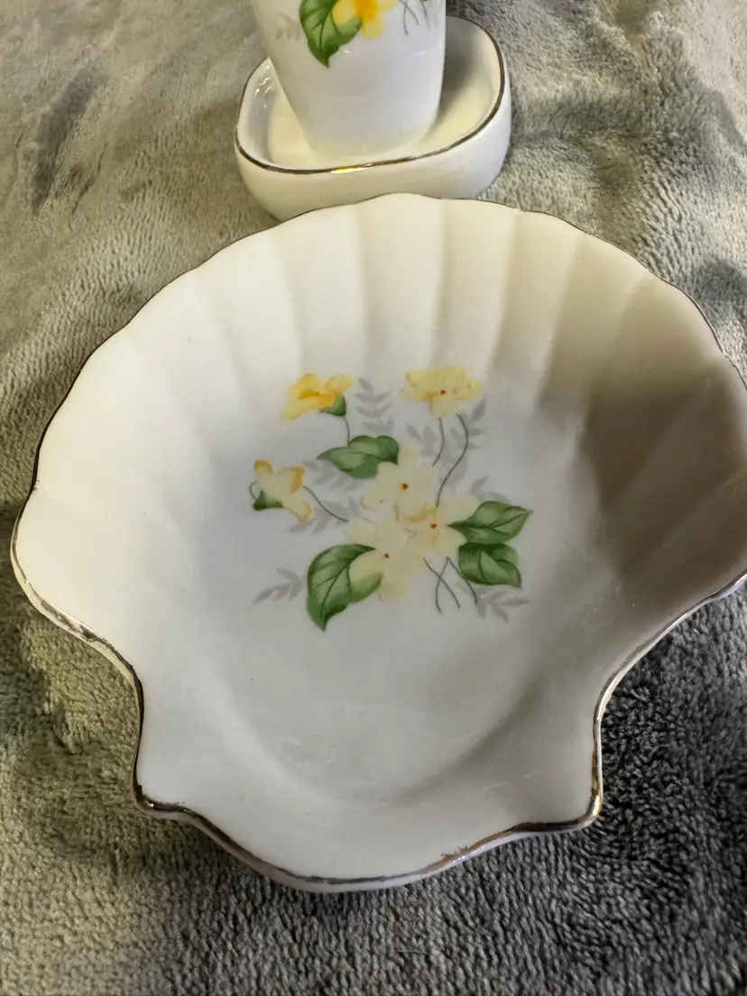 This vintage set features a porcelain yellow flower seashell soap dish and toothbrush holder, with an Oriental style and glossy finish. Made in Japan, the irregularly shaped pieces have a floral pattern and a smooth texture, adding a touch of elegance to any bathroom. The set includes two items and is designed for adults, with no assembly required. Perfect for fans of floral and garden themes, this original accessory set is a unique and charming addition to any home. Good condition. No chips, cracks, or crazing. There is some wear to the gold detailing around the edges. See photos for measurement and condition.