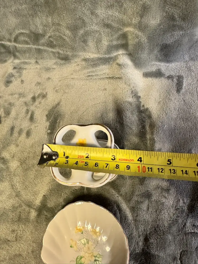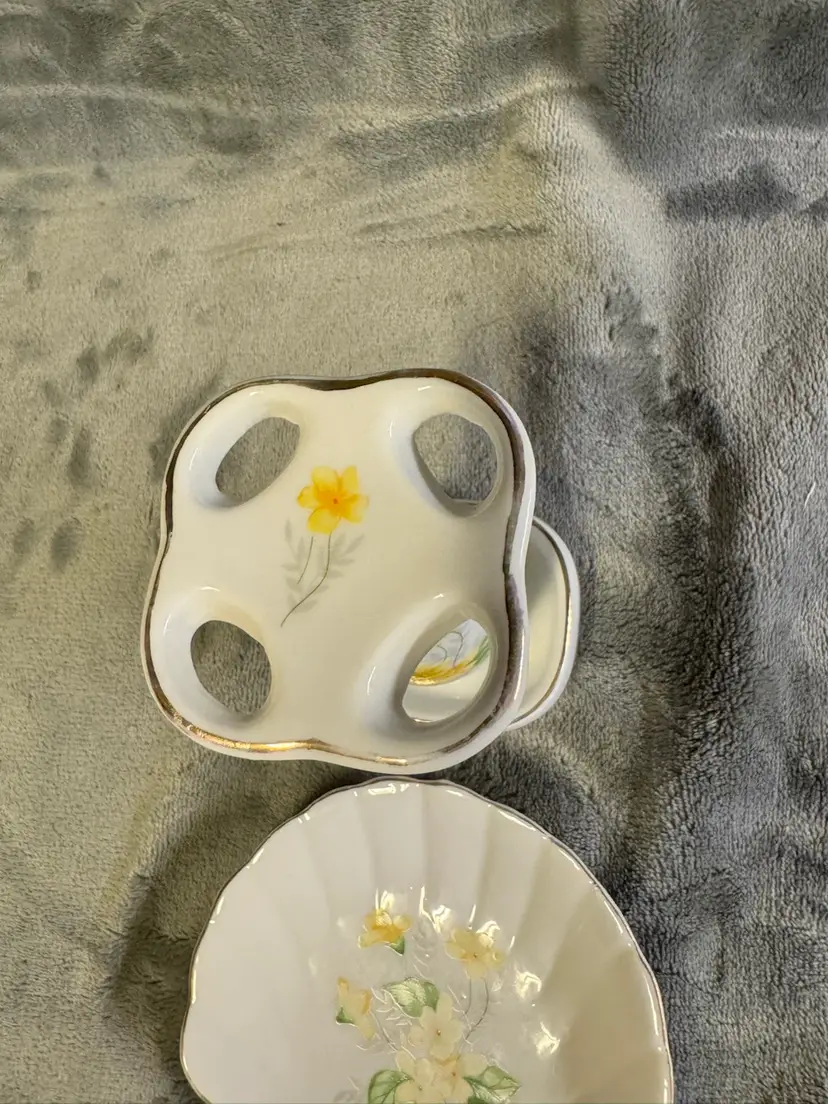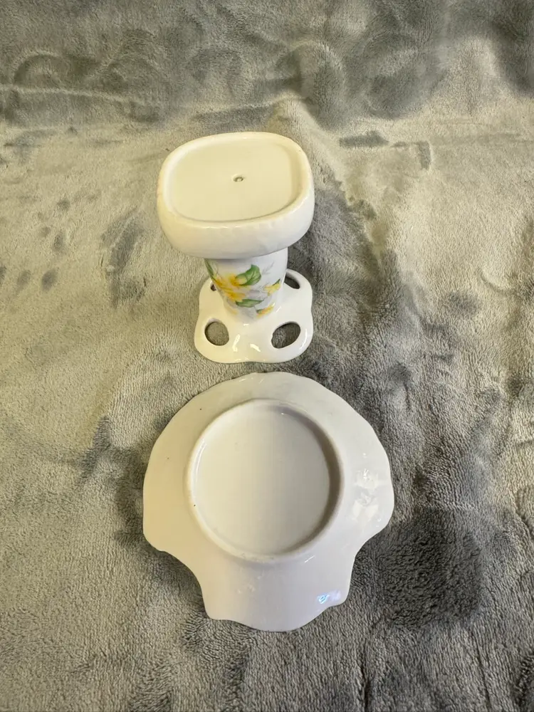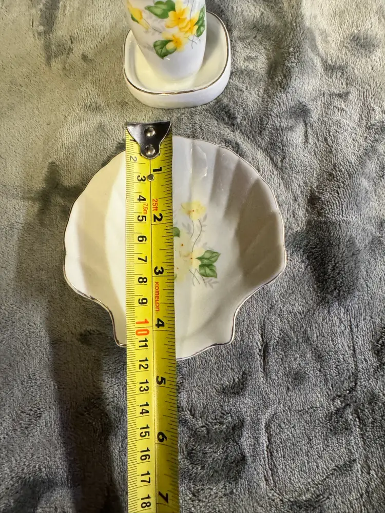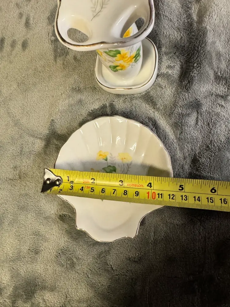 This vintage set features a porcelain yellow flower seashell soap dish and toothbrush holder, with an Oriental style and glossy finish. Made in Japan, the irregularly shaped pieces have a floral pattern and a smooth texture, adding a touch of elegance to any bathroom. The set includes two items and is designed for adults, with no assembly required. Perfect for fans of floral and garden themes, this original accessory set is a unique and charming addition to any home. Good condition. No chips, cracks, or crazing. There is some wear to the gold detailing around the edges. See photos for measurement and condition.
