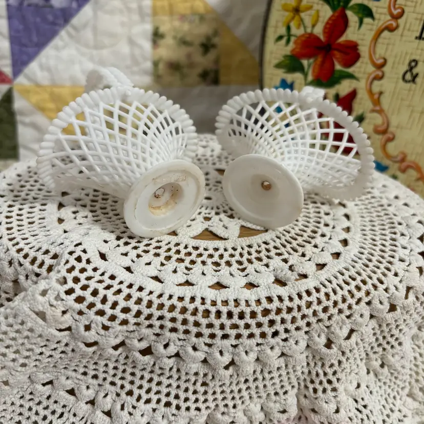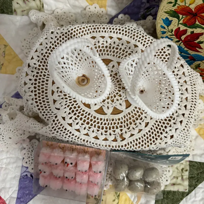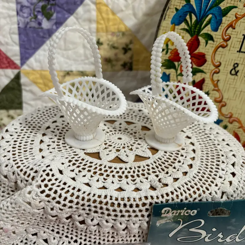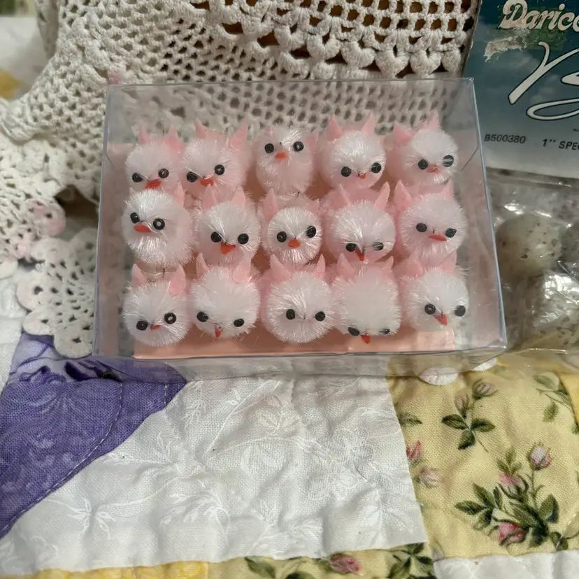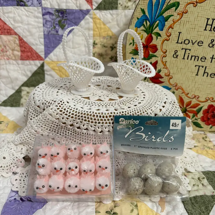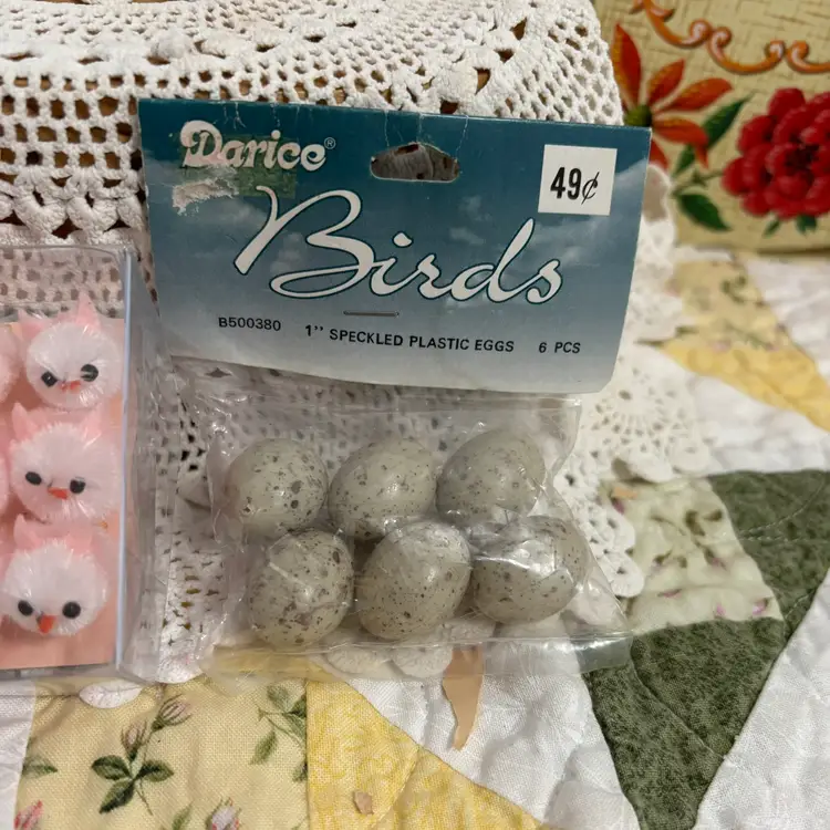 Make a cute Easter assemblage using these small vintage plastic flower baskets, pack 6 speckled bird eggs (NOS) and these darling set of 15 tiny pink chicks. All in great condition. Baskets measure 3" long 3.25" high.