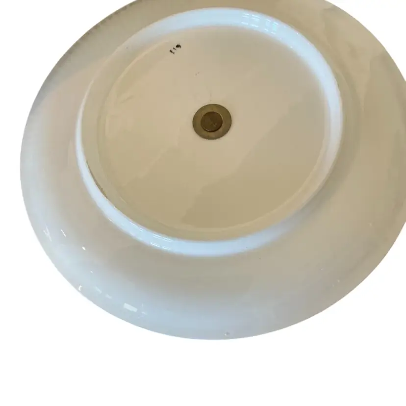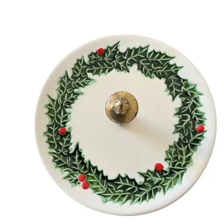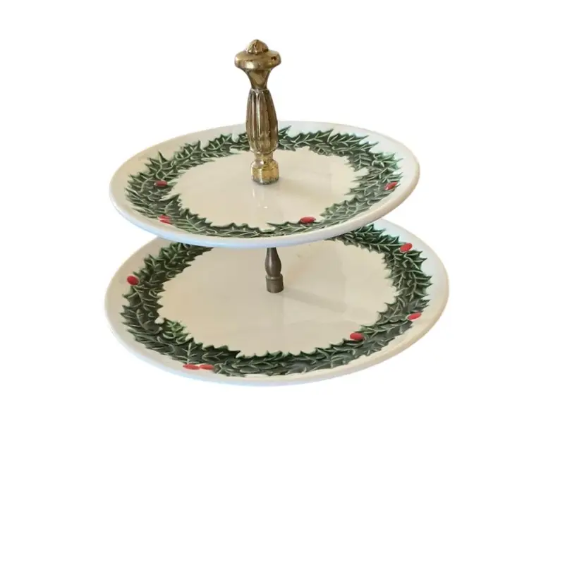 Read- Classic design ceramic service plate perfect for those holiday treats. There is a small crack on the bottom plate where the handle attaches. But otherwise in perfect condition. Height is 9” and 9” in diameter.