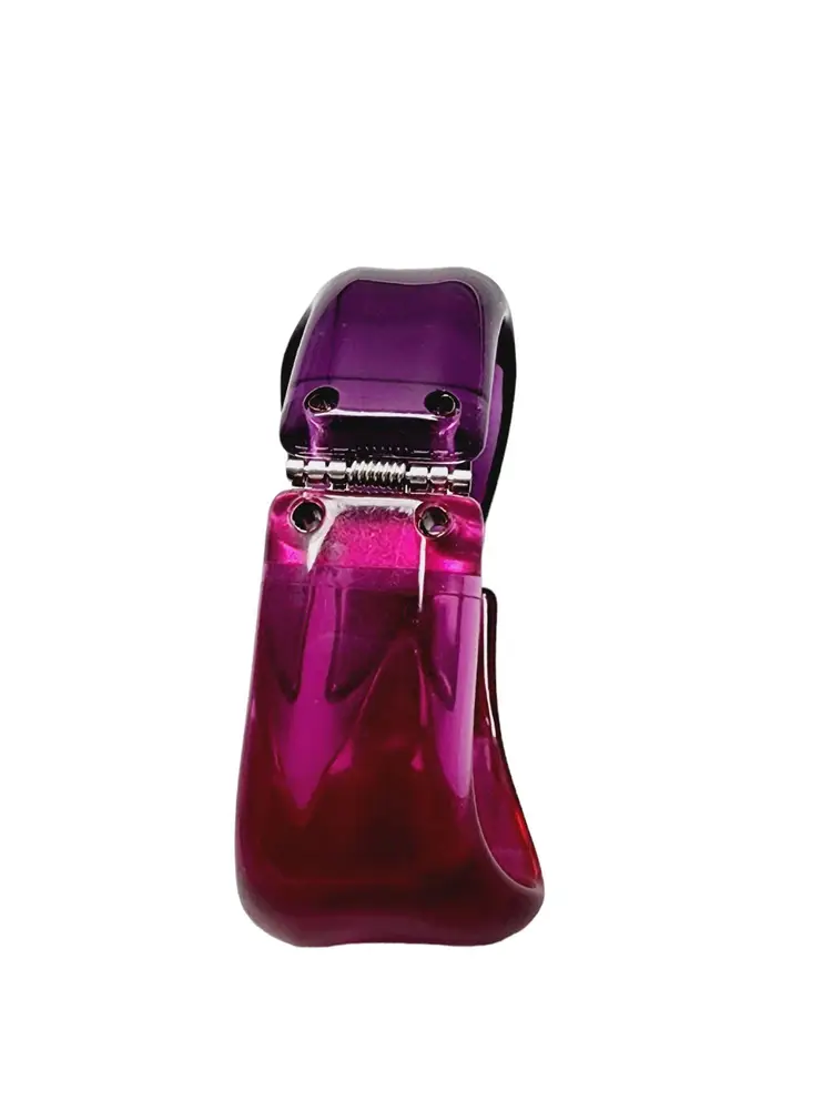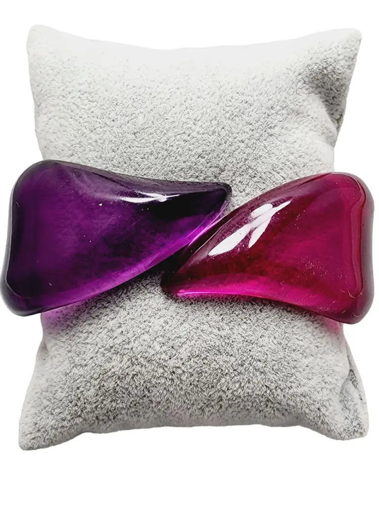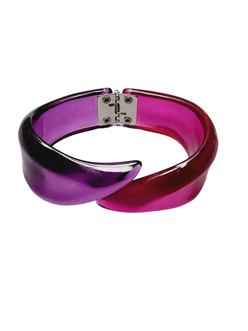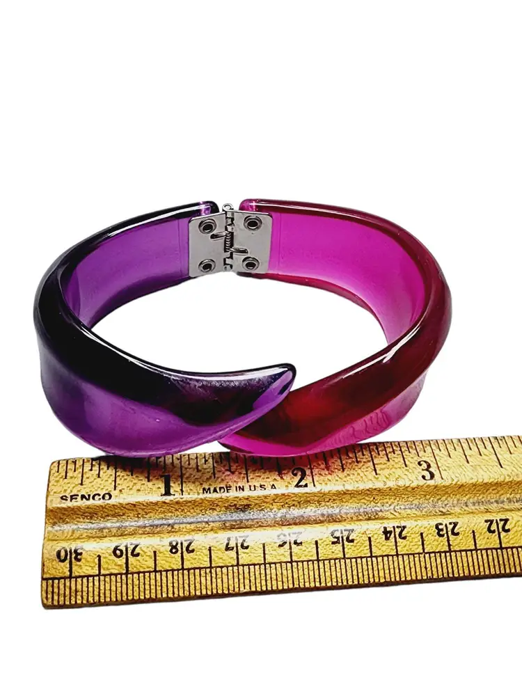 Size: 2.75" inner diameter Color: Pink and Purple Condition: Very good vintage Signed: None Details: Very well-made hinged bracelet.