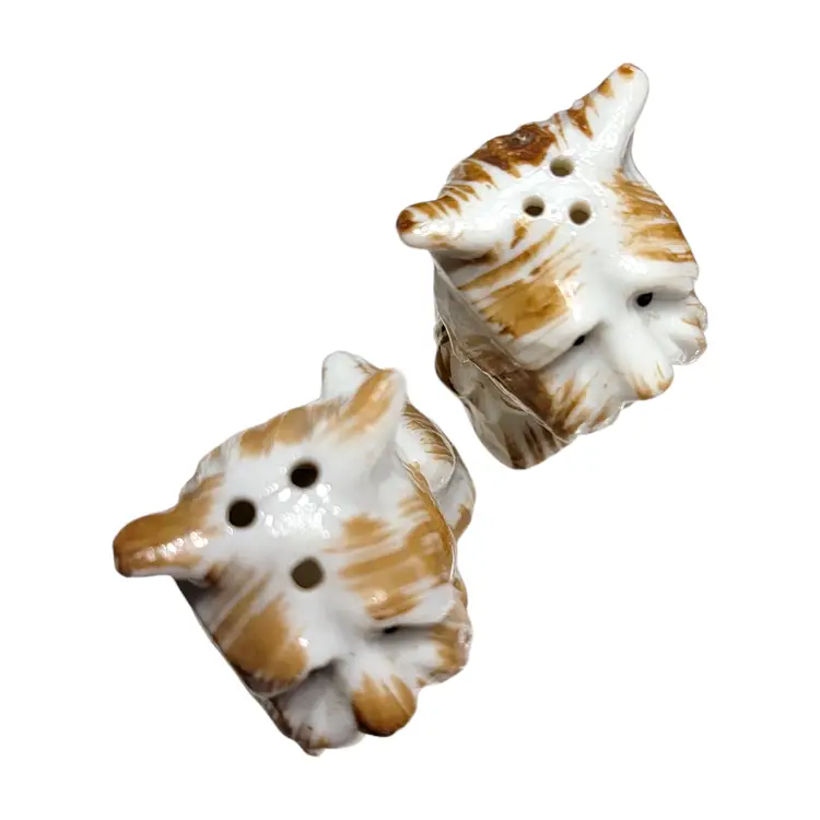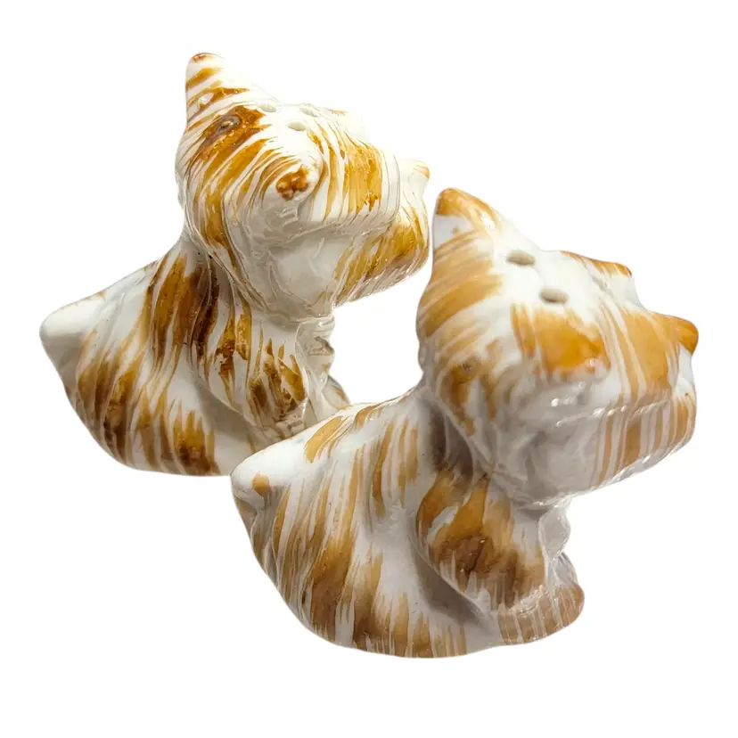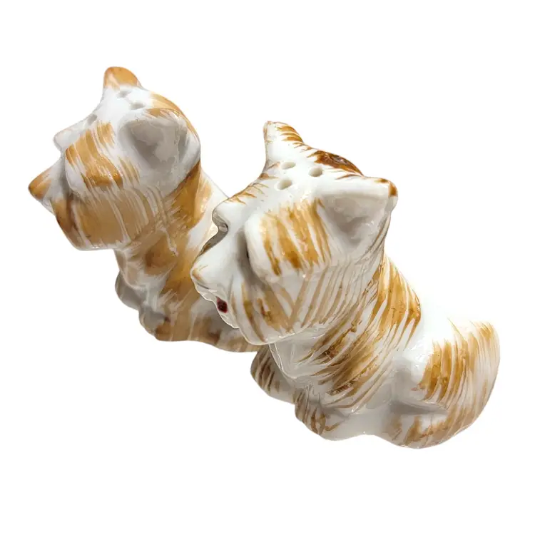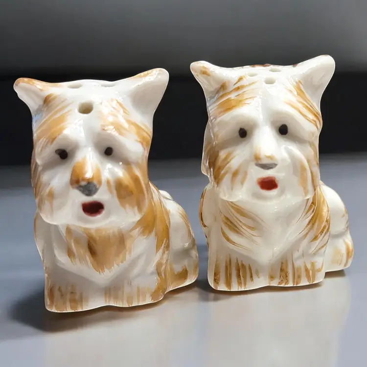 Charming vintage ceramic salt and pepper shakers featuring an adorable highland terrier dog design. Perfect for adding a touch of whimsy to your kitchen or dining table. These shakers are in great vintage display condition with lovely hand-painted details. One shaker has the stopper inside and part of the opening is chipped off. See photo!