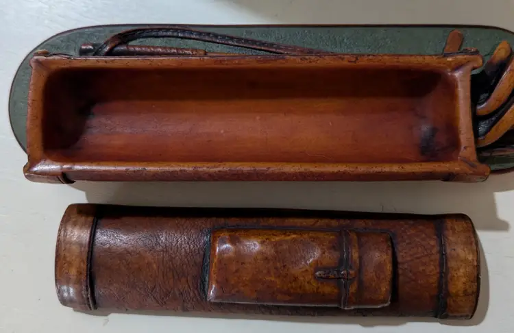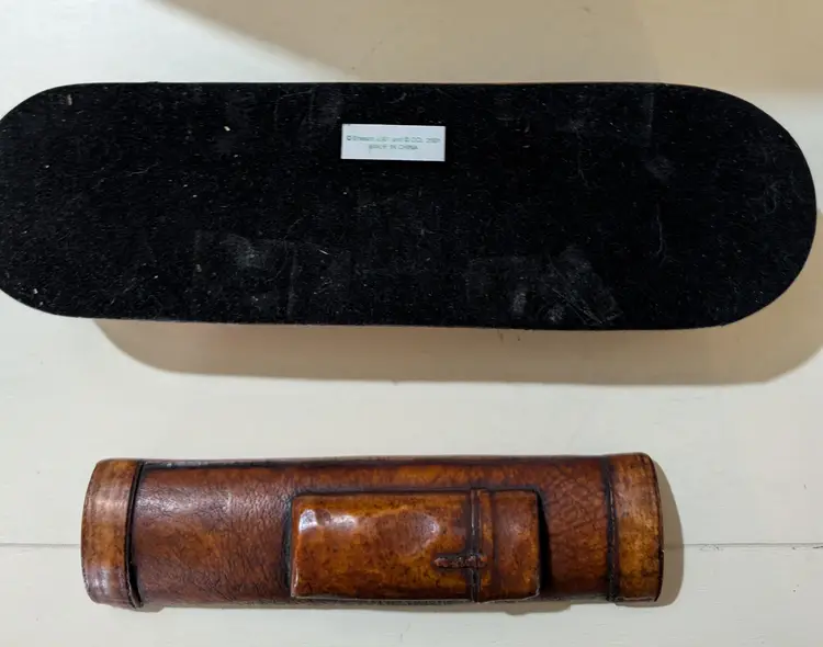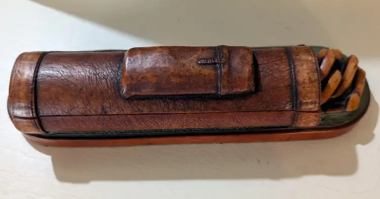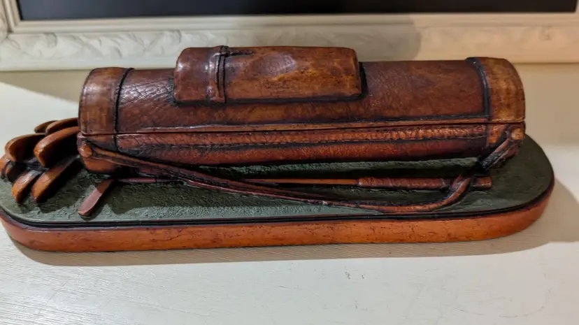 Unique vintage Enesco resin desk organizer designed to resemble a leather Golf bag. This piece features intricate detailing and a rustic charm, perfect for adding a touch of character to your workspace. The organizer is in great condition with no visible cracks or chips, making it both functional and decorative. Measures approximately 10 inches in length and 2 inches in width. A distinctive addition to any collection.