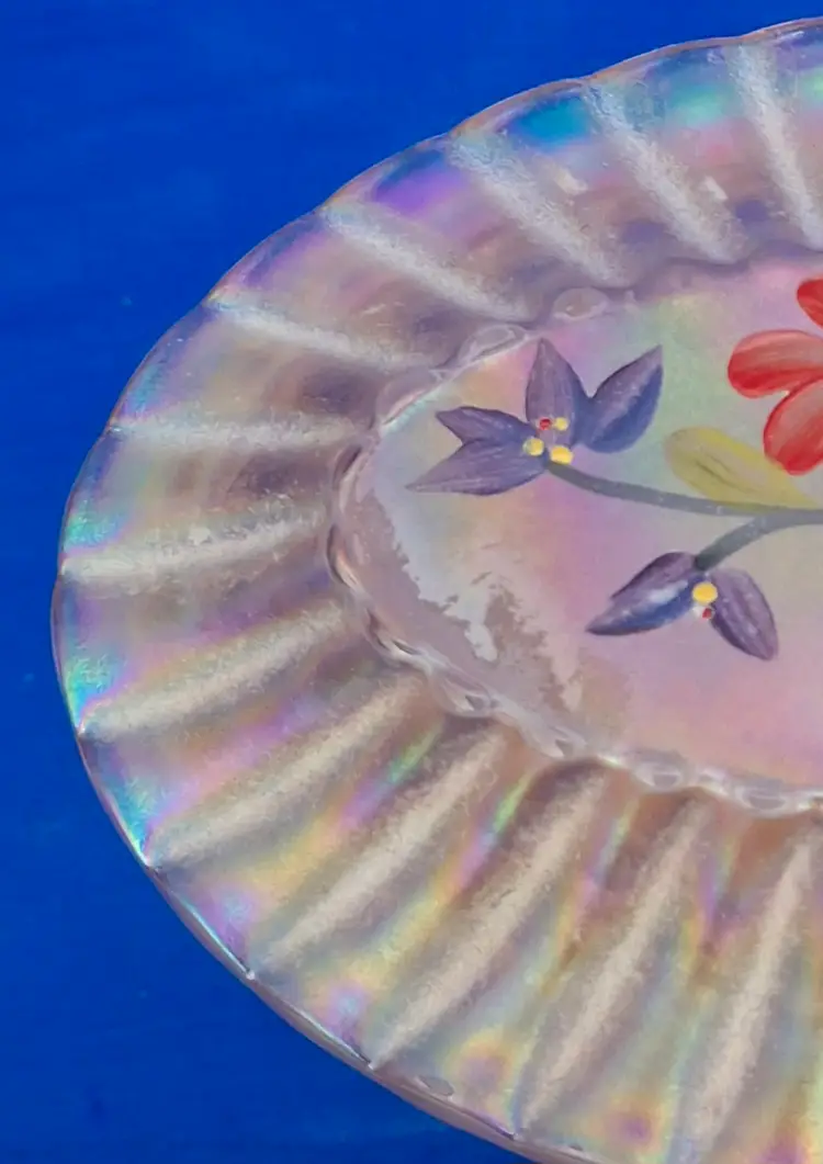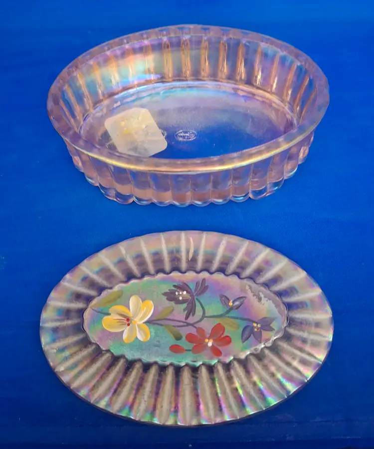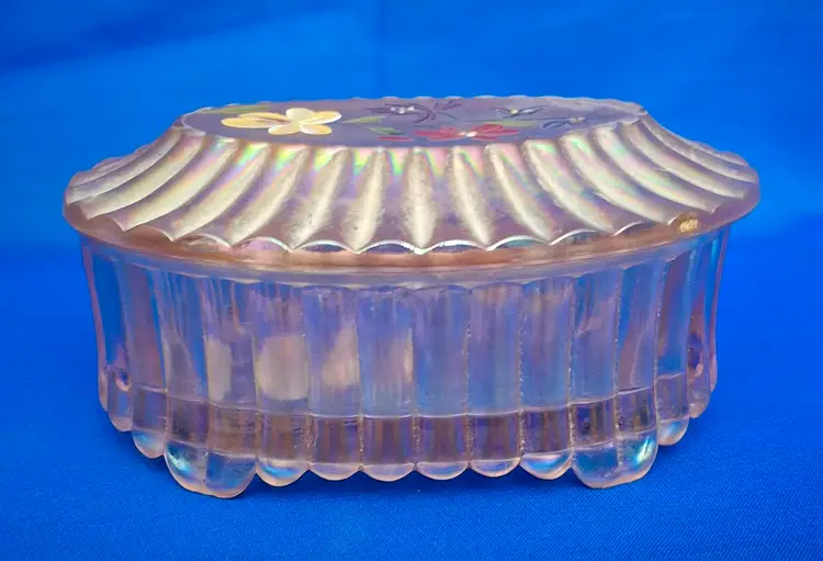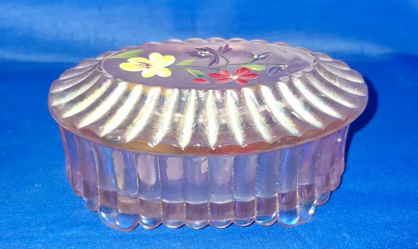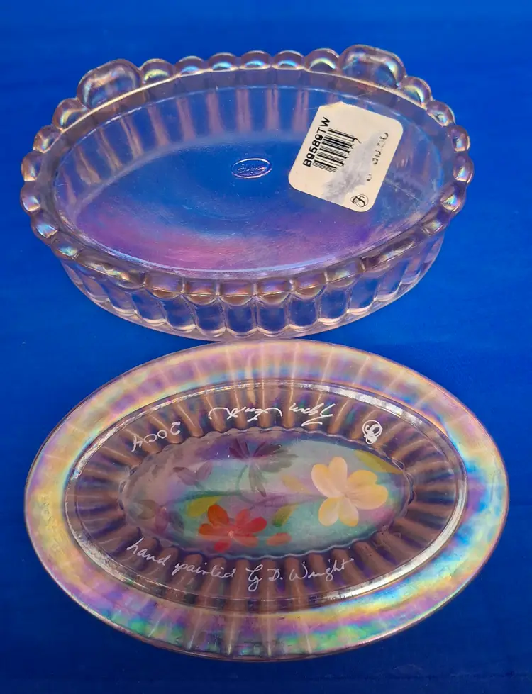 Vintage 2004 Lynn Fenton Iridescent Pink Glass Trinket Box is 4 1/8" long x 2 3/4" wide x 2 1/4" tall. This beautiful pink jar features a paneled design and hand-painted flowers by D. Wright. A great size for trinkets and jewelry. Fenton oval mark. Slight wear to the iridescent finish on the top. No chips, cracks, or repairs. Please view the pictures and feel free to ask questions. Thank you for visiting my shop.