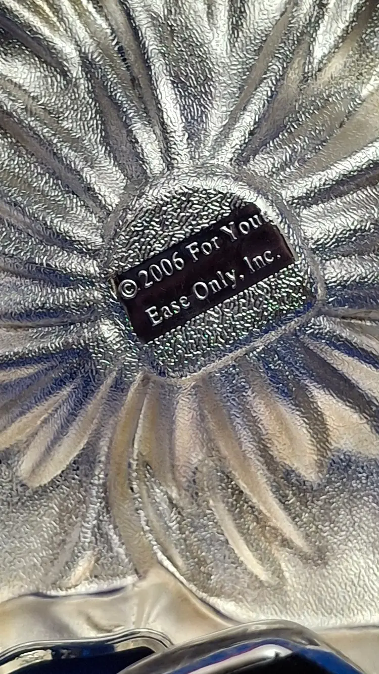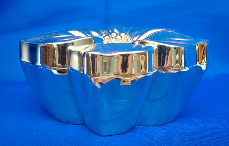 Vintage 2006 For Your Ease Only Poinsettia Mirrored Trinket Box is 4" wide x 2" tall. This beautiful poinsettia shaped jar has a mirrored finish and navy-blue velvet lining. A great size for trinkets and jewelry. No chips, cracks, or repairs. Please view the pictures and feel free to ask questions. Thank you for visiting my shop.