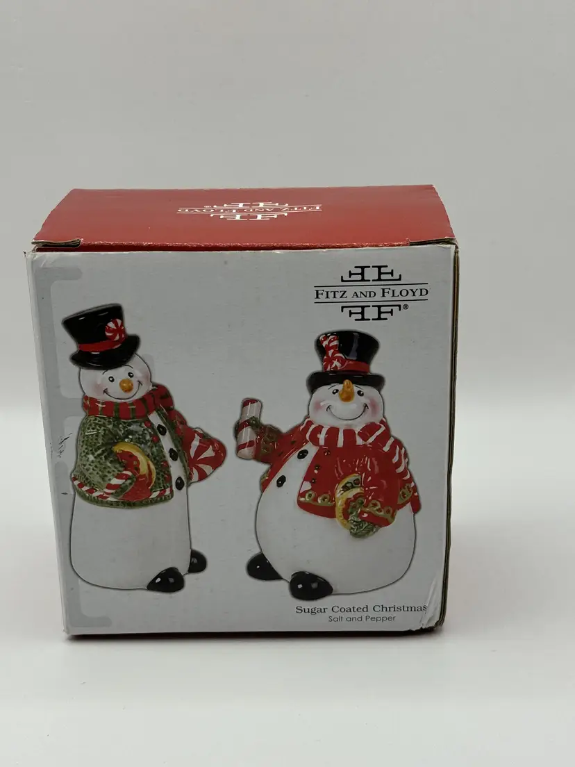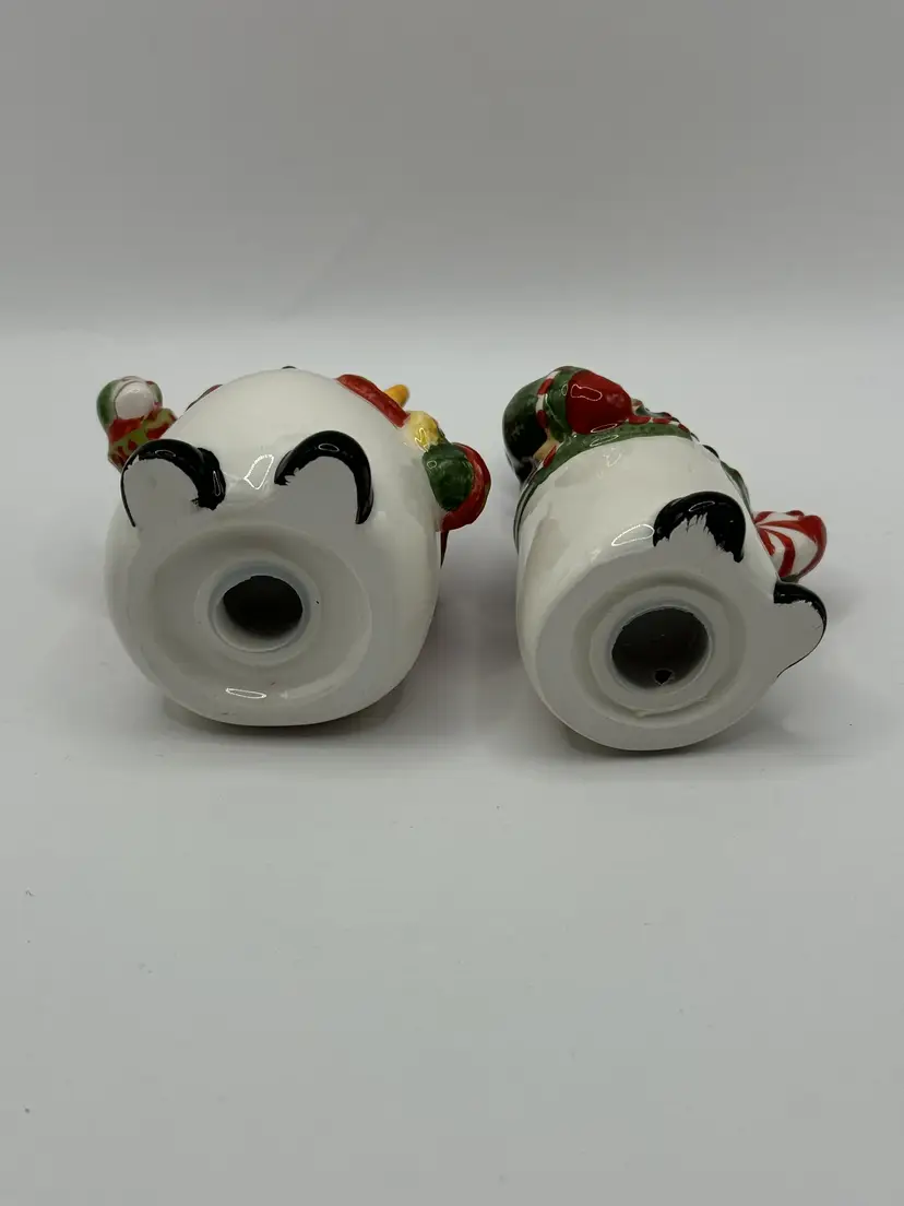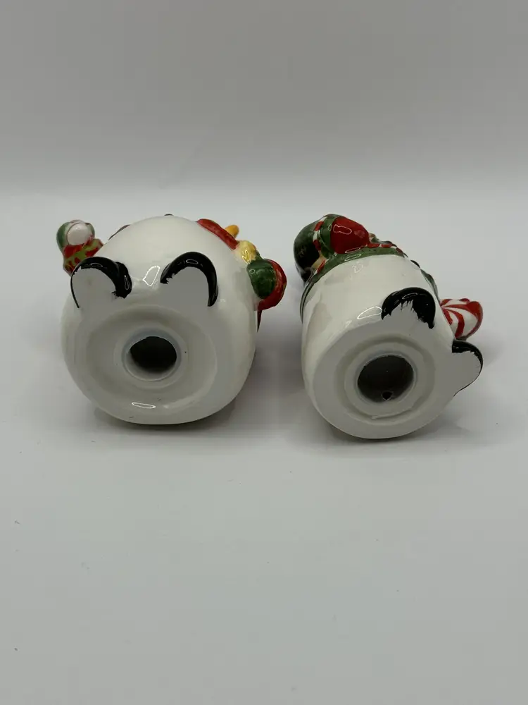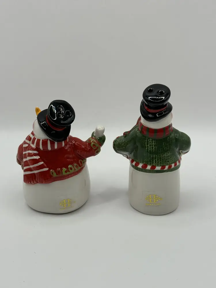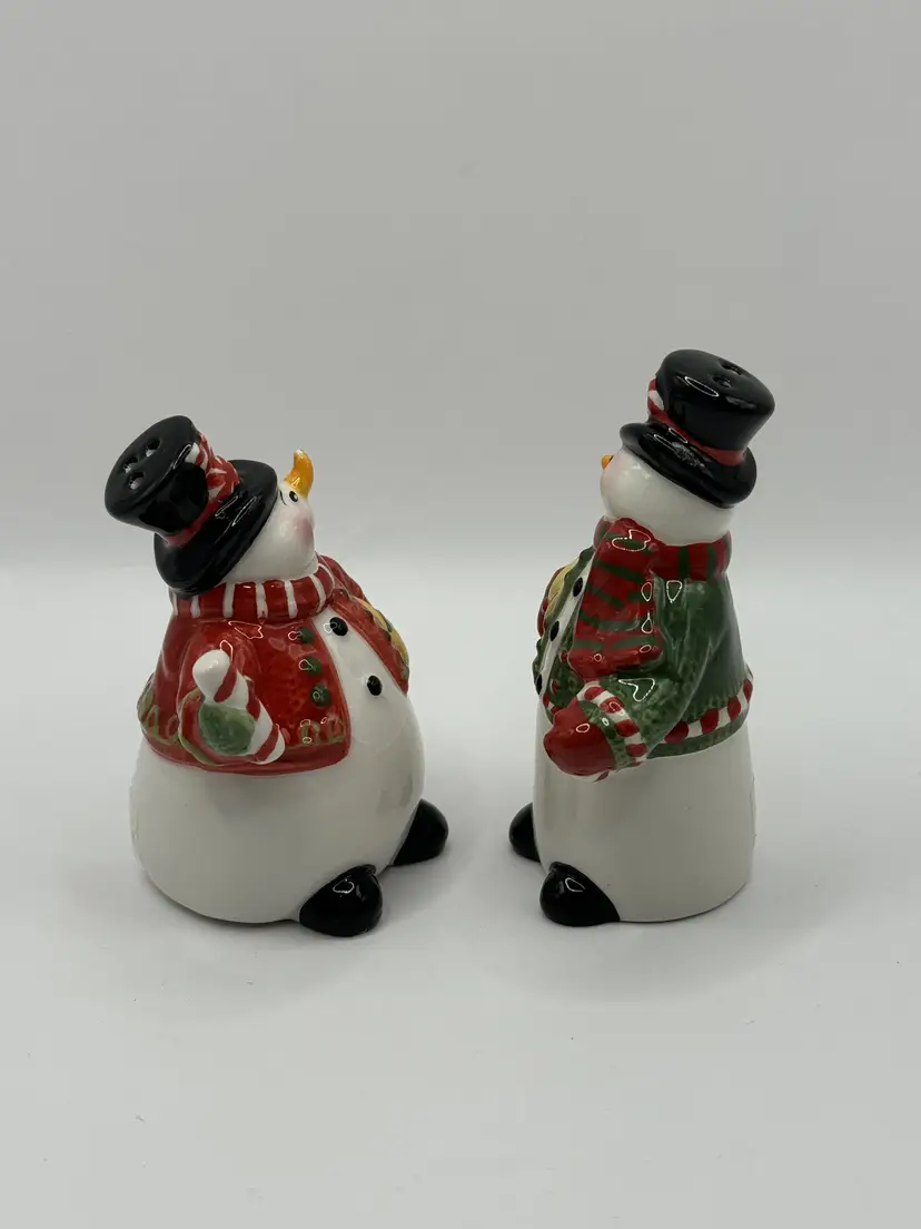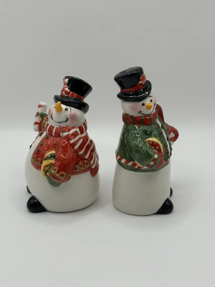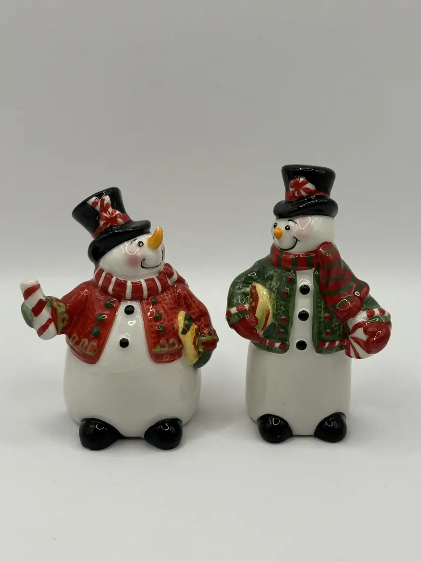 Add a touch of holiday cheer to your table with these vintage snowman salt and pepper shakers. Each snowman is dressed in festive attire, one in red and the other in green, holding holiday-themed items. Perfect for collectors or as a charming addition to your Christmas decor. Excellent condition never used with no chips or cracks. Measures 2x3x2 (red sweater), 2.25x3.25x1.75 (green sweater) inches. Weighs 8oz.