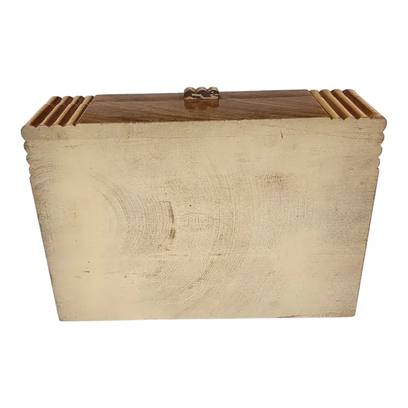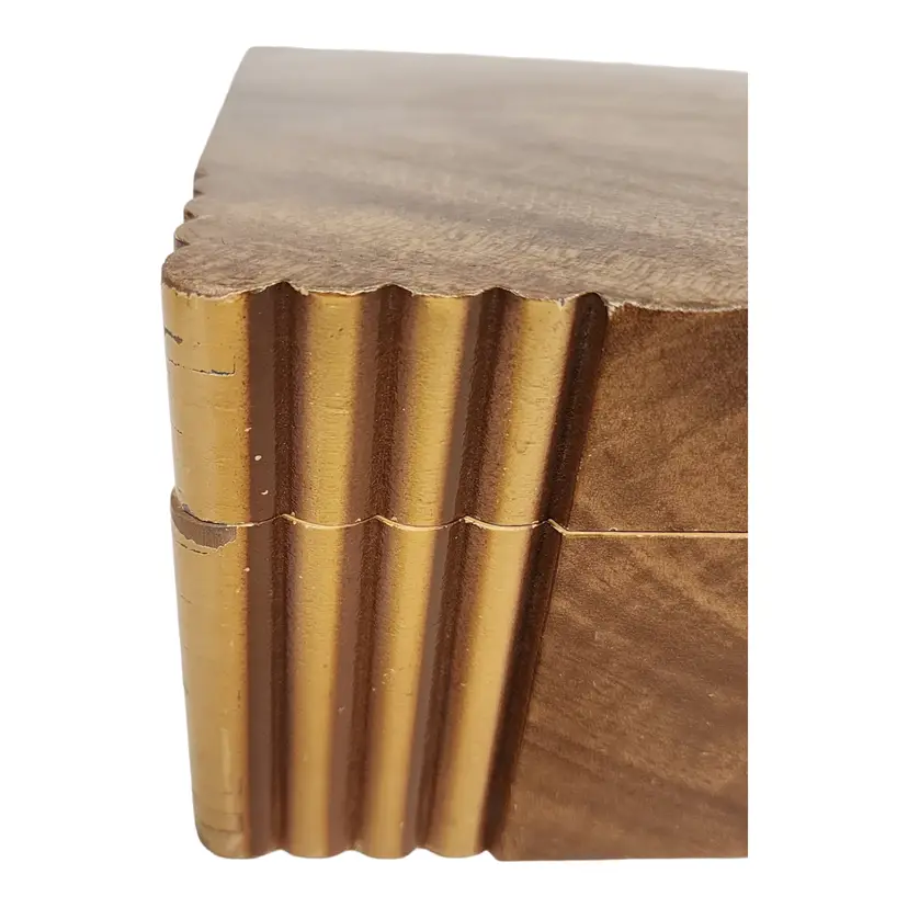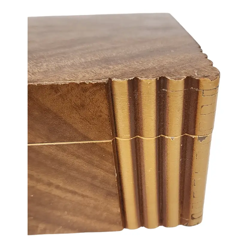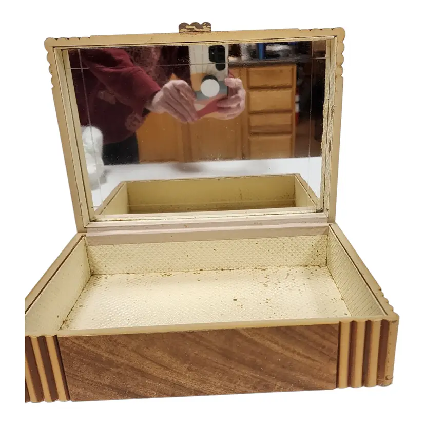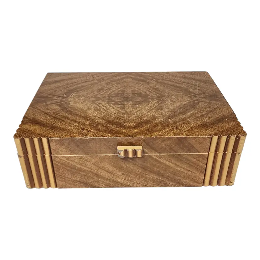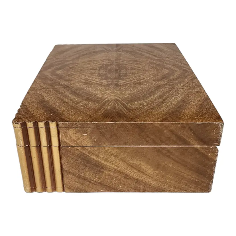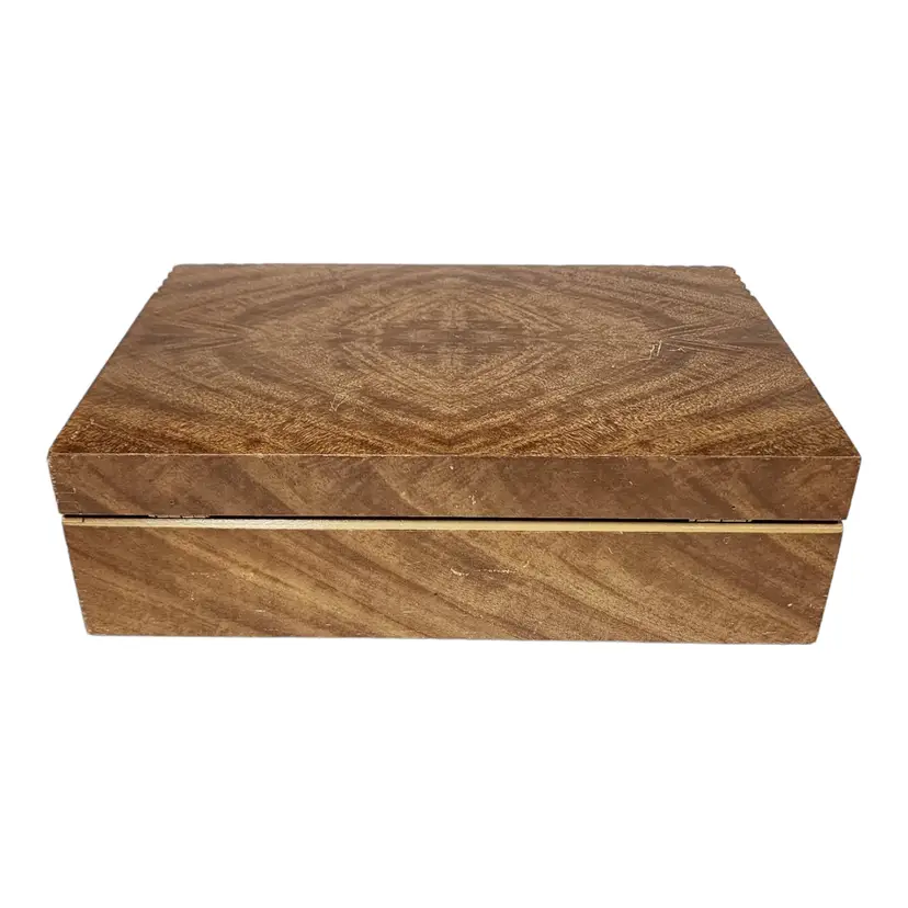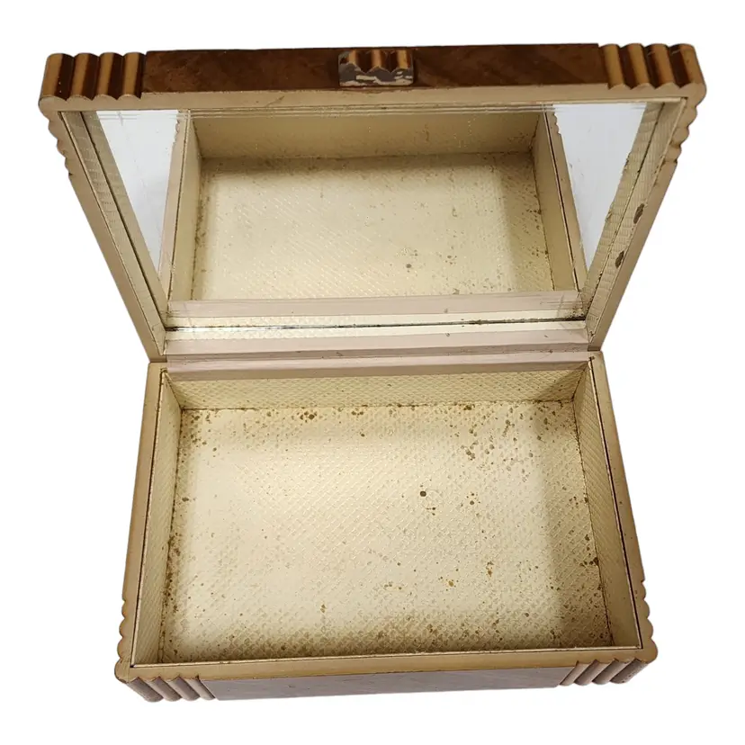 Add a touch of vintage charm to your jewelry collection with this 1920s Pilliod Wood Keepsake Jewelry Box. Adorned with Art Deco details, this rectangular box comes in a rich brown color and features a convenient mirror for quick touch-ups. Measuring 12"x8.5", this box is suitable for storing all your favorite pieces, including necklaces, bracelets, anklets, rings, cufflinks, earrings, and body jewelry. Crafted from wood and designed with a touch of nostalgia, this jewelry box is the perfect storage solution for your precious belongings. With an elegant design that exudes timeless beauty, it's sure to be a cherished addition to your collection. Whether you're a collector of vintage pieces or just looking for a unique storage option, this beautiful box is sure to impress