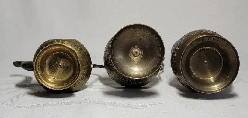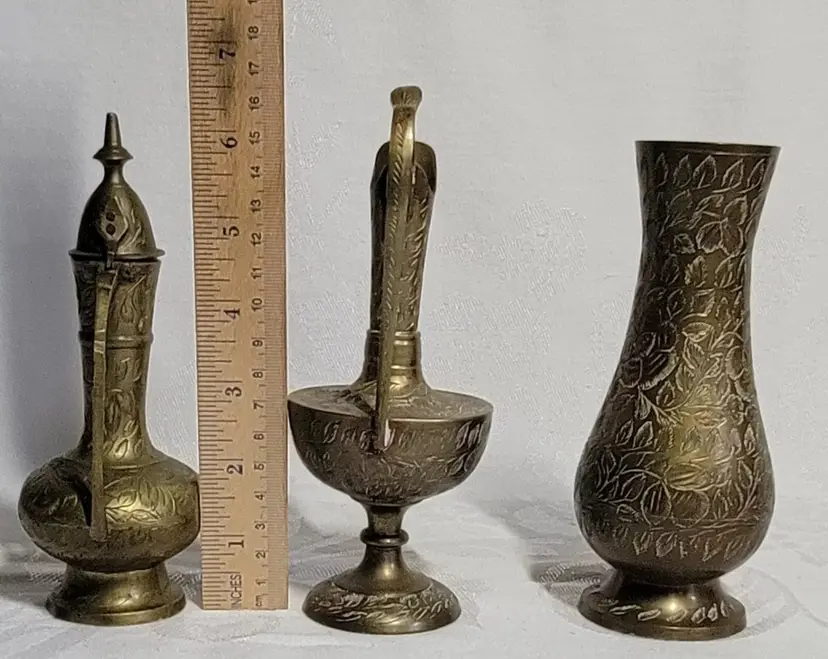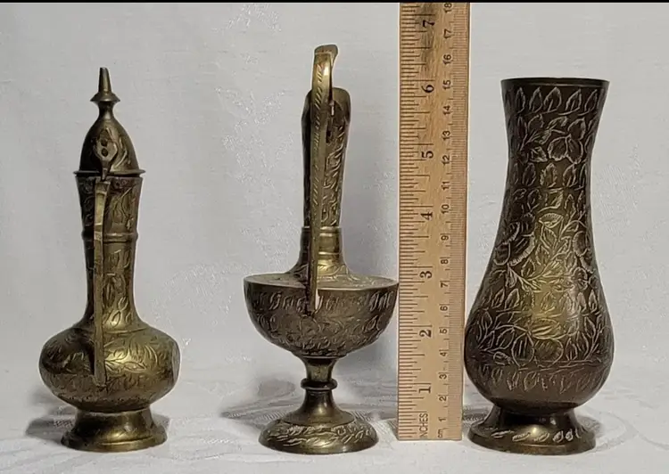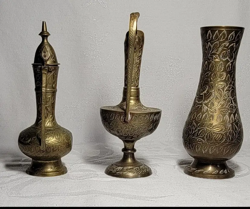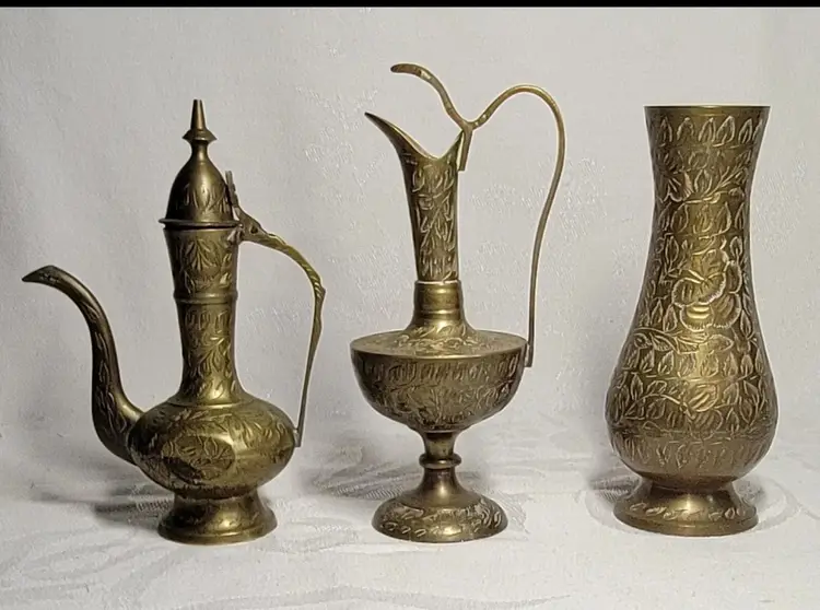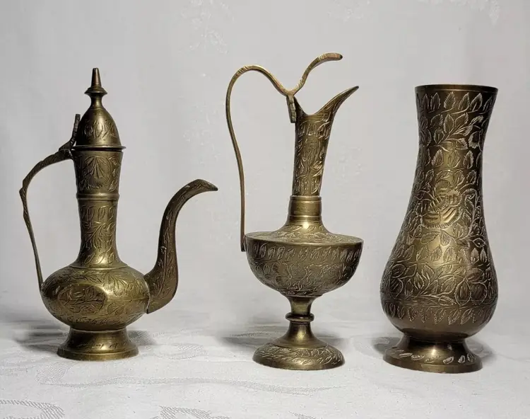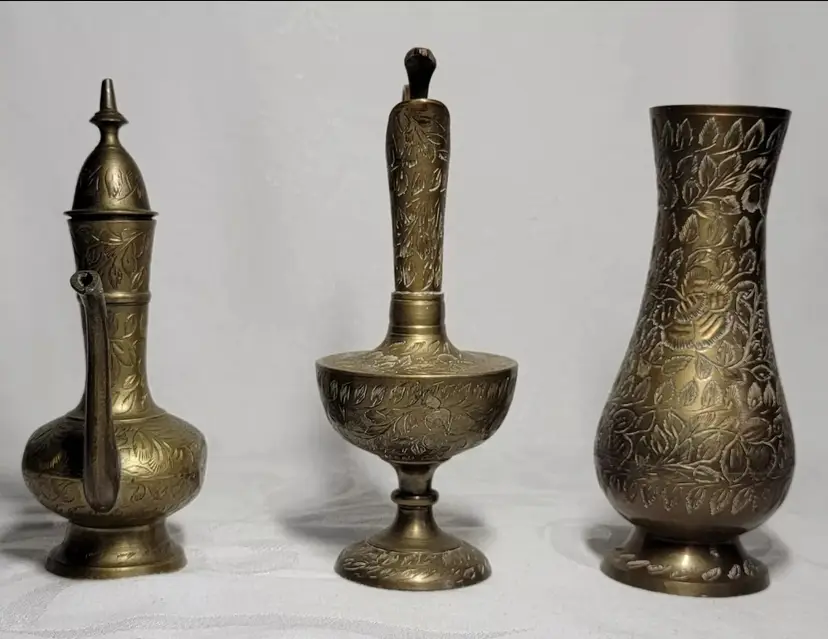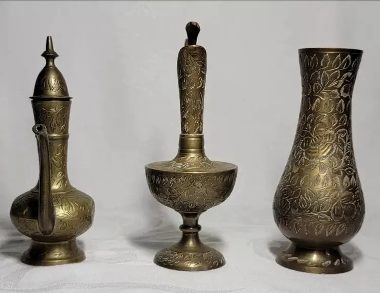 Add a touch of vintage charm to your collection with this set of three etched brass pieces from India. Crafted with intricate designs, this set includes an ewer, vase, and aftaba pitcher. The brass material gives a durable and timeless appeal to these pieces, making them a great addition to any collection. The design and manufacturing of these pieces reflect the rich cultural heritage of India, making them a unique and valuable addition to your collection. Whether you are a collector or just looking for a unique decorative item, this set is sure to impress.