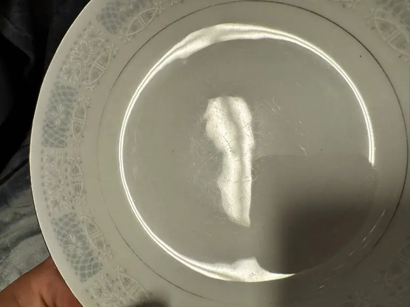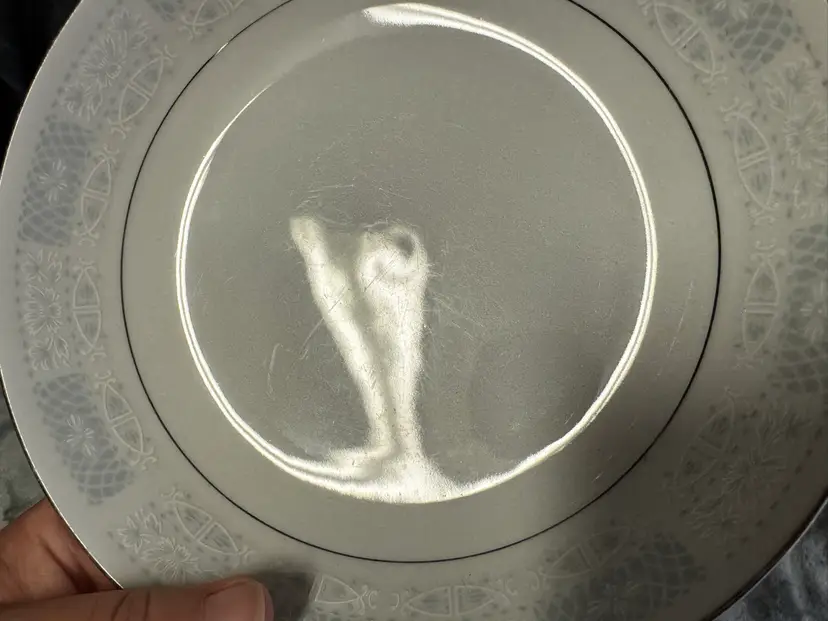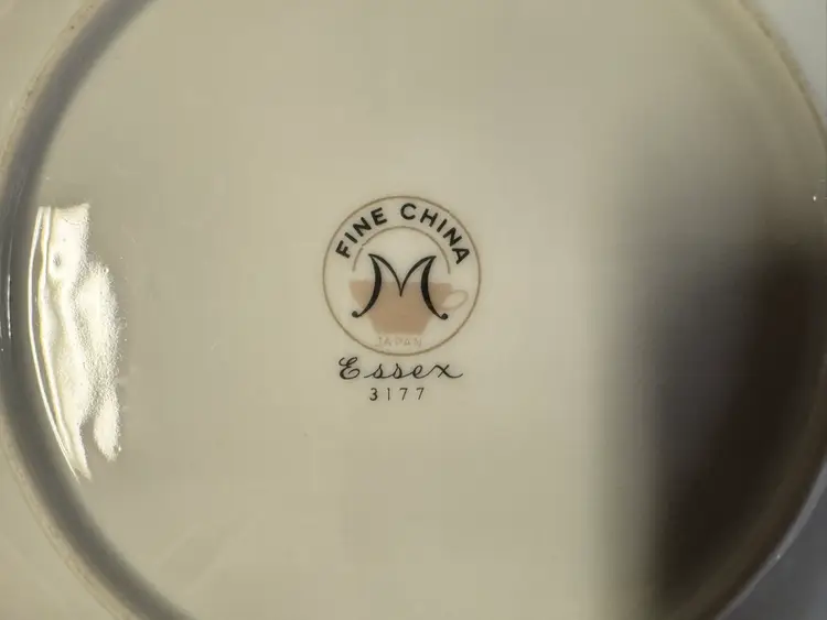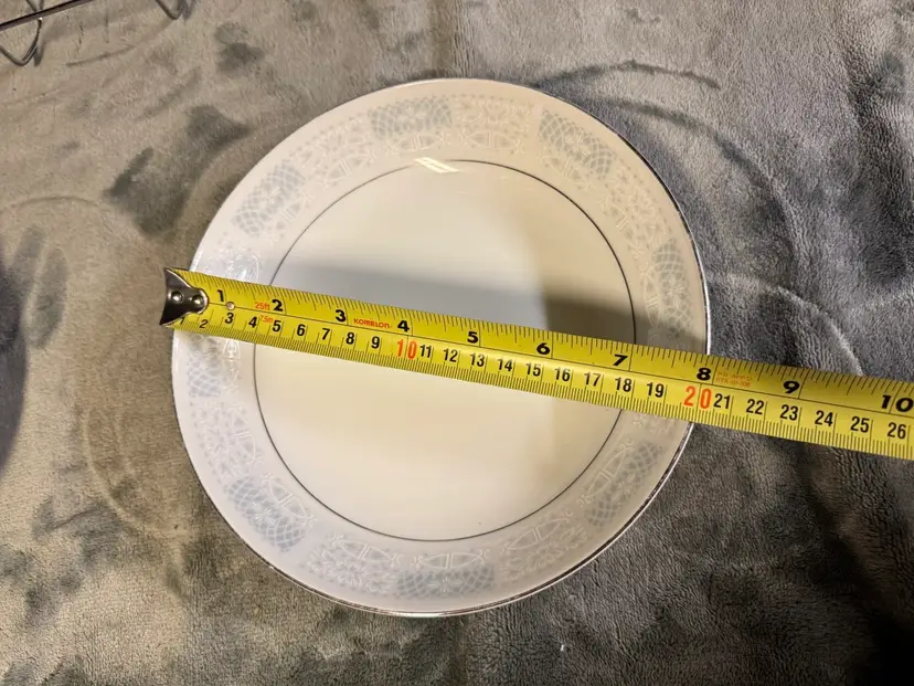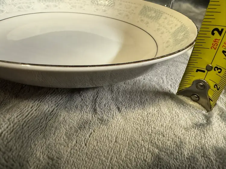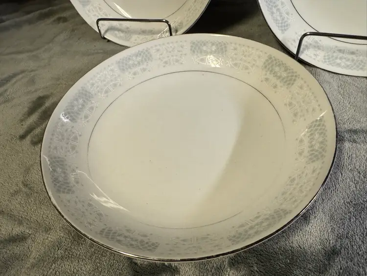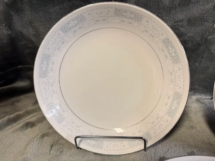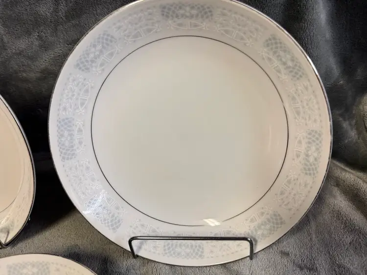This product is a set of three vintage fine china salad plates from Japan, featuring a white color, silver detailing, and a flower/scroll pattern. Made of porcelain, these round plates have a diameter of 8 inches and are perfect for all occasions. The decorative plates are from the 1970s and have a glossy finish, adding a touch of elegance to your dining table. The hand wash only care instructions ensure the longevity of these original, printed backstamp plates. Good condition. No chips, cracks, or crazing. There is some wear to the silver detailing and some mild utensil scratching from use (see photos for condition).
