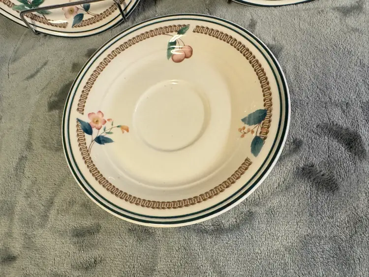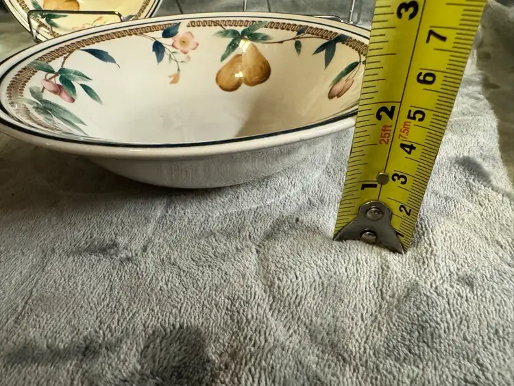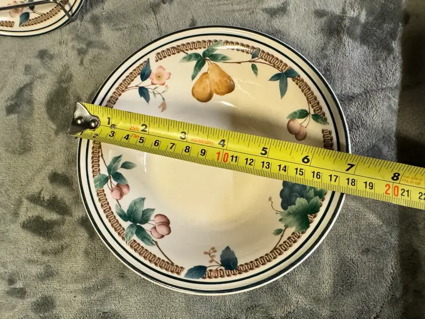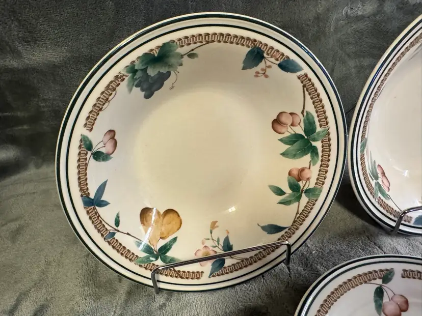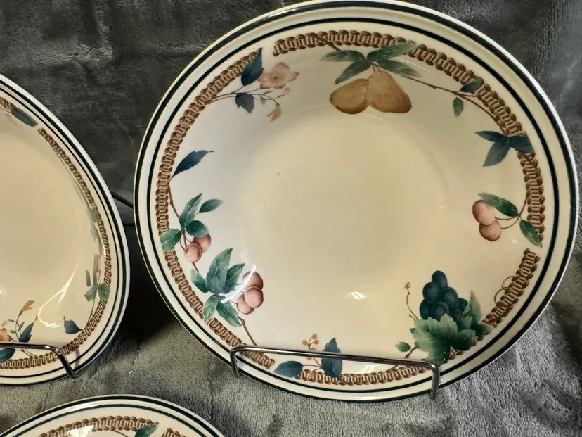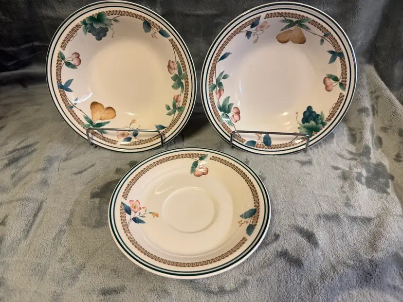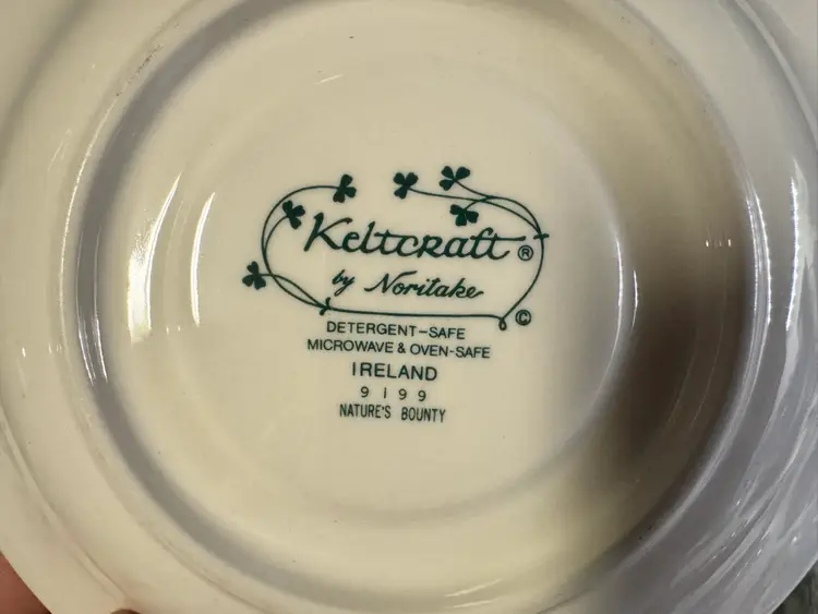 This vintage Noritake Keltcraft Ireland Natures Bounty cereal bowl set features a beautiful green color and a fruit-themed design, perfect for adding a touch of whimsy to your breakfast table. Made of porcelain, these round bowls have a diameter of 7 inches and a depth of 2 inches. The set includes 2 bowls and 1 saucer, all bearing the original Noritake Ireland Natures Bounty 9199 pattern and print. The saucer measures 6.25” in diameter. With a glossy finish and vintage appeal, this Keltcraft collection piece is sure to delight collectors and nature enthusiasts alike. Excellent condition. No chips, cracks, scratches, or crazing.