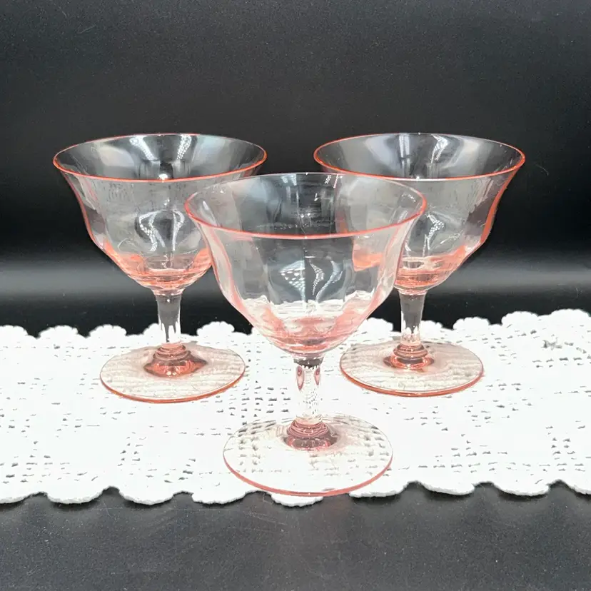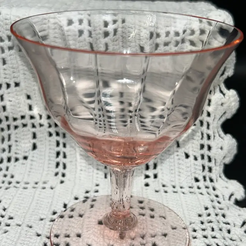 1930’s pastel pink, optic depression stemware. 4 1/8” tall, 3.5” diameter top, 2 3/4” diameter stem, stem is approximately 1” tall. Excellent condition. No chips or cracks. Great sparkle.