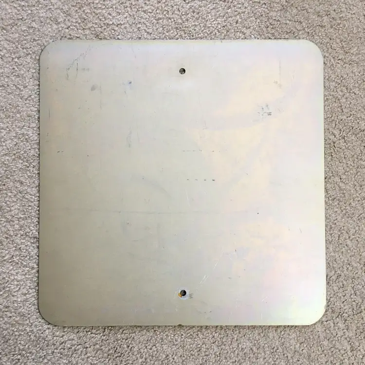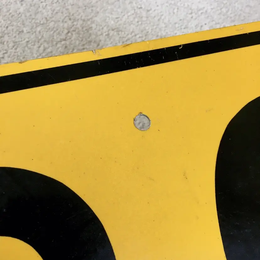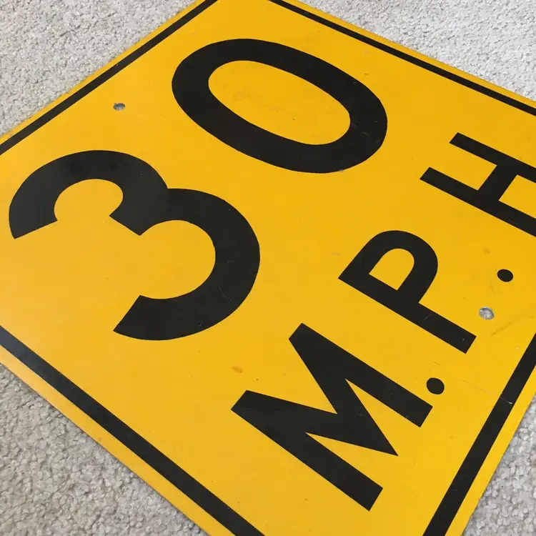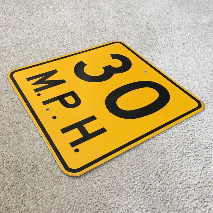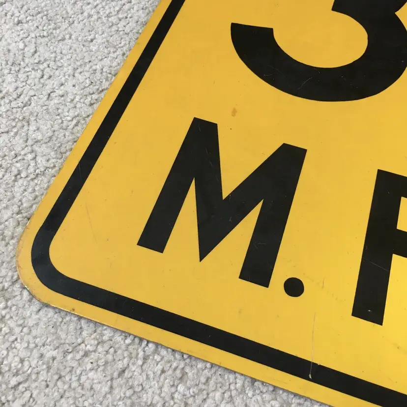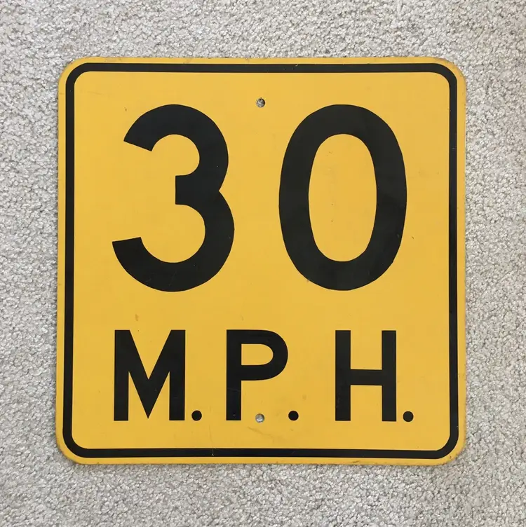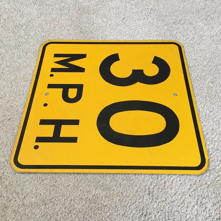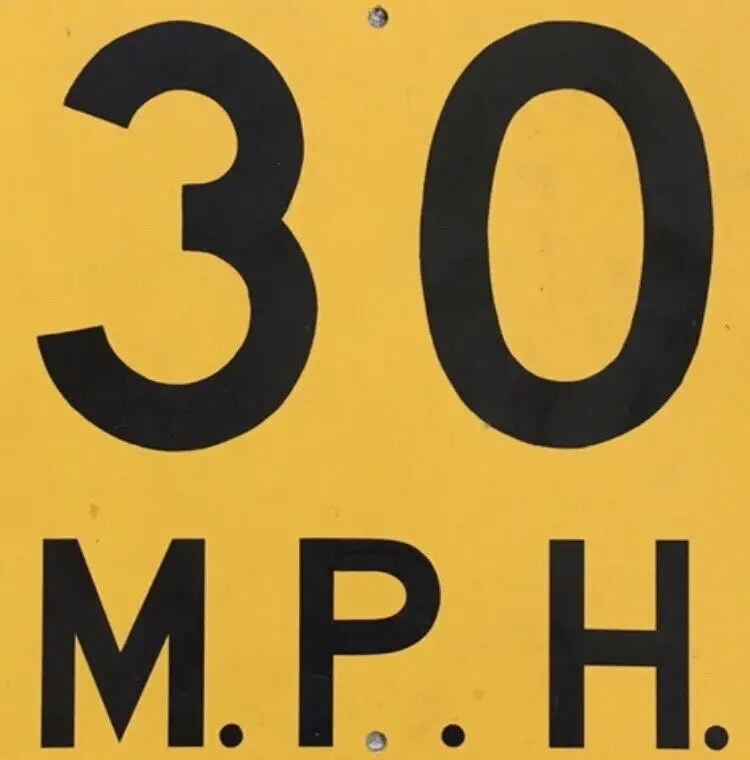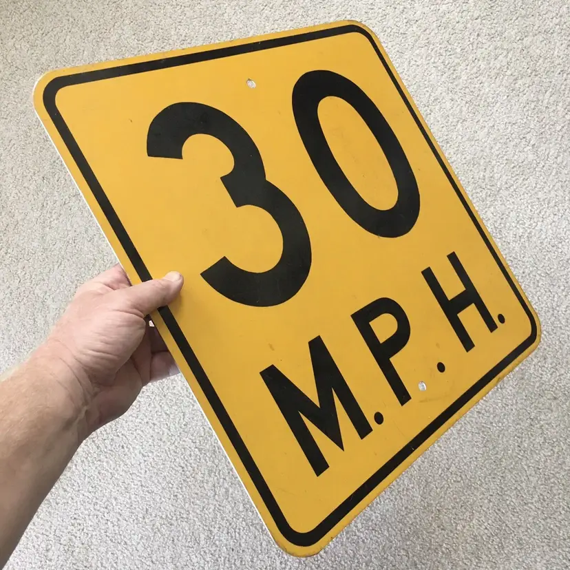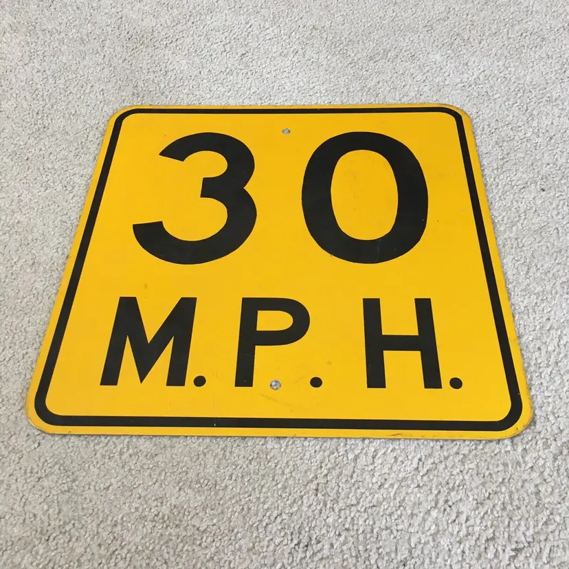 Vintage 30 M.P.H. speed limit aluminum road sign. Very nice item for your gas and oil automobilia collection as this is the older non-reflective version. Mounting holes top and bottom for easy wall hanging. Black lettering and border are all paint and not the later tape versions. Very good condition with no dents. Light wear from age and use. Display Beautifully!! Measures about 18” x 18”. See pics for more details.