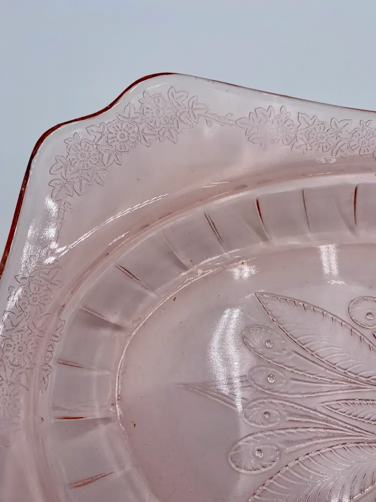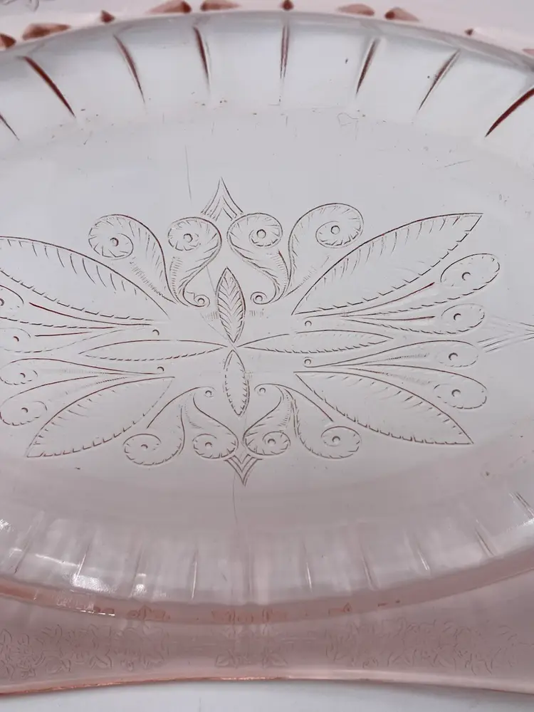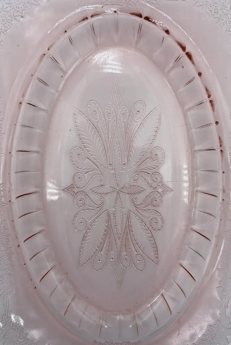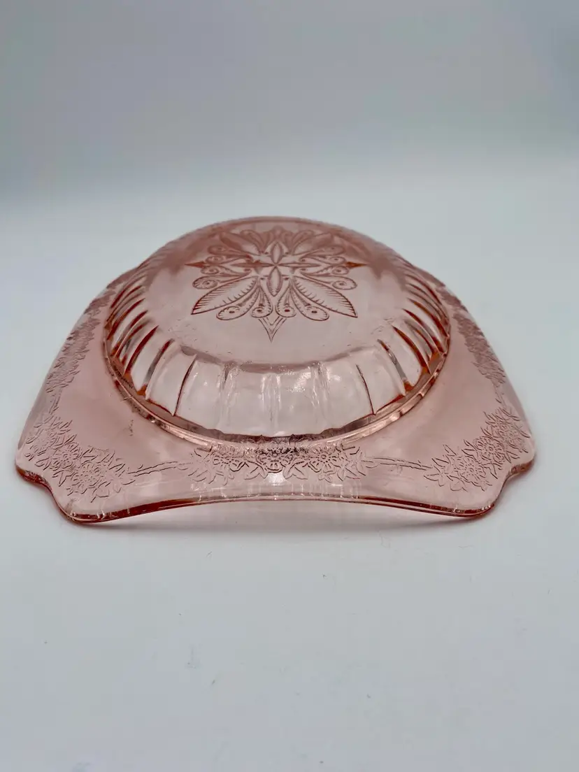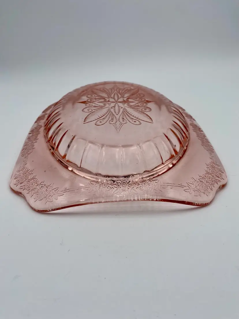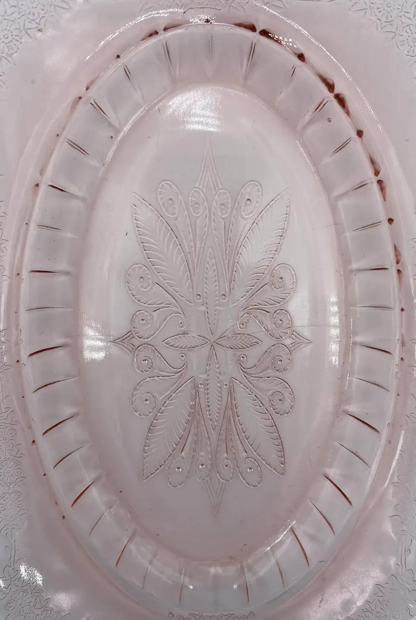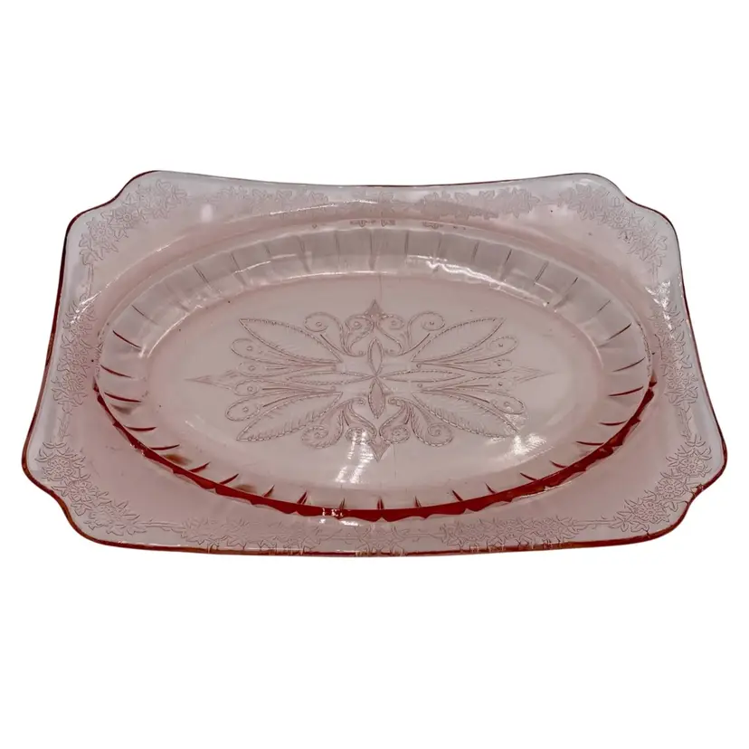 This vintage Jeannette Glass Company Depression Glass Serving Dish in pink features the "Adam" design, showcasing an embossed pattern on the base and sides along with sculpted sides. Made in Jeannette, Pennsylvania, from 1932-1934, this rectangular bowl is a handmade piece from the Great Depression era. Made of pressed glass, this serving bowl weighs 1 pound and 12.2 ounces. It is 11.5” long and 7.6” wide.