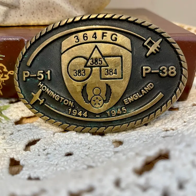 Good vintage condition Solid brass has some patina Dated 1992 364 Fighter Group 1944/1945 WWII 383 384 385 P-51 P-38 Honingtin, England Made in USA 2.25”x 3.5” 0000225